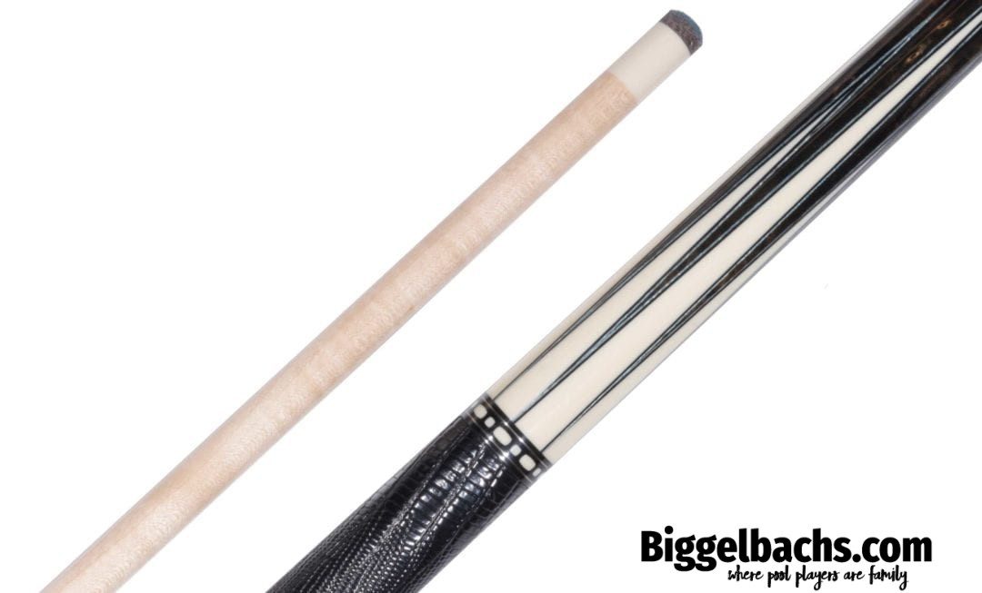 This AE custom cue is a stunning, jaw dropper!! Even great pictures don’t do this cue justice! Buckeye burl plays the backdrop for SIXTEEN white high-low alternating points with elegantly understated black/gray complimenting veneers. With ring work and a classy black leather wrap, this one is going to make the other cues in your collection jealous.