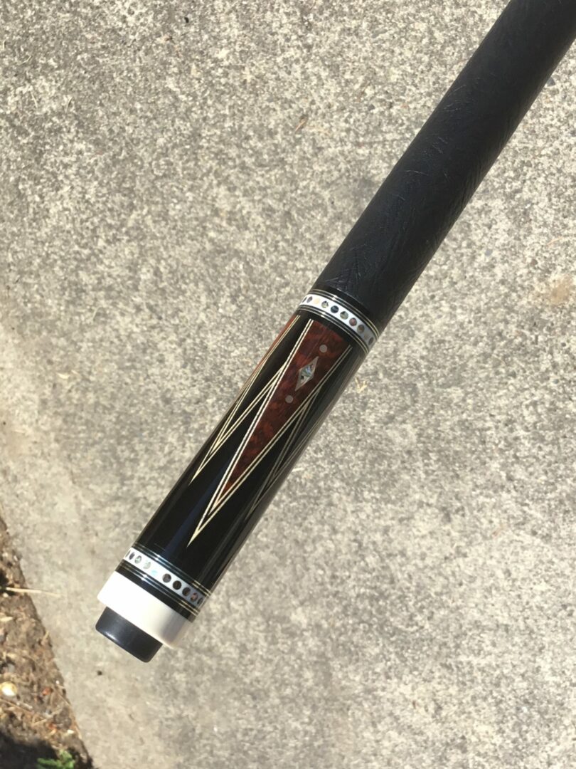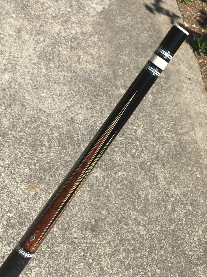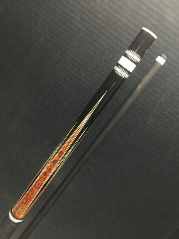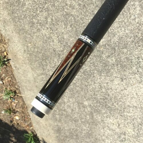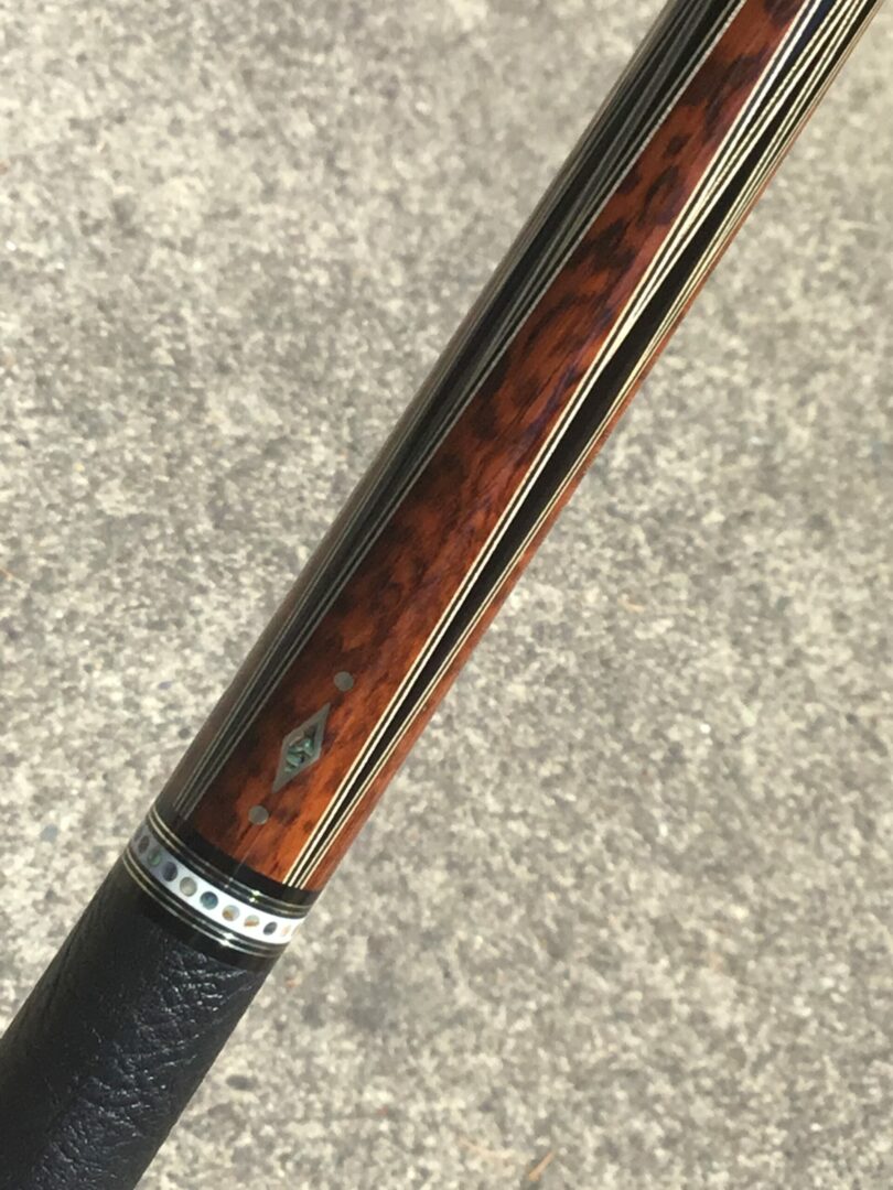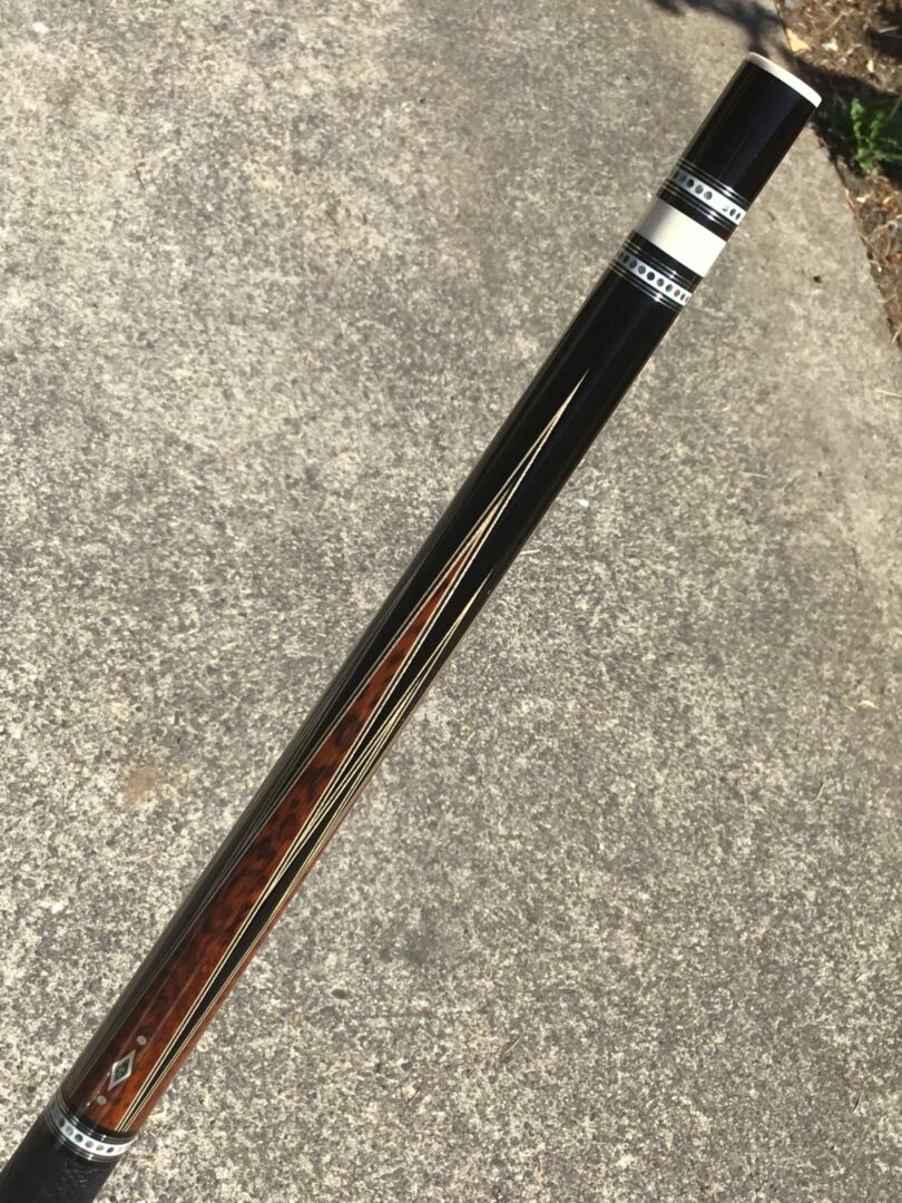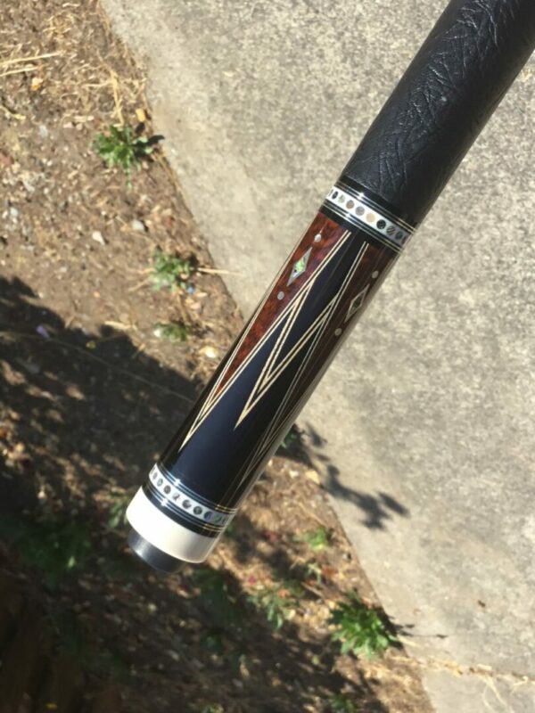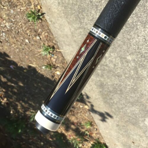 Here we have an incredibly amazing Ariel Carmeli cue with Ed Prewitt tribute ringwork. This is one loaded and sexy piece of work with high-low snakewood points in ebony complimented by beautiful abalone inlays. This cue does NOT disappoint in any way!!