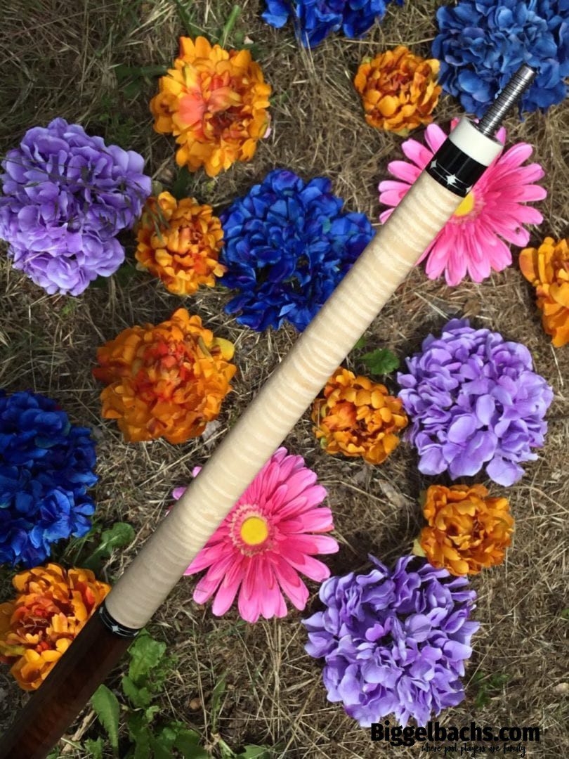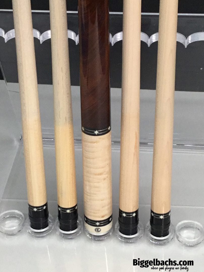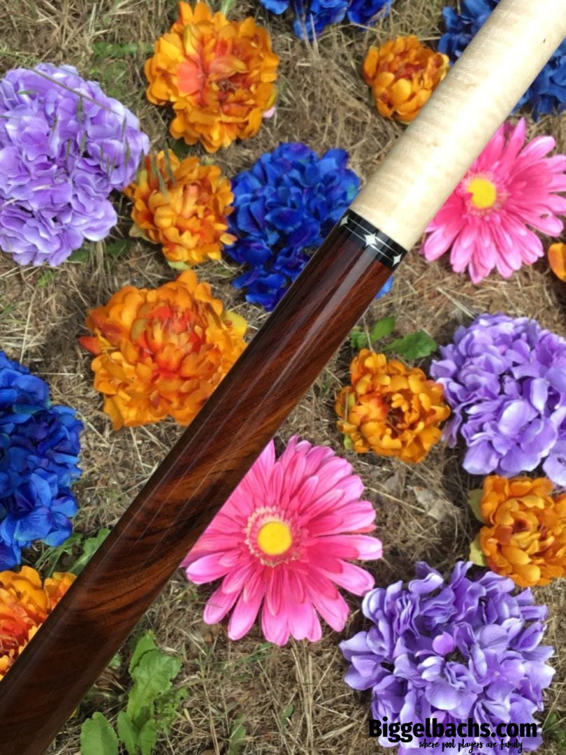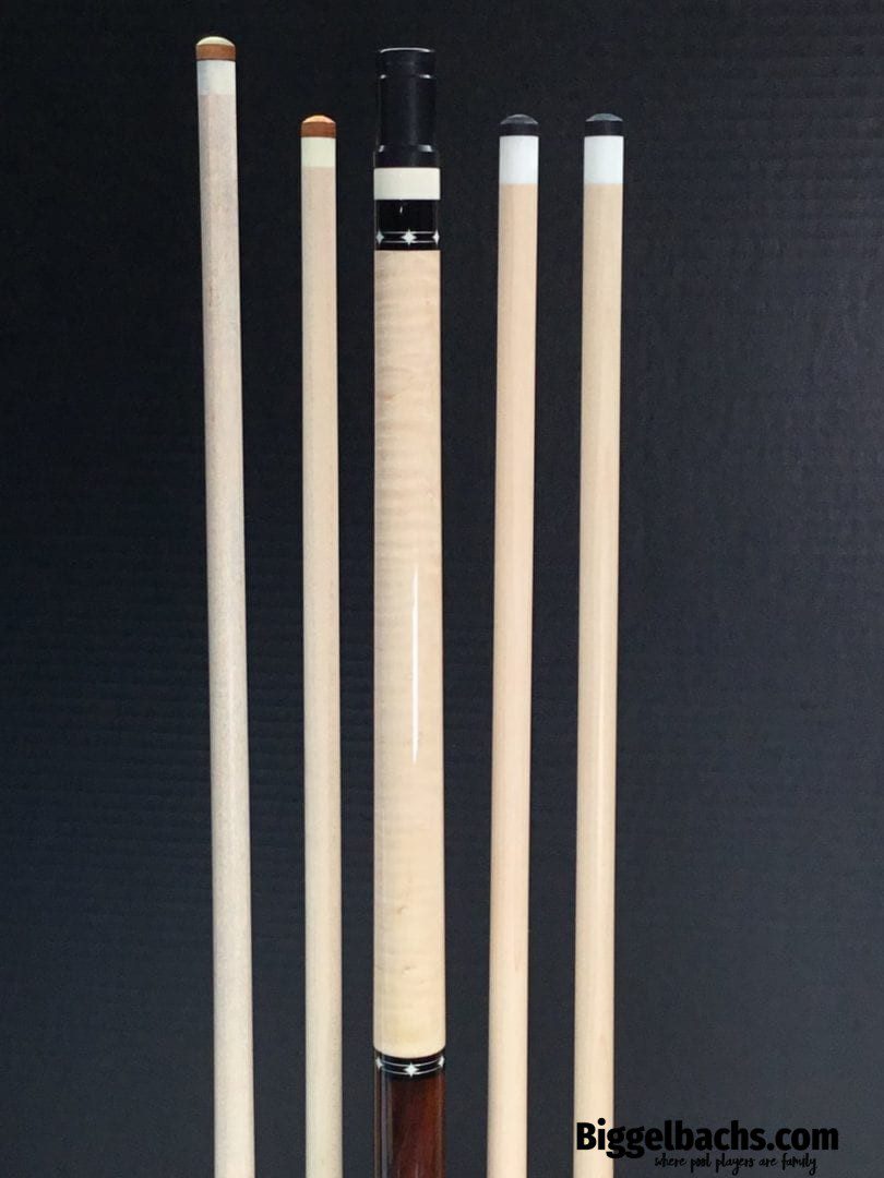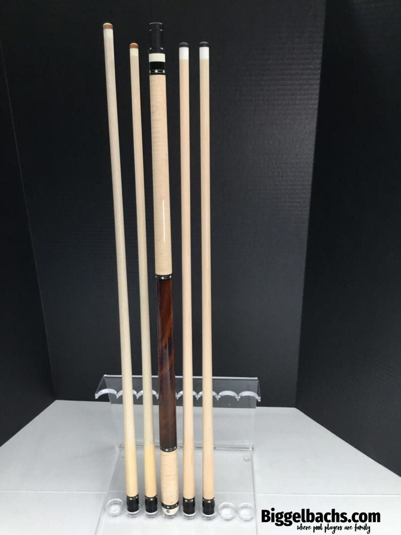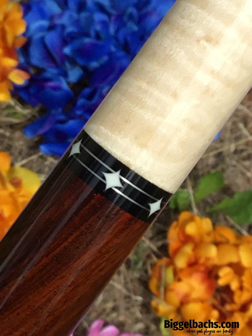 Ariel Carmeli merry widow with figured maple forearm and butt and one of the most gorgeous pieces of wood you have ever seen used in handle of cue. This beauty comes with three shafts, a 29″ unplayed original, and two lightly played predator shafts, a 29″ Z shaft, and a 30″ 314 all with matching ring work. This cue plays phenomenal, one of the best hitting cues I have played with in a while.