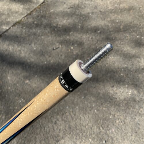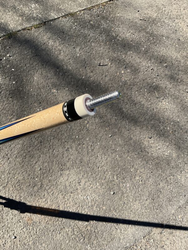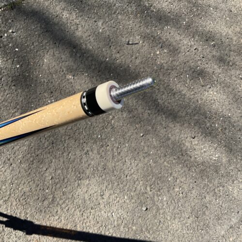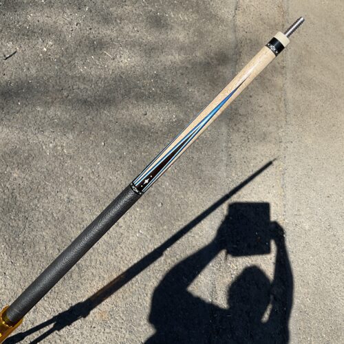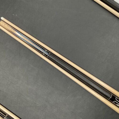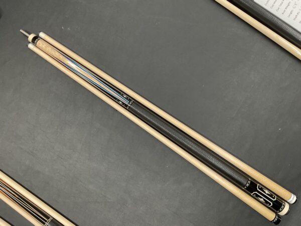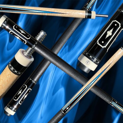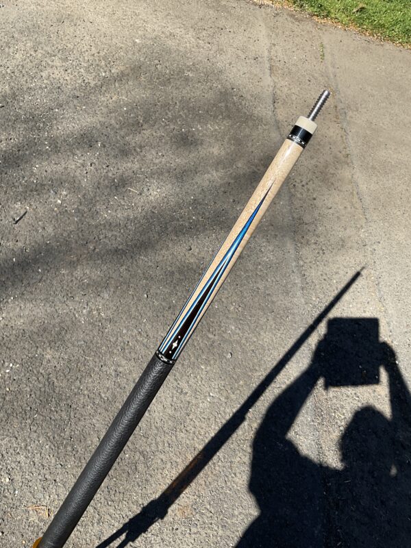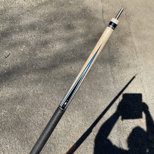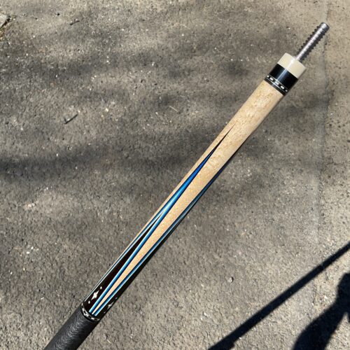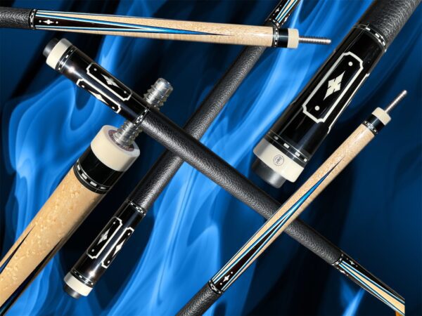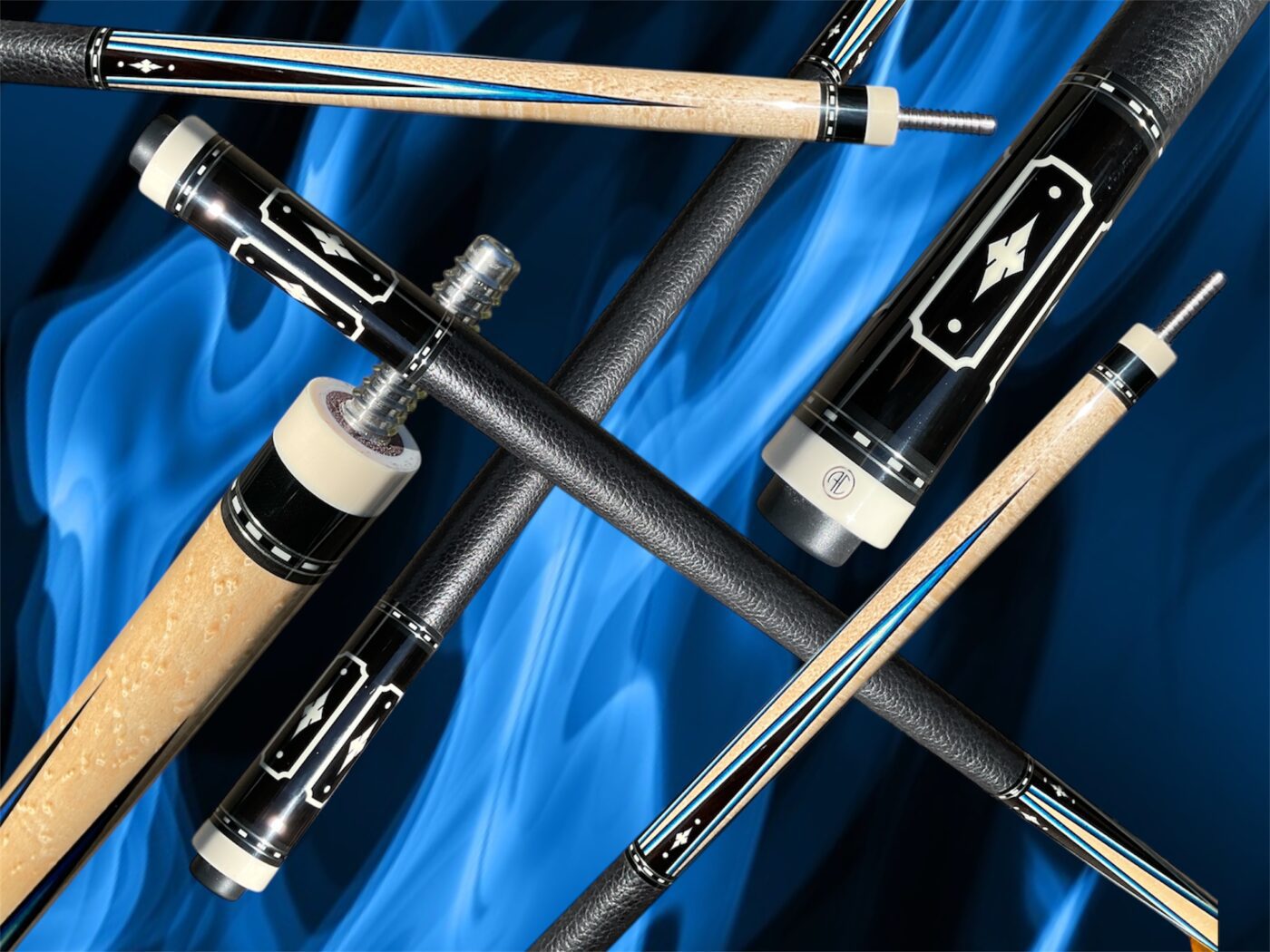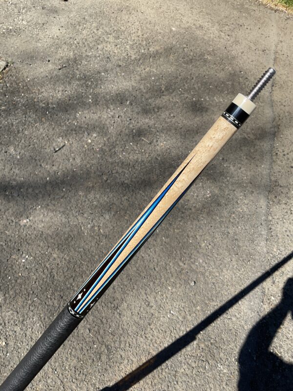 This brand new unplayed 4 point cue by Ariel Carmeli is just gorgeous. It features dark and light blue veneers inside of a maple forearm. The butt of the cue is ebony with elegant razor blade like designs.