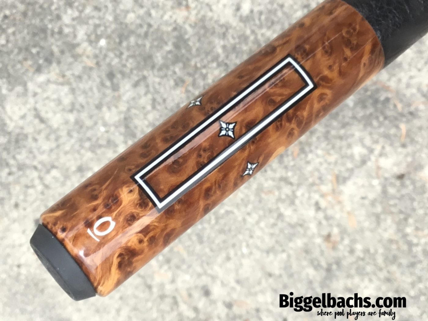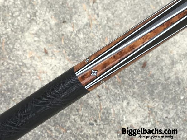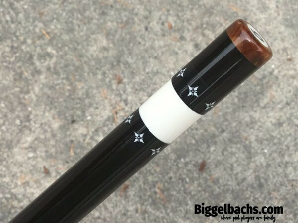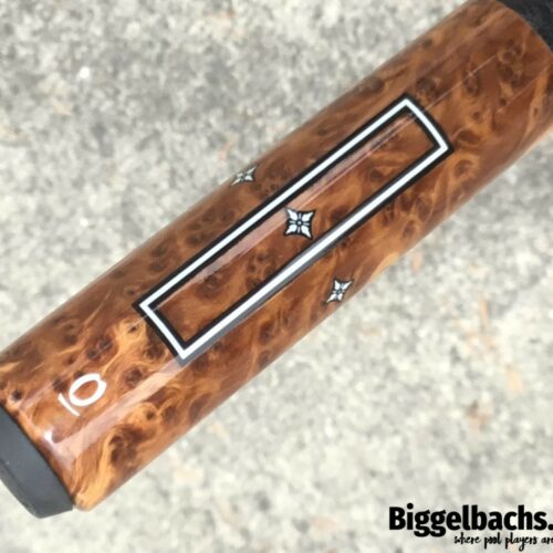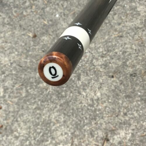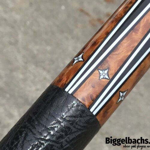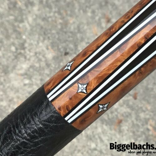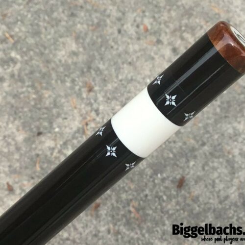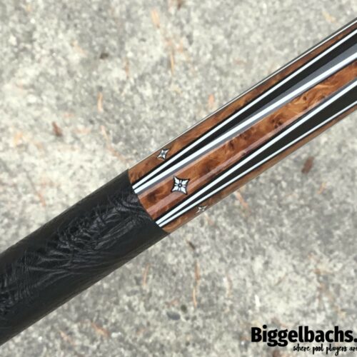 This Ebony forearm with burl points Arthur custom cue is a classy, understated jaw-dropper! Arthur This masterpiece has intricate star-flower ivory inlays and veneers and is finished off with a supple leather wrap. There are matching box windows with complimenting star-flower inlays in the matching burl butt sleeve. Absolutely stunning cue. Oh Yeah, and it comes with matching joint protectors!