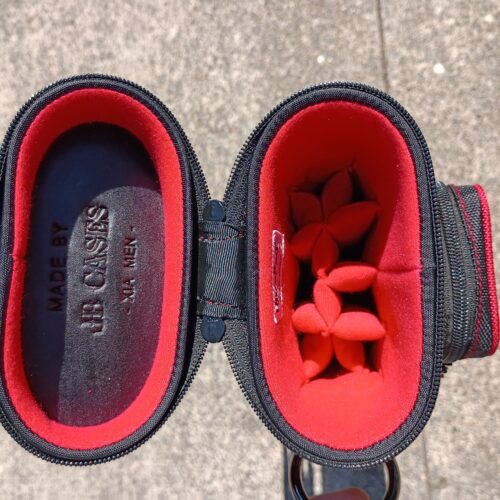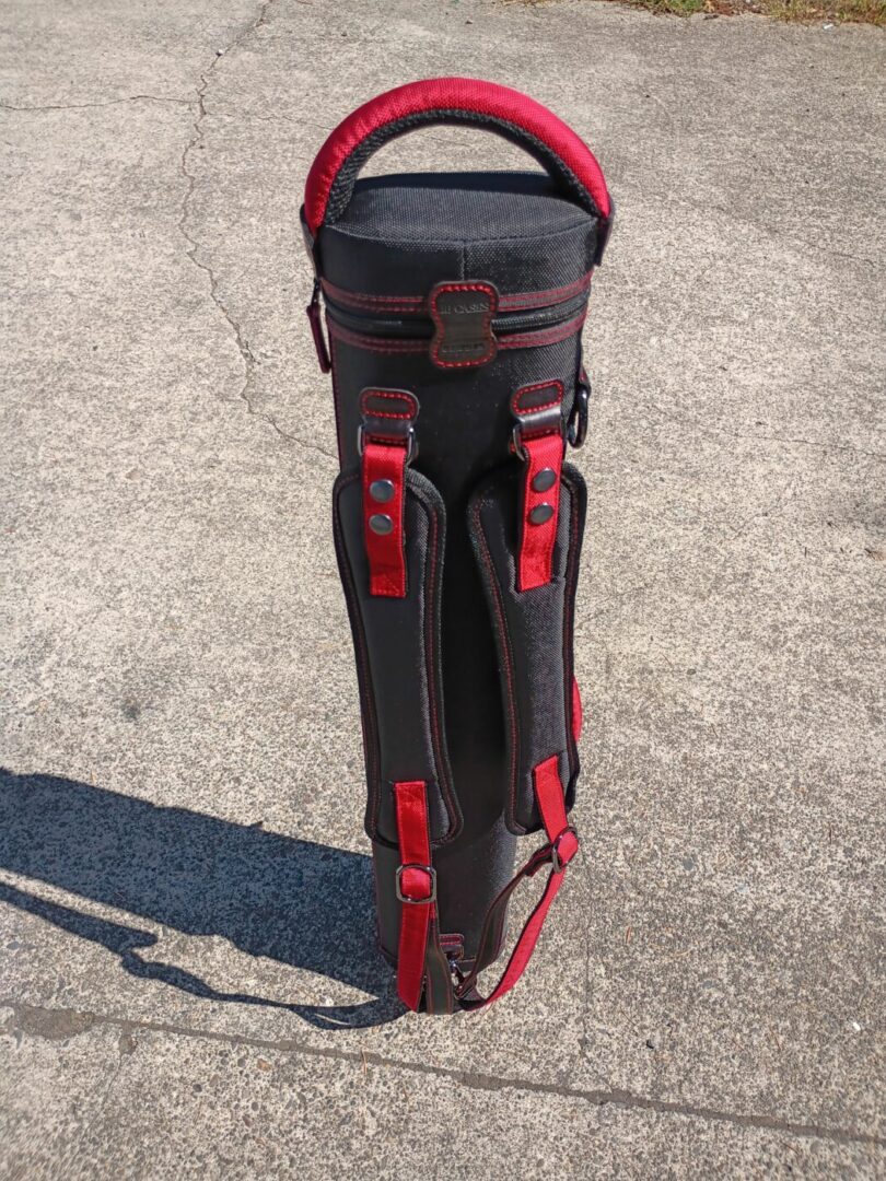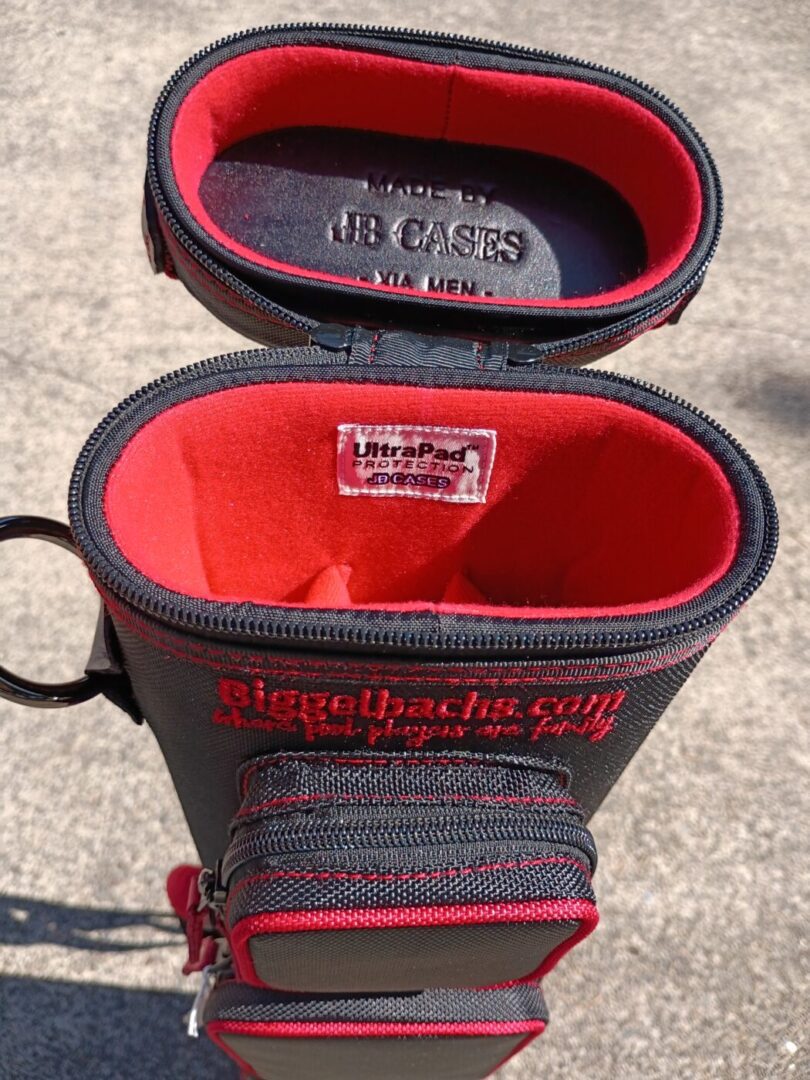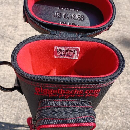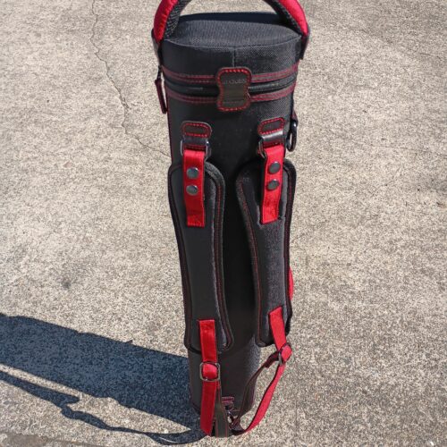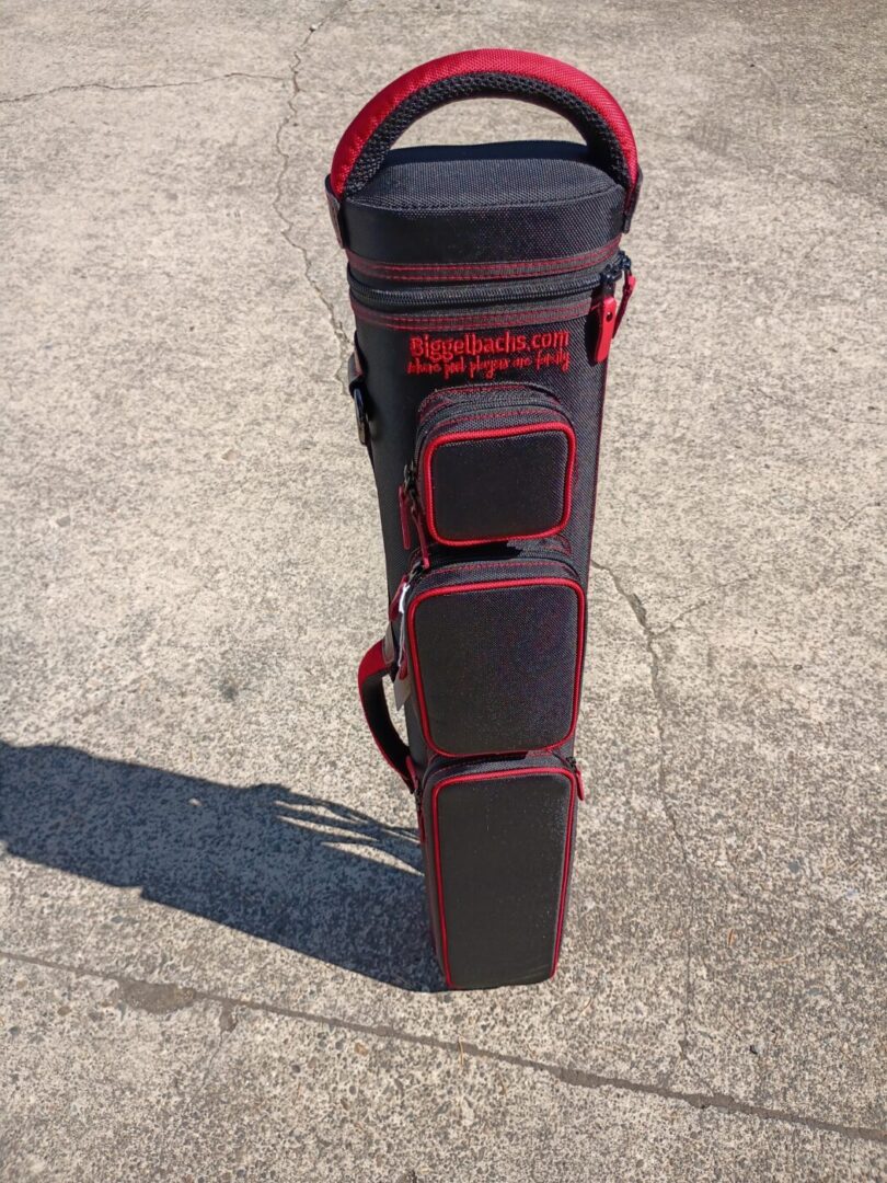 This case holds 3 butts and 6 shafts. Maximum interior length capacity is 32.5″. This case is made of durable nylon/polyester material with reinforced leather stress points. Features an UltraPad interior and very comfortable handles. Has a heavy-duty rubber bottom, featuring a non-slip well-padded suede leather shoulder strap. Zippers are the highest quality available and each zipper has two pulls in case one should break. Three roomy pockets for easy access to your essentials. Red stitching, Red Zipper Pulls, Towel Ring, Backpack straps.
