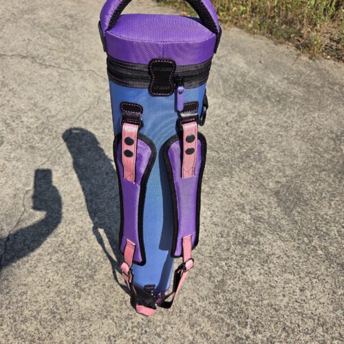 This case holds 3 butts and 6 shafts. Maximum interior length capacity is 32.5″. This case is made of durable nylon/polyester material with reinforced leather stress points. Features an UltraPad interior and very comfortable handles. Has a heavy duty rubber bottom, featuring a non-slip well padded shoulder strap. Zippers are the highest quality available and each zipper has two pulls in case one should break. Three roomy pockets for easy access to your essentials. Purple stitching, Purple Zipper Pulls, Towel Ring, Backpack straps.
