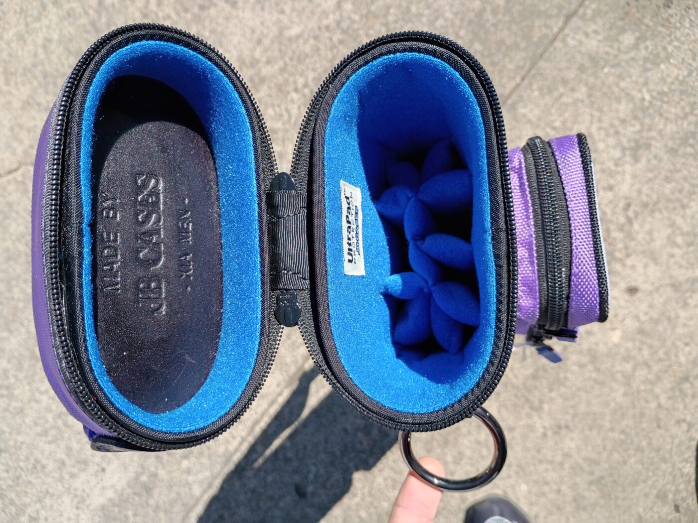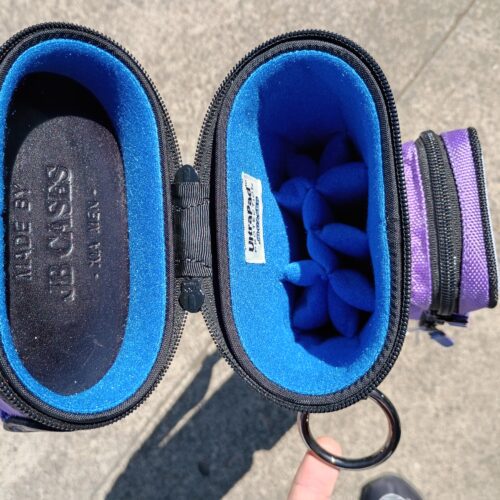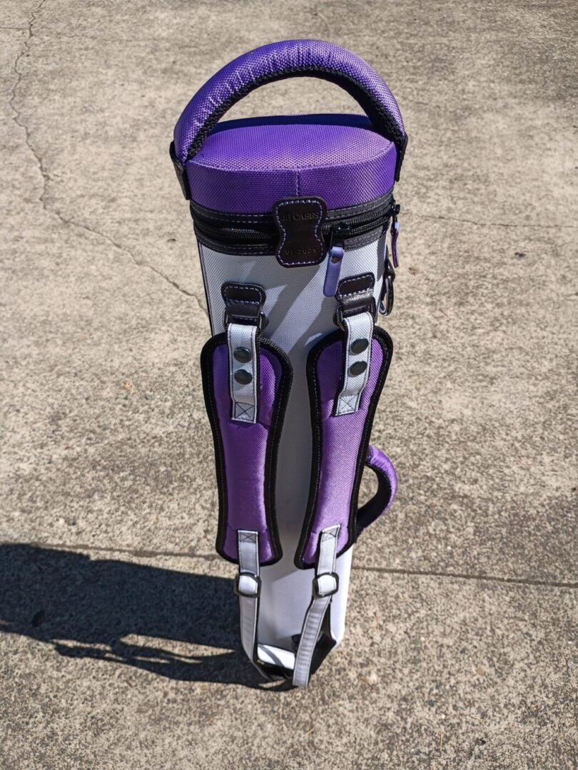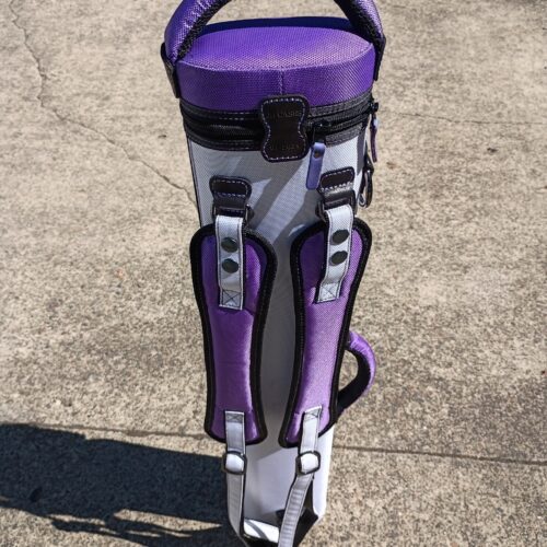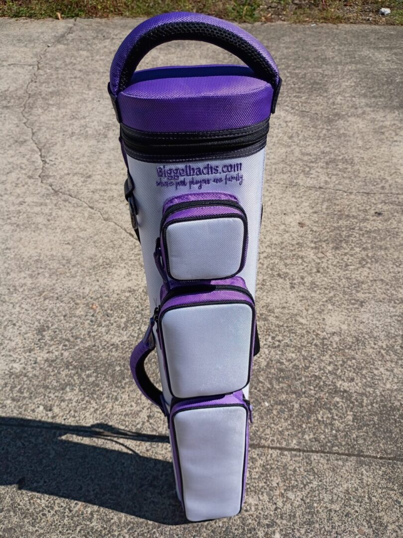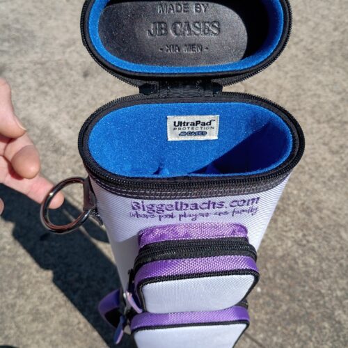 This case holds 3 butts and 6 shafts. Maximum interior length capacity is 32.5″. This case is made of durable nylon/polyester material with reinforced leather stress points. Features an UltraPad interior and very comfortable handles. Has a heavy-duty rubber bottom, featuring a non-slip well-padded suede leather shoulder strap. Zippers are the highest quality available and each zipper has two pulls in case one should break. Three roomy pockets for easy access to your essentials. Purple stitching, Purple Zipper Pulls, Towel Ring, Backpack straps.