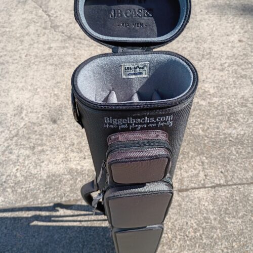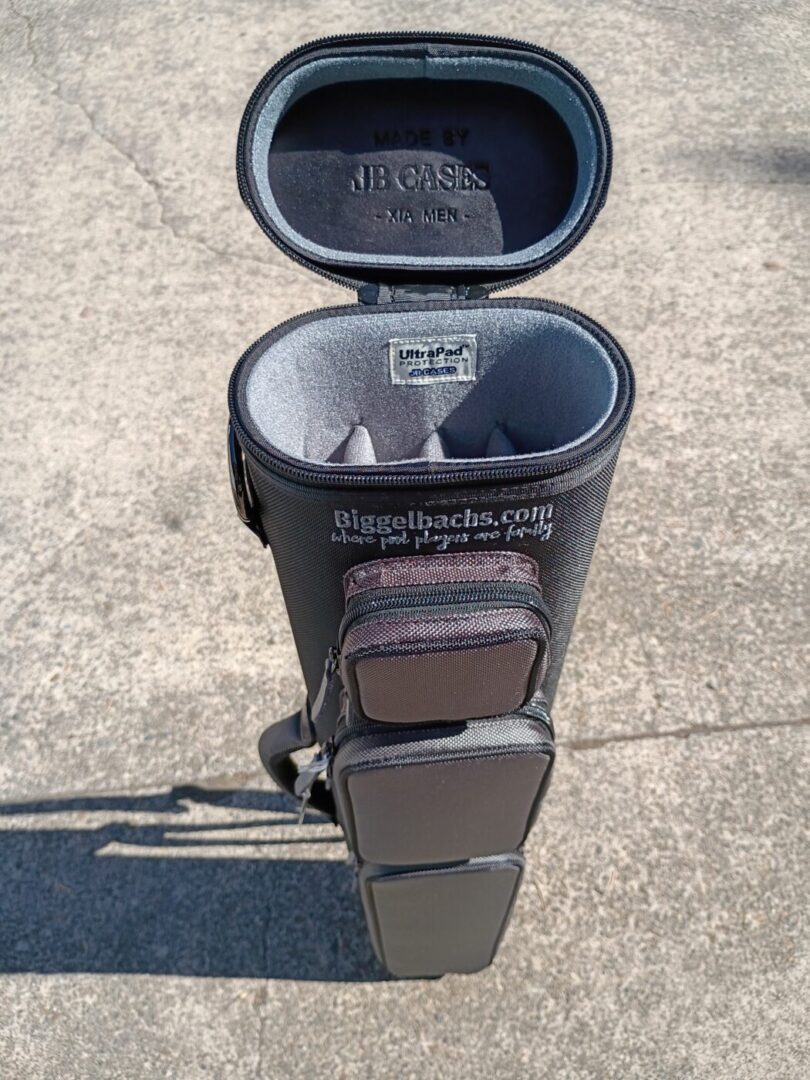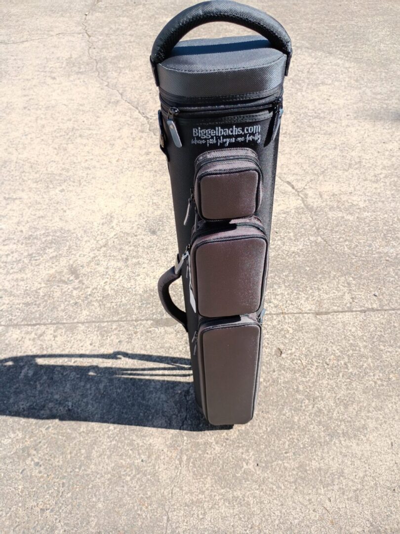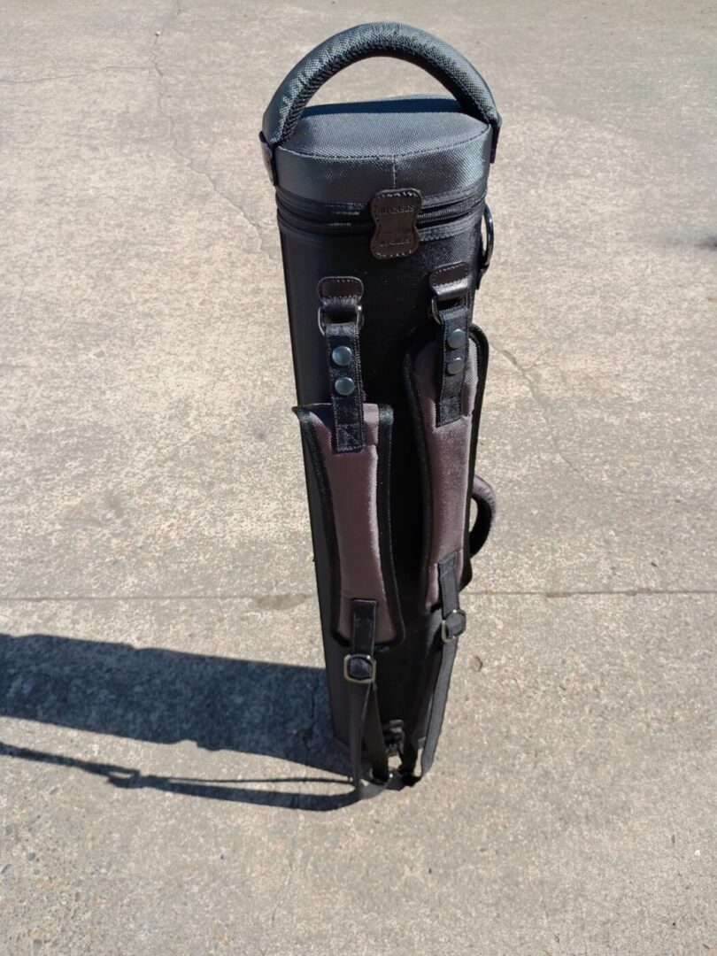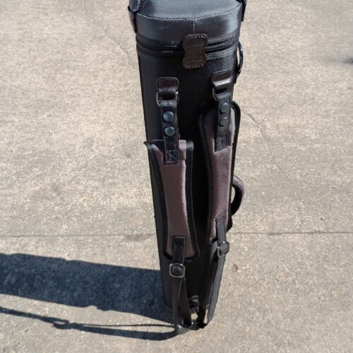 This case holds 4 butts and 8 shafts. Maximum interior length capacity is 32.5″. This case is made of durable nylon/polyester material with reinforced leather stress points. Features an UltraPad interior and very comfortable handles. Has a heavy duty rubber bottom, featuring a non-slip well padded shoulder strap. Zippers are the highest quality available and each zipper has two pulls in case one should break. Three roomy pockets for easy access to your essentials. Black stitching, Olive Zipper Pulls, Towel Ring, Backpack straps.