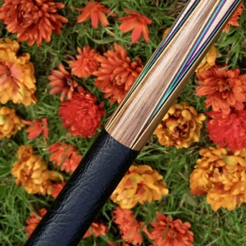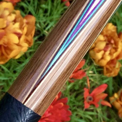 This gorgeous Titlist cue by hall of Fame cue maker Bill Schick has 4 vibrant veneers wrapped around a birds eye maple forearm with a leather wrap. An excellent piece to add to any collection.