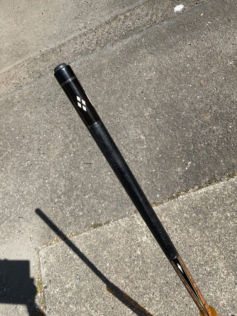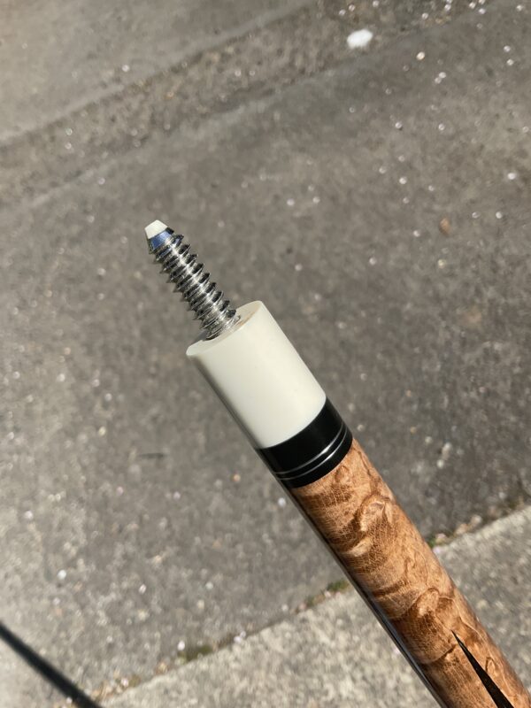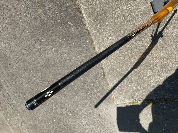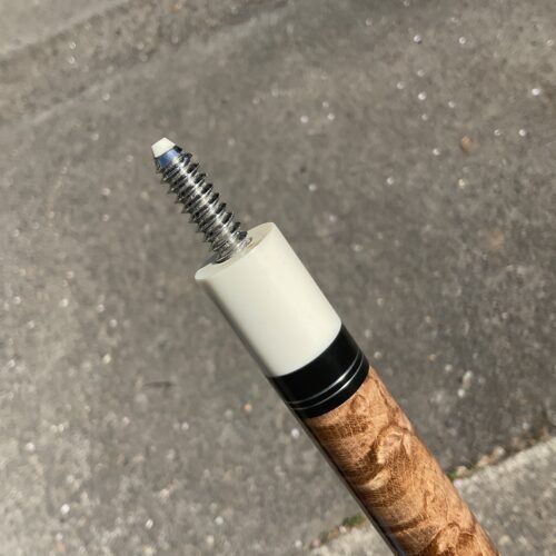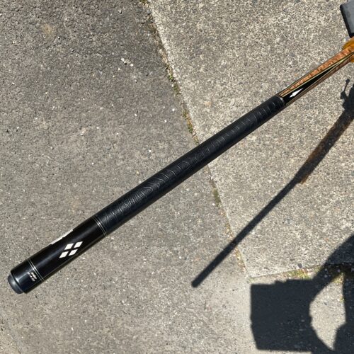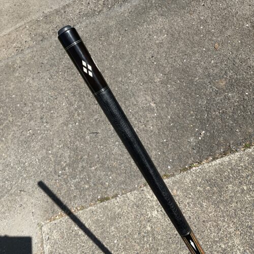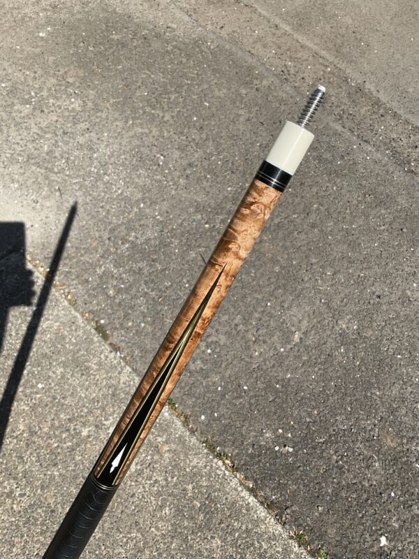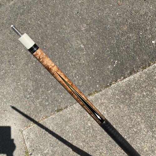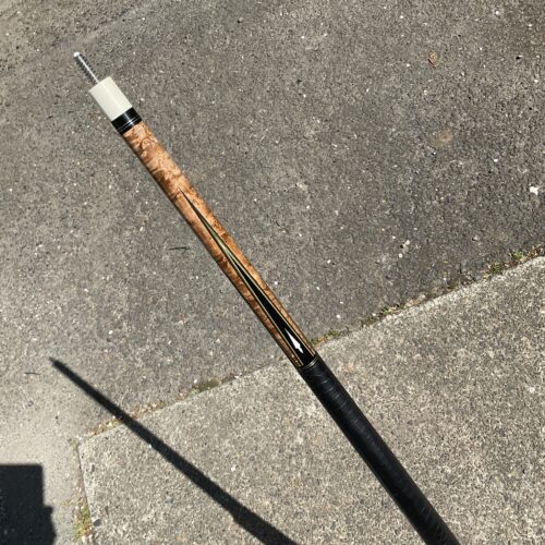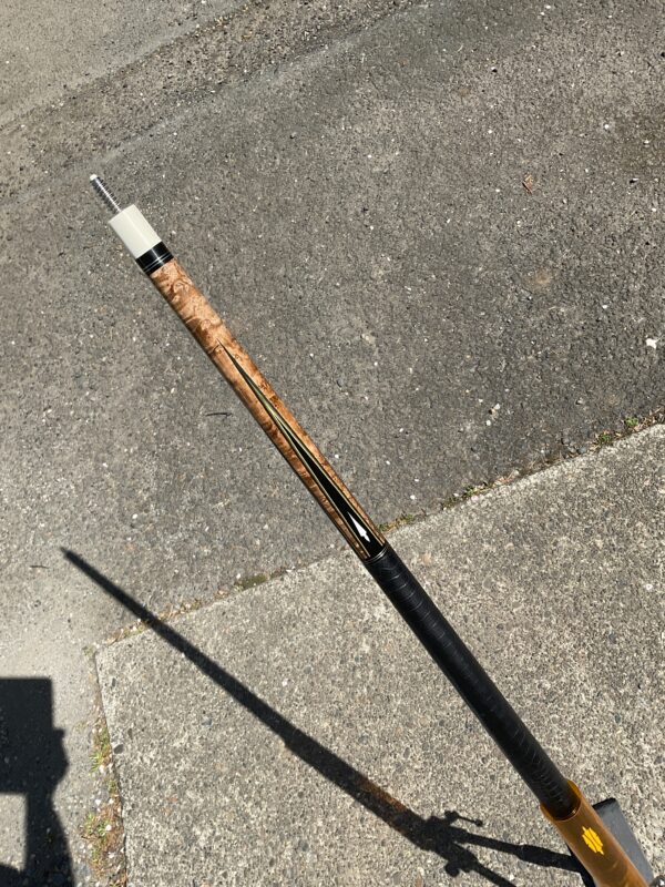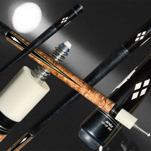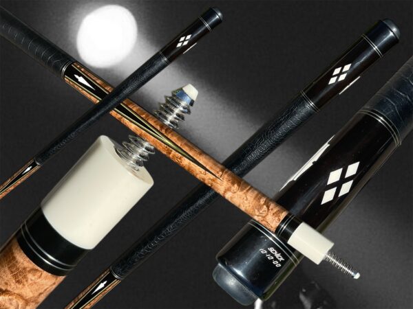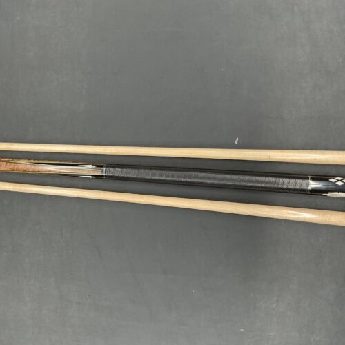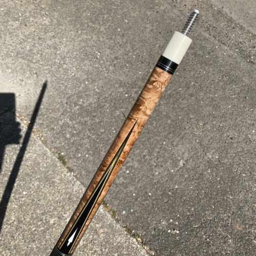 A gorgeous mixture of ebony and natural material were used to create this beauty built by Bill Schick. Four ebony points are accented with forest green veneers and a maple forearm. The Butt of the cue is ebony with four natural accents help this cue to really stand out. Black leather wrap, natural joint along with a 3/8-10 are sure to give this cue a unique hit. A truly amazing cue built by a true Hall of Fame cue maker.
