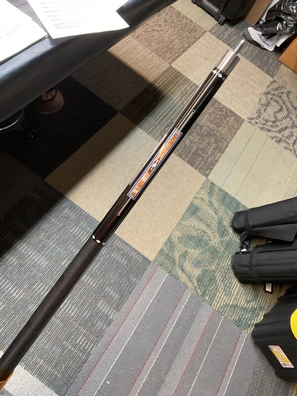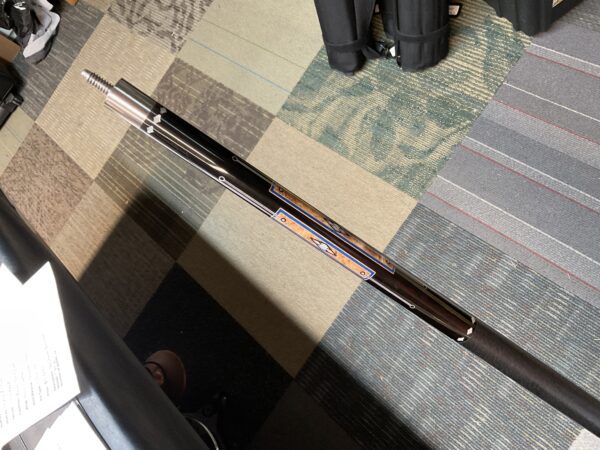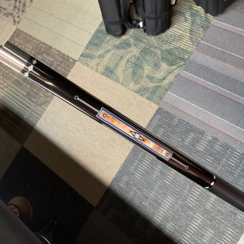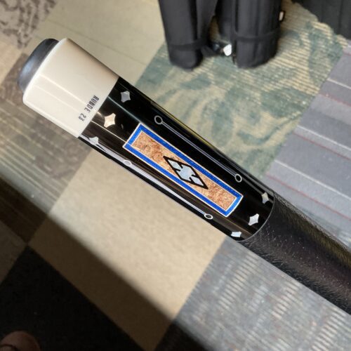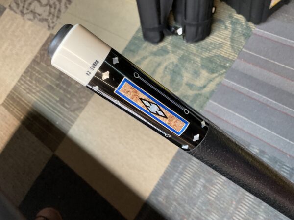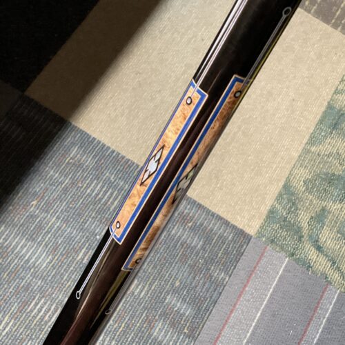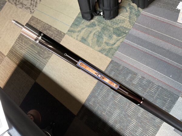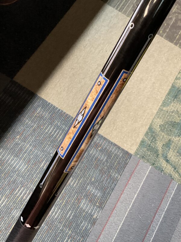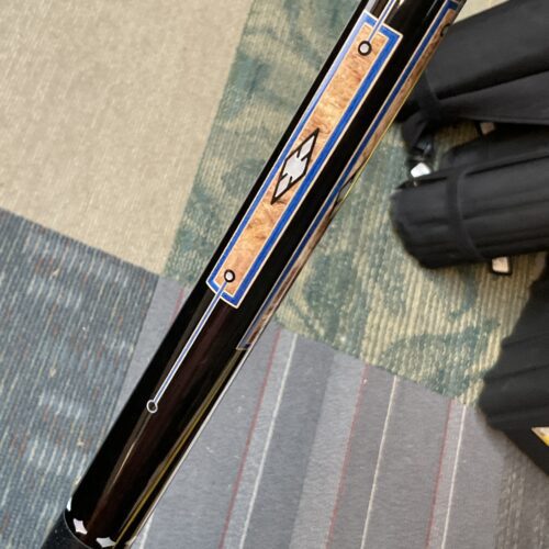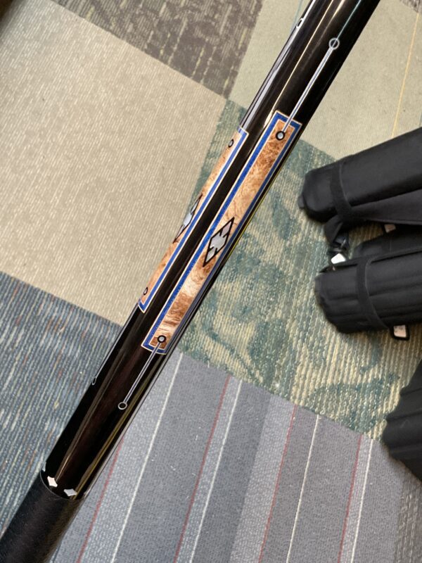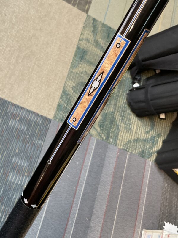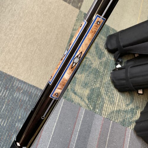 This Bob Runde cue from 2023 is a great example of experience and elegance. The floating blue box points accent the ebony forearm nicely. This cue makes a great player and is easy on the eyes.