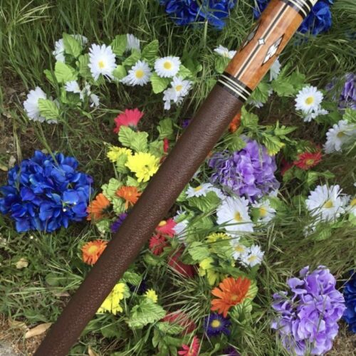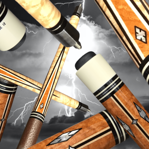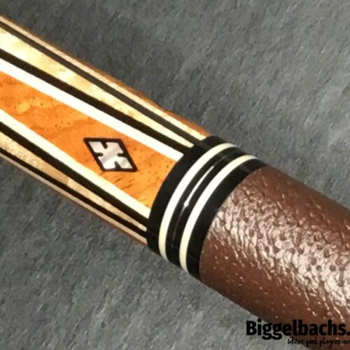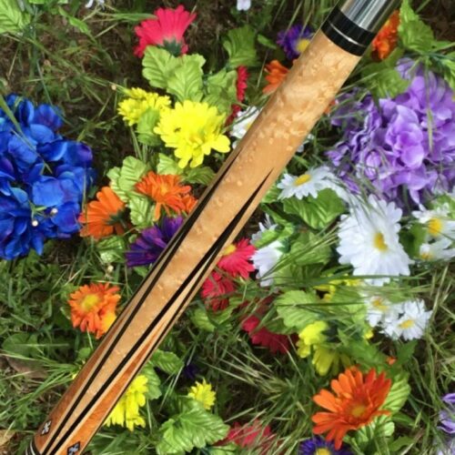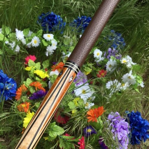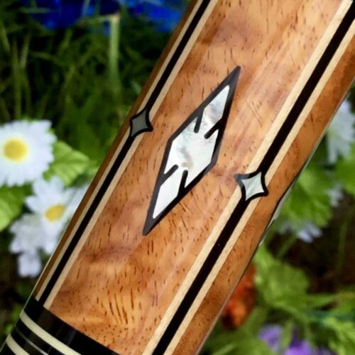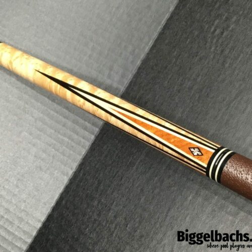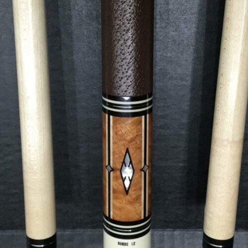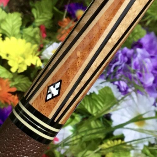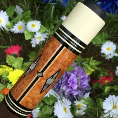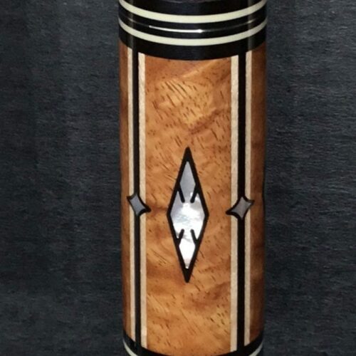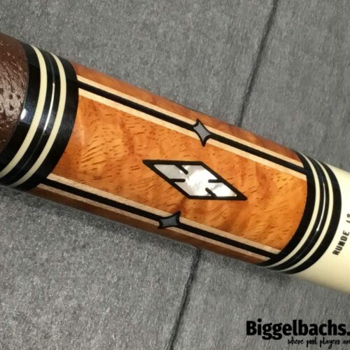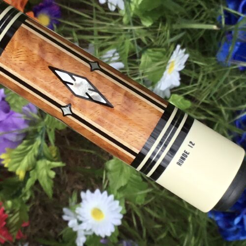 This four point brown bombshell built by Bob Runde in 2012 is an absolute masterpiece. Perfect use of wood and contrast in this cue’s points, ebony into maple, maple in ebony, finished by afzelia burl points. This cue features a soft yet grippy pig skin wrap. The butt of this cue is more afzelia burl with mother of pearl inlays. Without being over the top, this cue is absolutely gorgeous.