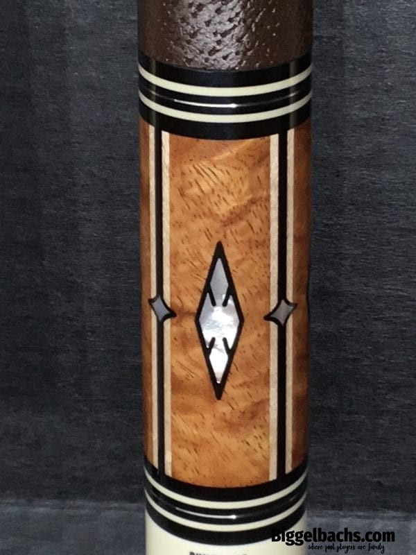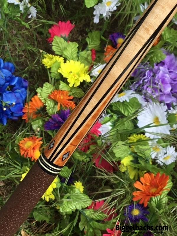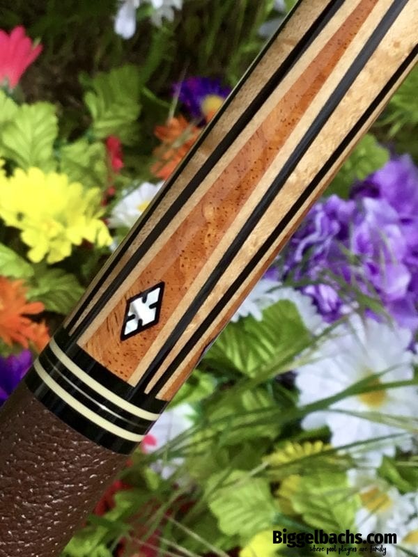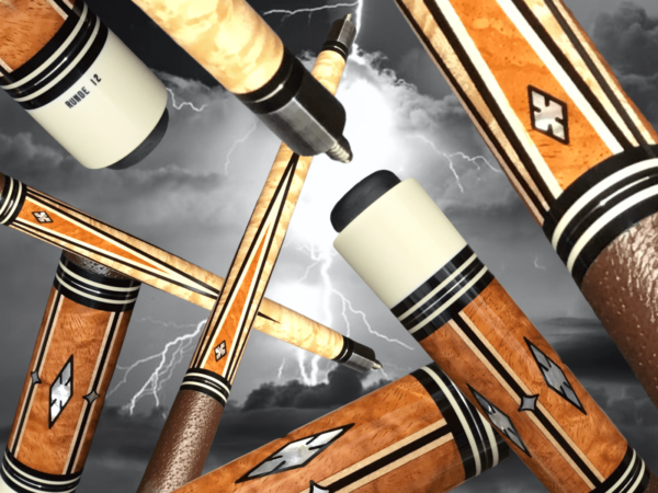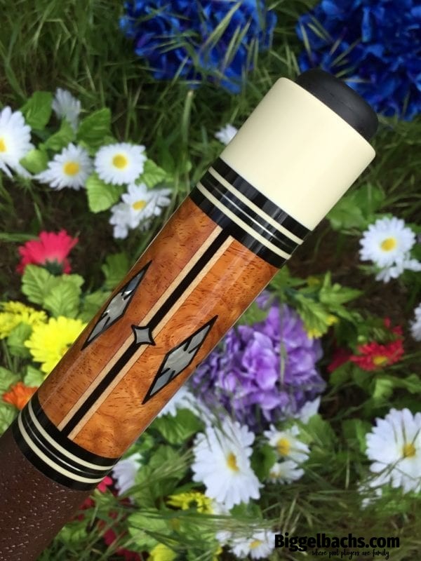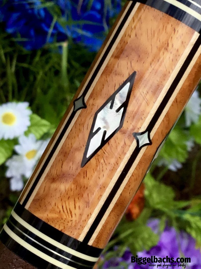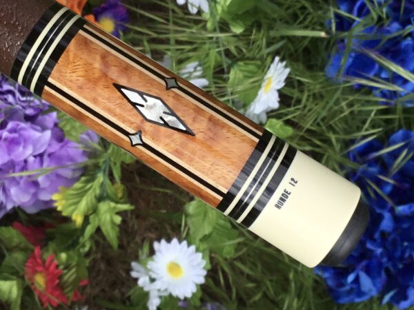 This four point brown bombshell built by Bob Runde in 2012 is an absolute masterpiece. Perfect use of wood and contrast in this cue’s points, ebony into maple, maple in ebony, finished by afzelia burl points. This cue features a soft yet grippy pig skin wrap. The butt of this cue is more afzelia burl with mother of pearl inlays. Without being over the top, this cue is absolutely gorgeous.