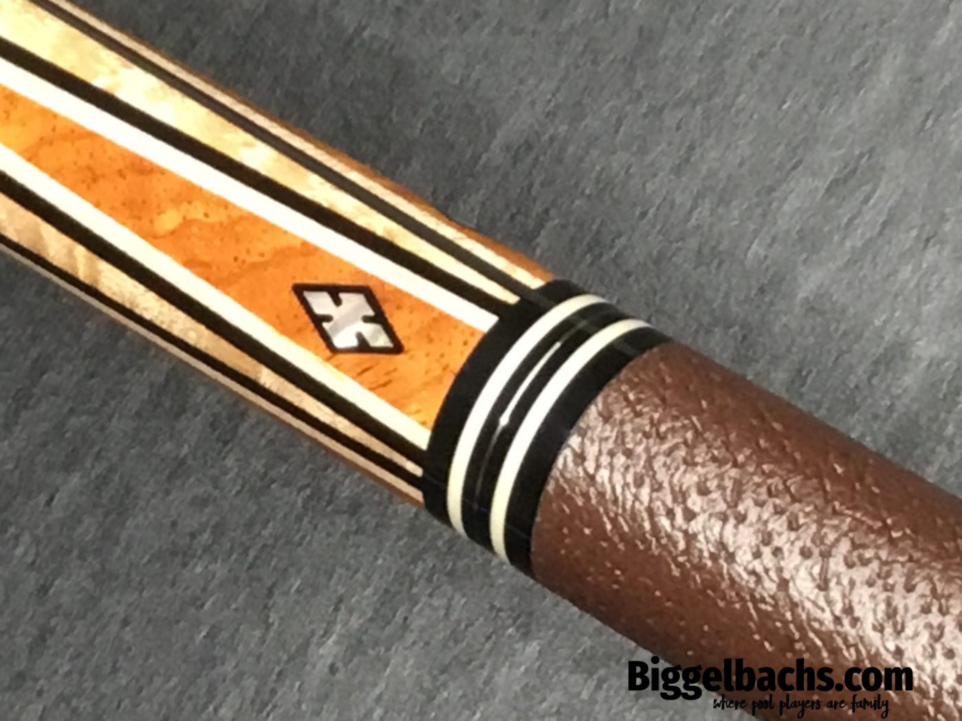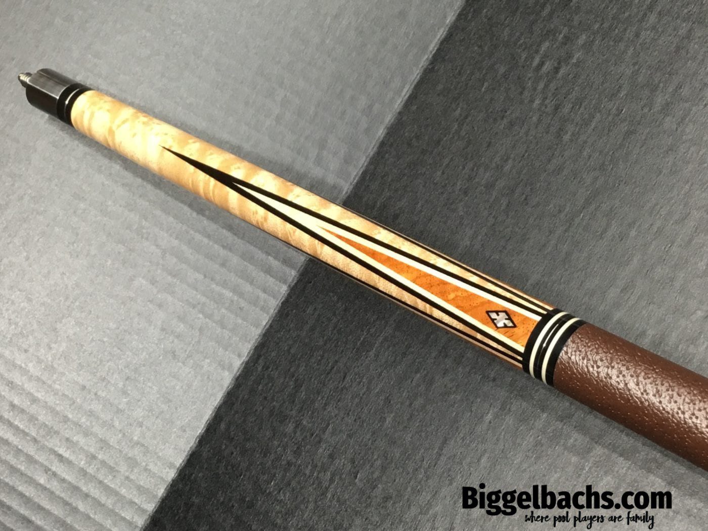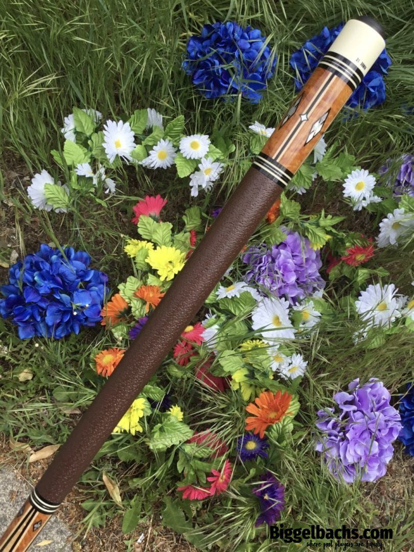 This four point brown bombshell built by Bob Runde in 2012 is an absolute masterpiece. Perfect use of wood and contrast in this cue’s points, ebony into maple, maple in ebony, finished by afzelia burl points. This cue features a soft yet grippy pig skin wrap. The butt of this cue is more afzelia burl with mother of pearl inlays. Without being over the top, this cue is absolutely gorgeous.