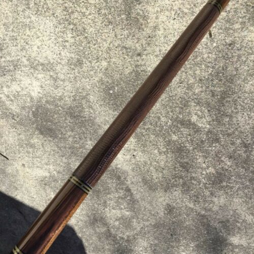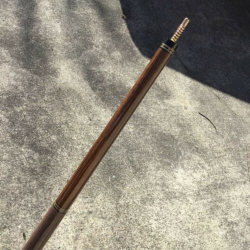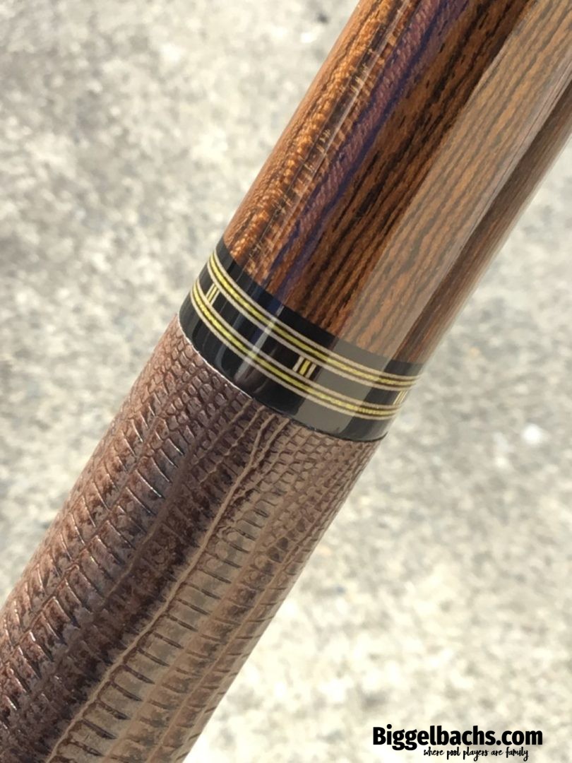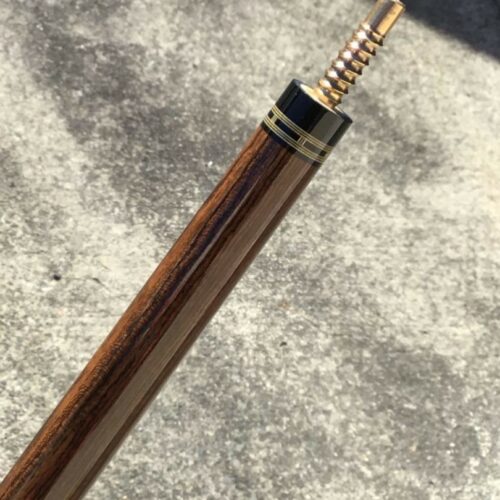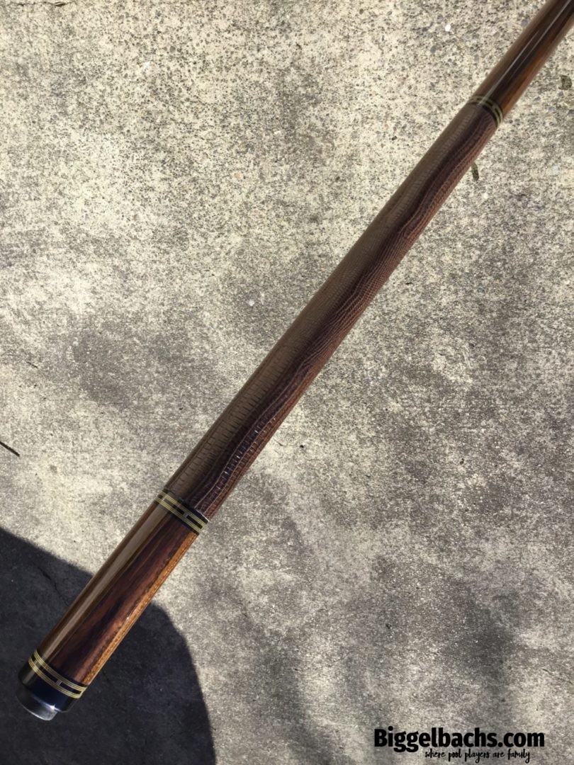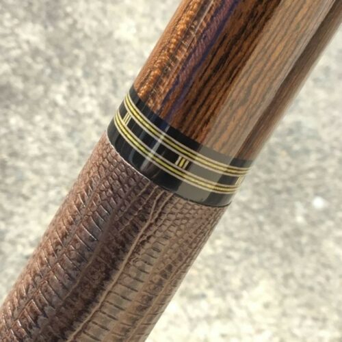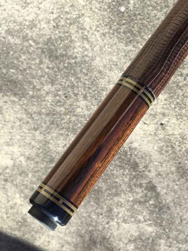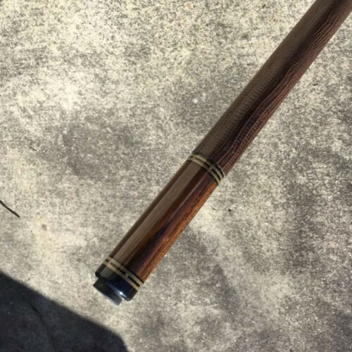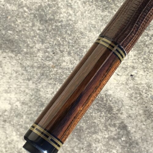 Very handsome Merry Widow Capone Custom cue. Rich and figured Cocobolo play the canvas in this classy work of art! It is complimented with a brown lizard wrap and refined collar rings.