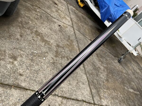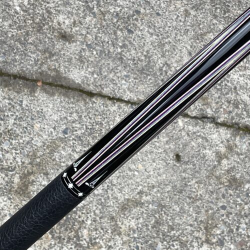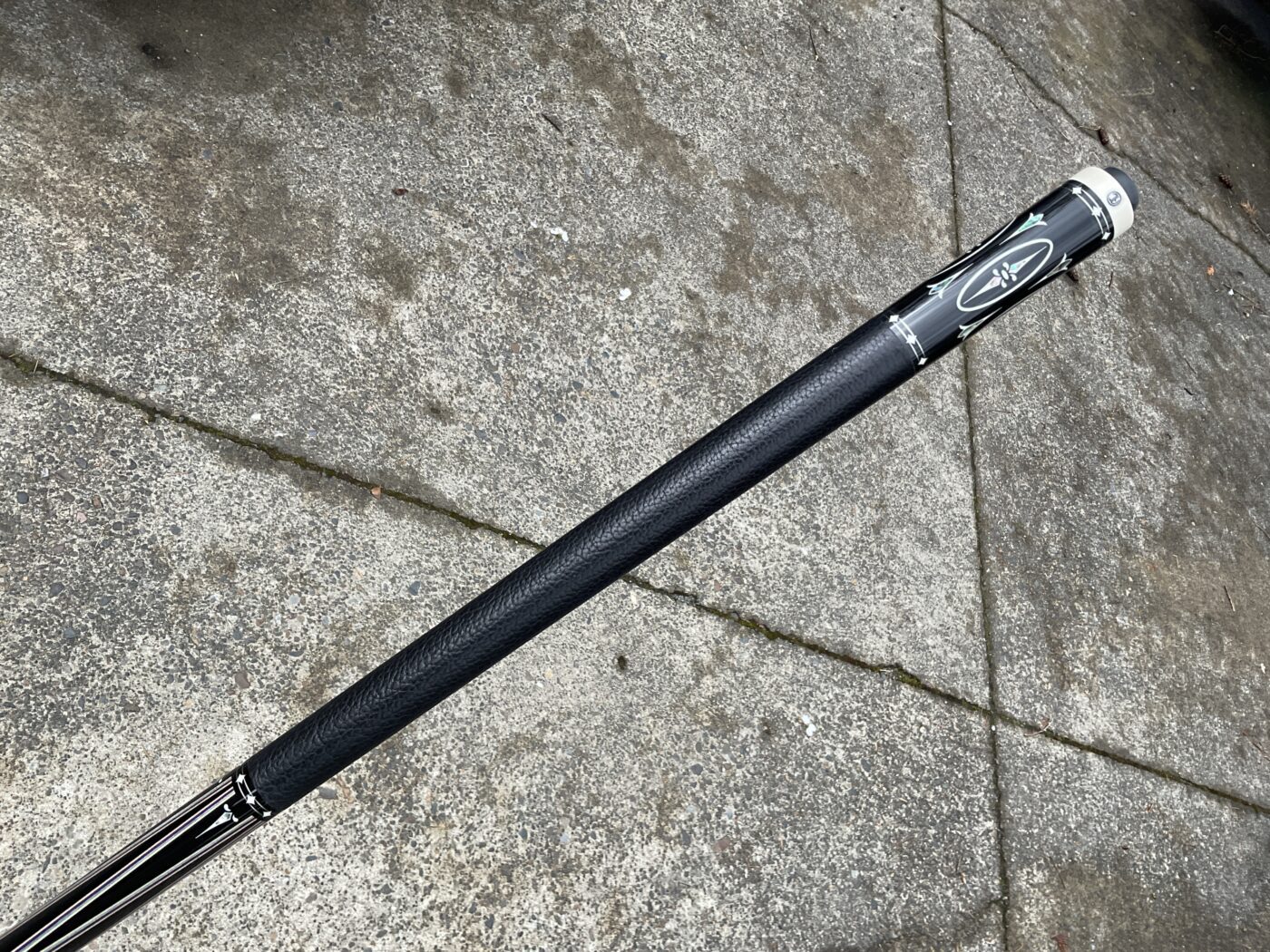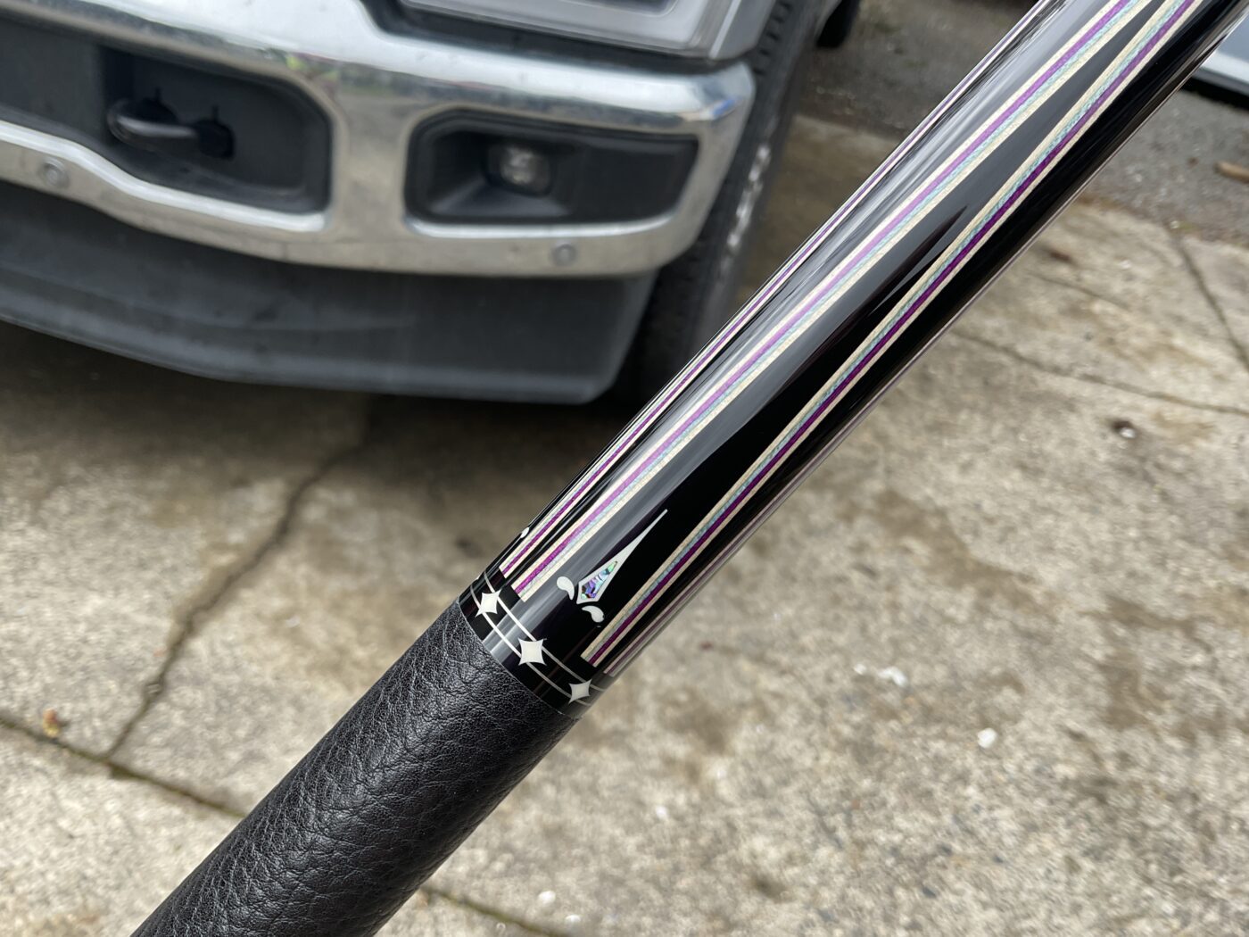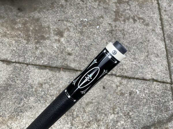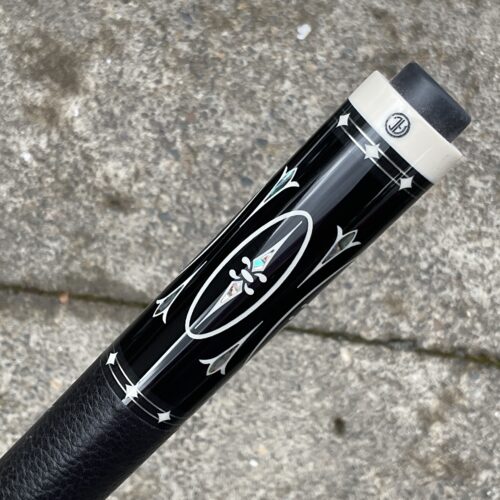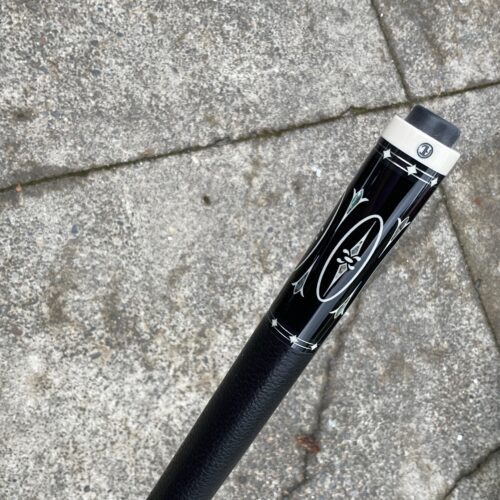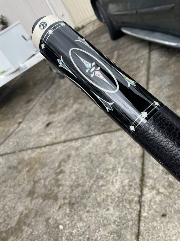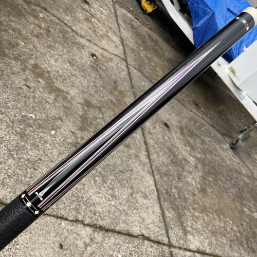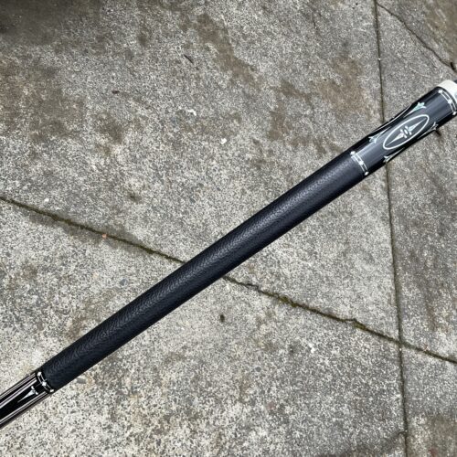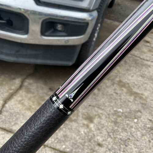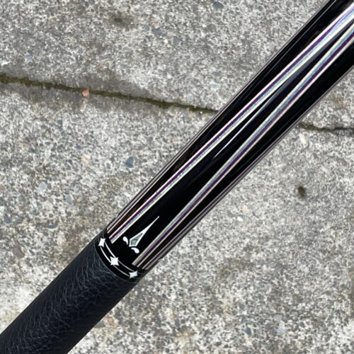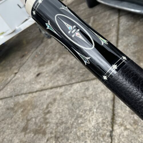 Up for grabs is this brand new Ariel Carmeli. This cue boasts 4 points and a stylish circle design in the butt sleeve, with abalone accents! The ringwork throughout this cue is stunning to see, and is complemented with a leather wrap. Don’t miss out on this opportunity to own this collectible beauty.