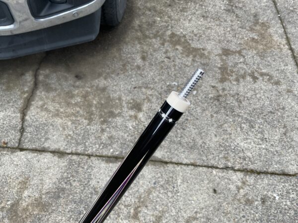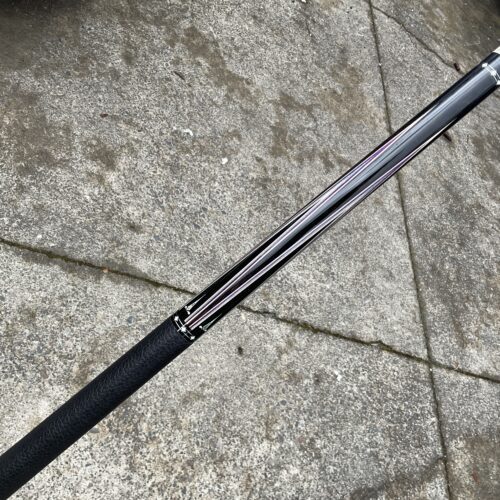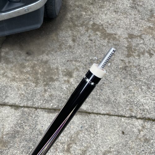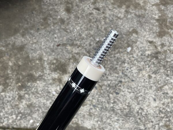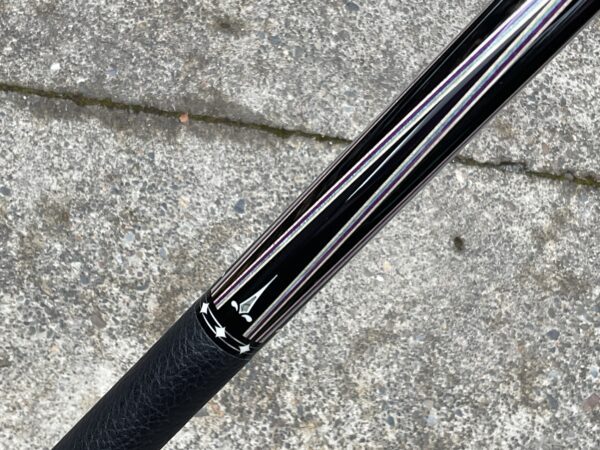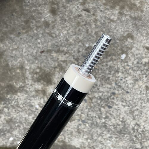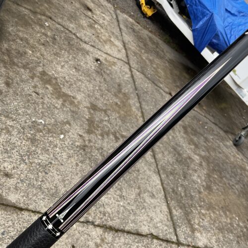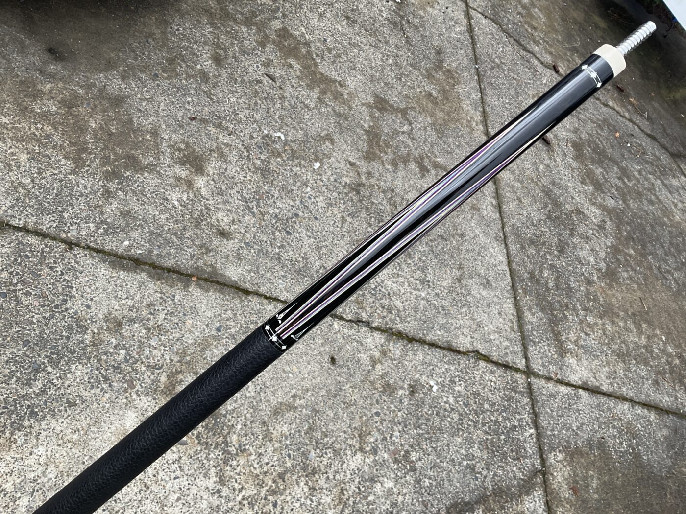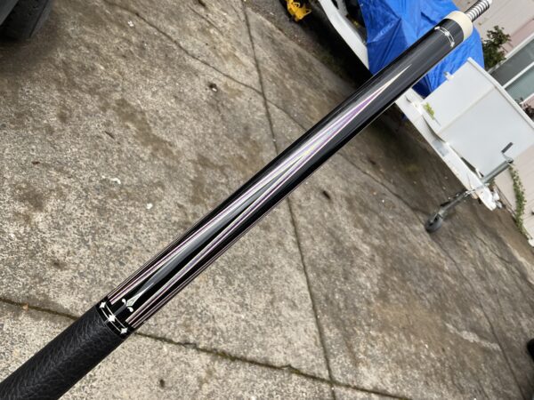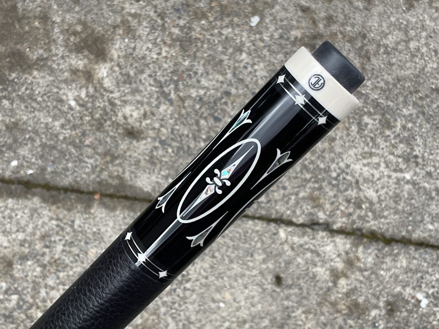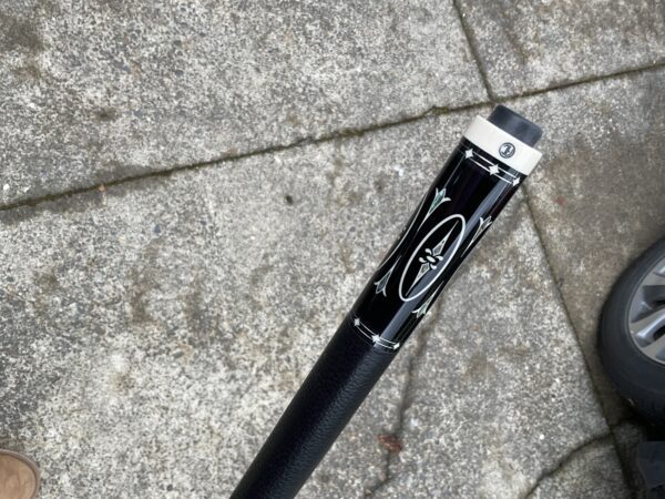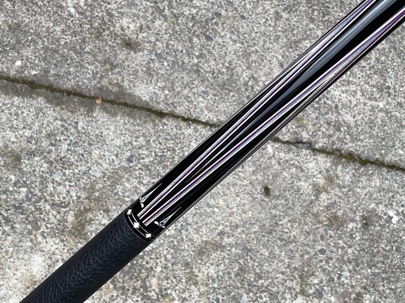 Up for grabs is this brand new Ariel Carmeli. This cue boasts 4 points and a stylish circle design in the butt sleeve, with abalone accents! The ringwork throughout this cue is stunning to see, and is complemented with a leather wrap. Don’t miss out on this opportunity to own this collectible beauty.