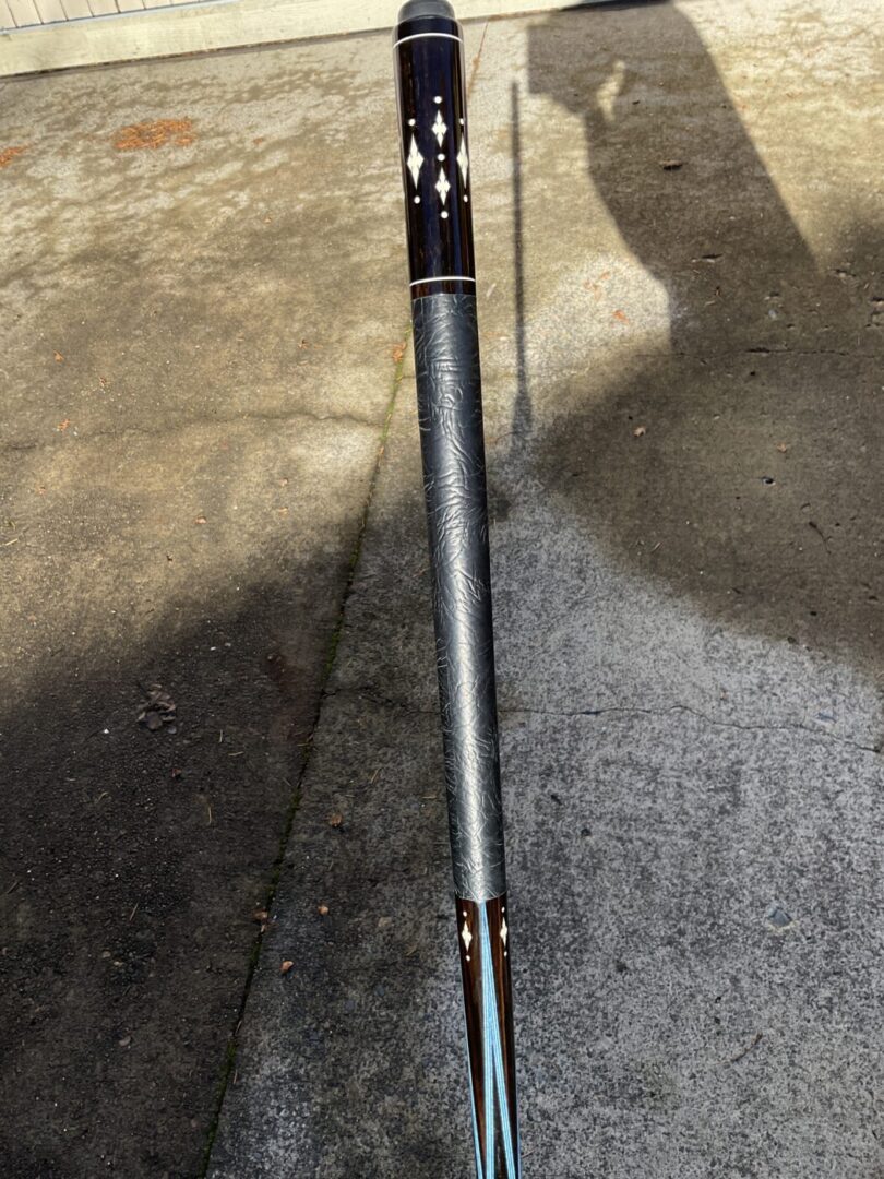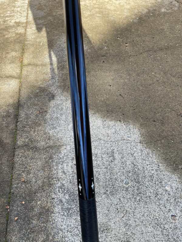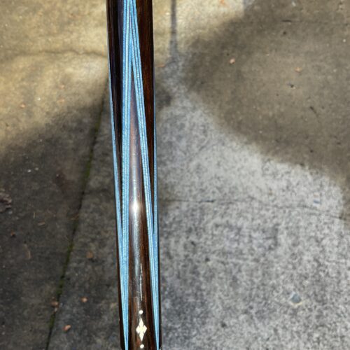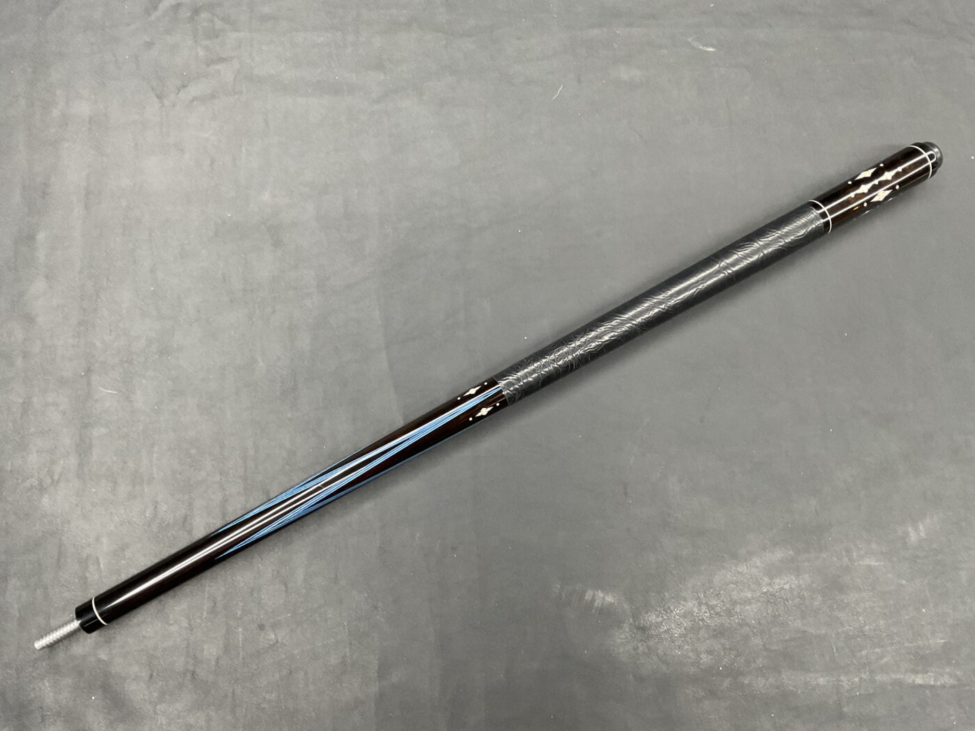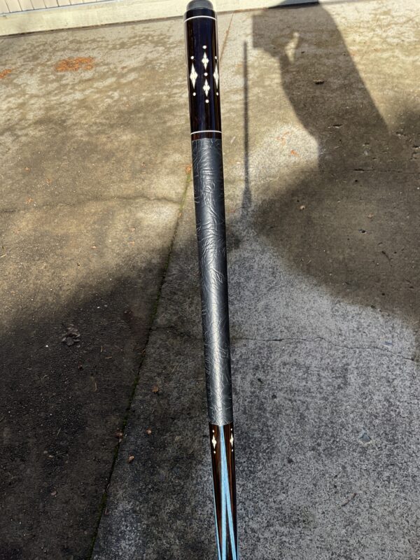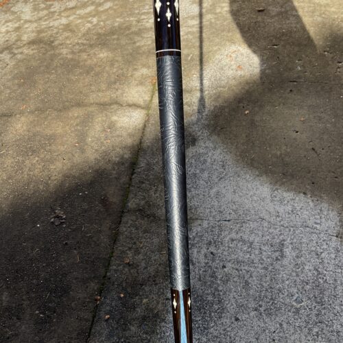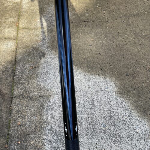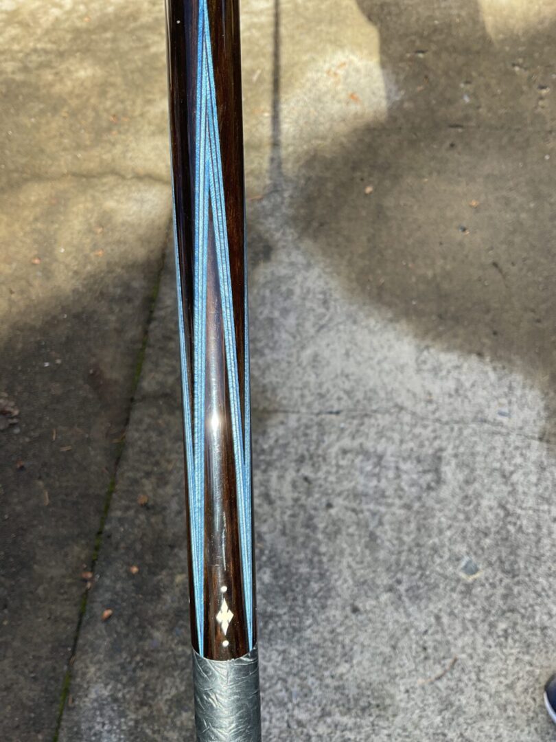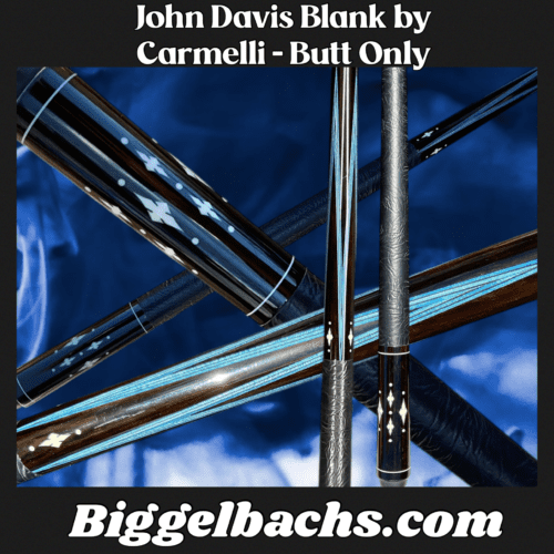 Up for grabs here is John Davis blank made by Ariel Carmelli with stunning royal blue veneers. This cue is sold with a BUTT only, no shaft is included. The butt rolls straight and measures .835″ at the joint. It will be an incredibly attractive player with its contrasting blue veneers, ebony points and forearm and beautiful mother of pearl diamond inlays.
