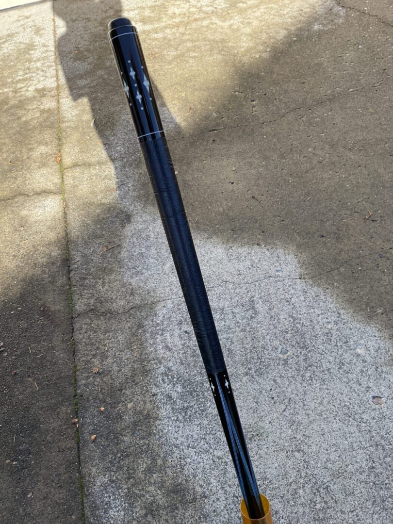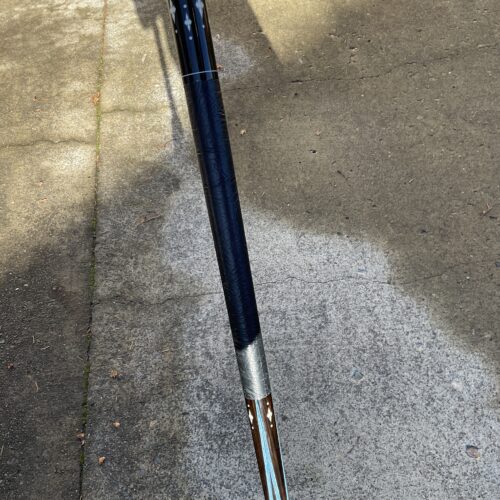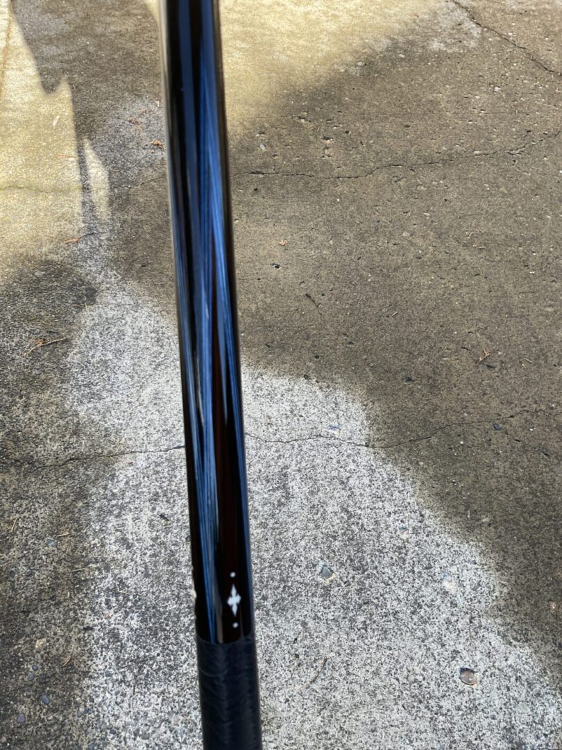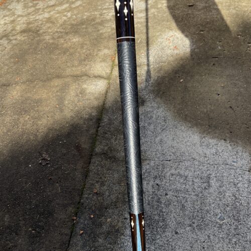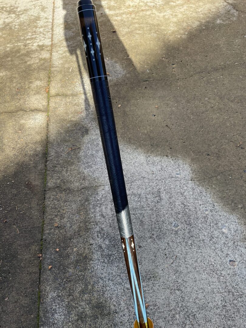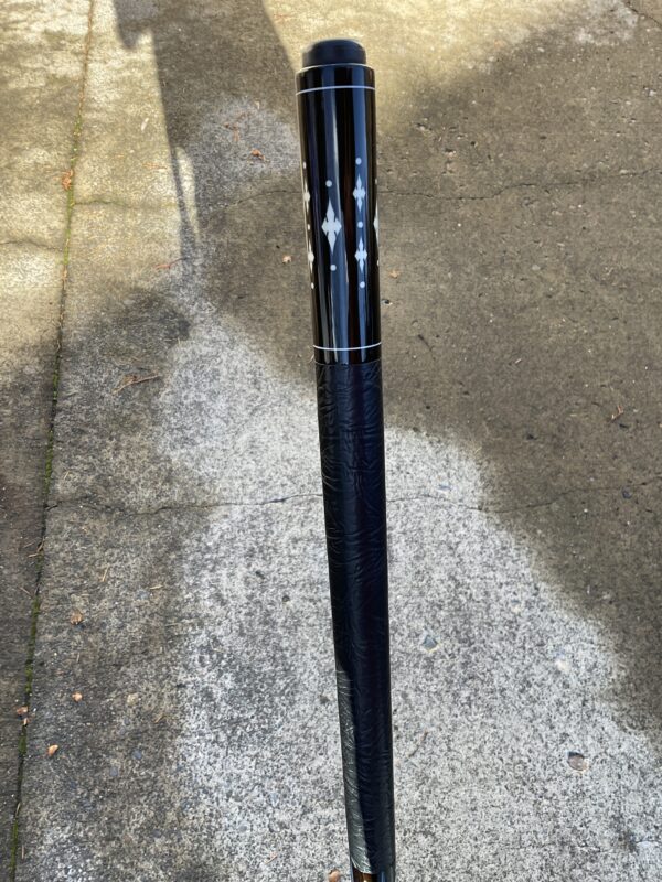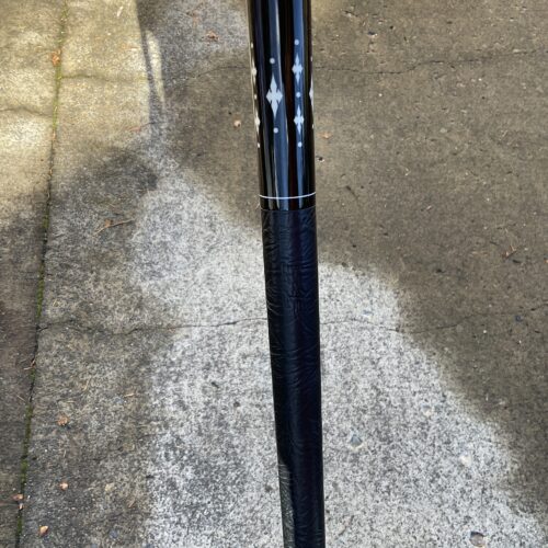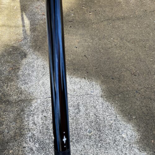 Up for grabs here is John Davis blank made by Ariel Carmelli with stunning royal blue veneers. This cue is sold with a BUTT only, no shaft is included. The butt rolls straight and measures .835″ at the joint. It will be an incredibly attractive player with its contrasting blue veneers, ebony points and forearm and beautiful mother of pearl diamond inlays.