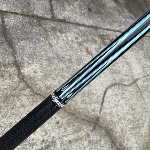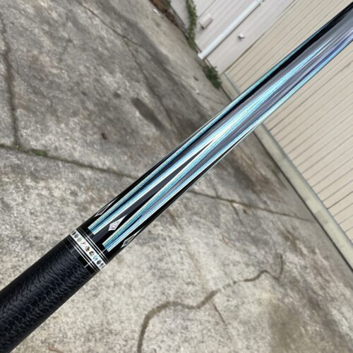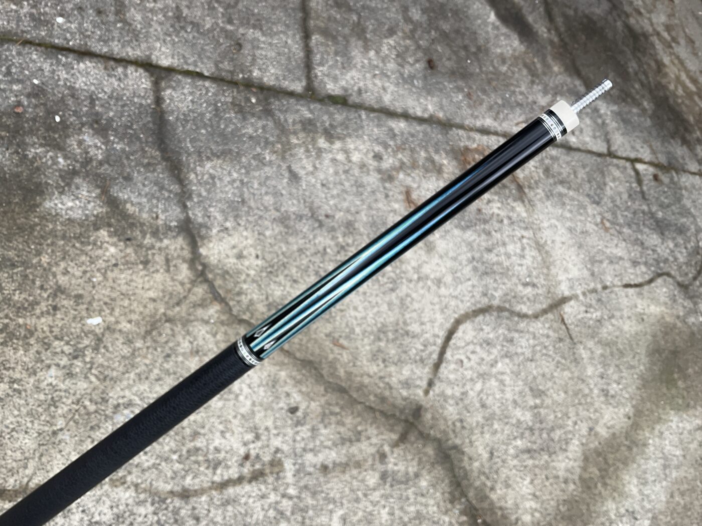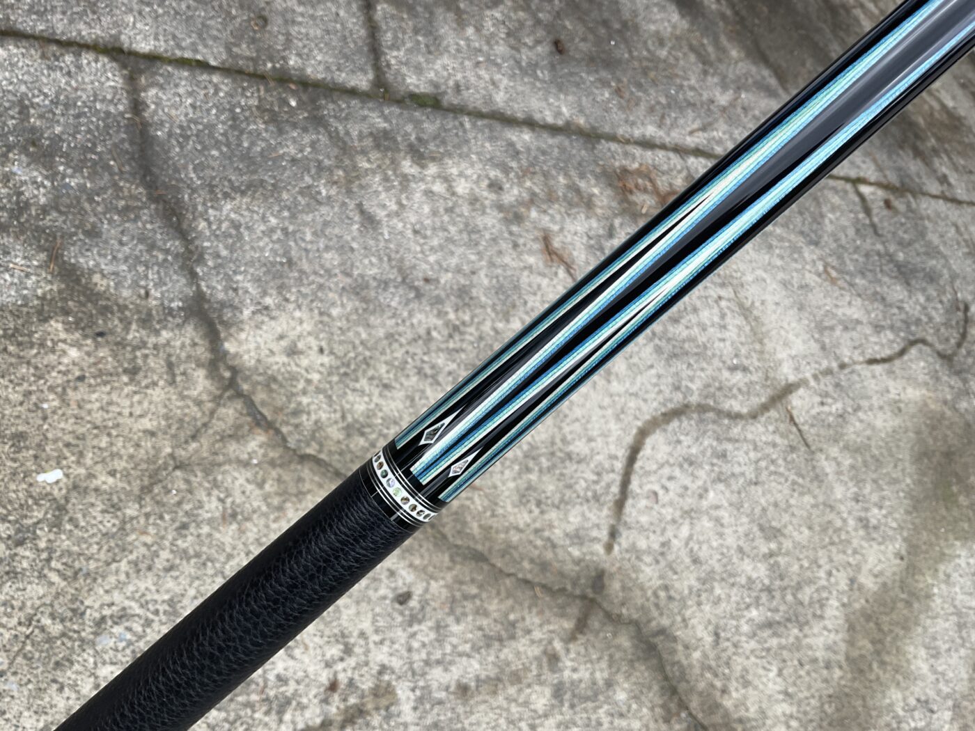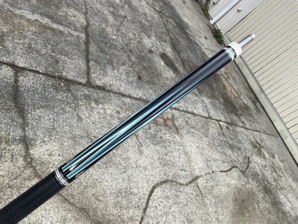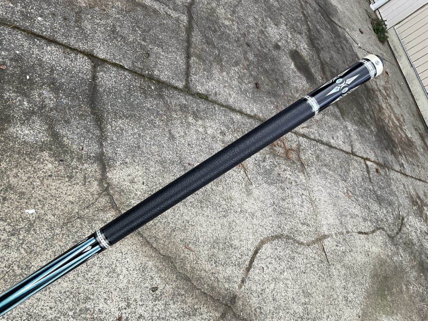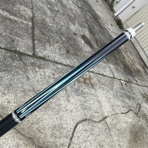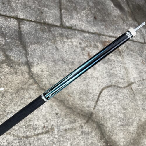 Up for grabs here is one extremely gorgeous Ariel Carmeli. All the elements come together beautifully from the ebony forearm with blue veneer points and delicate ivorine and abalone inlays are all set off with prewitt-tribute collar rings. The rich and soft leather wrap tie it all together making it not only a great one for the collection, but a player as well. The cue comes with 2 shafts and is brand new and unplayed.