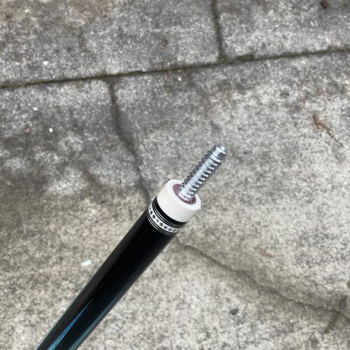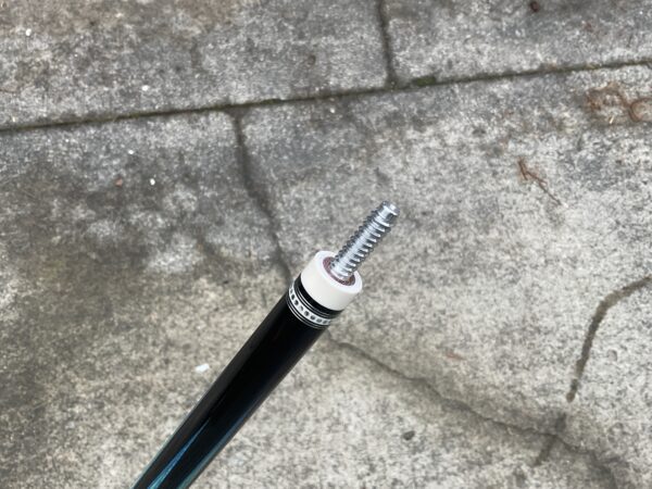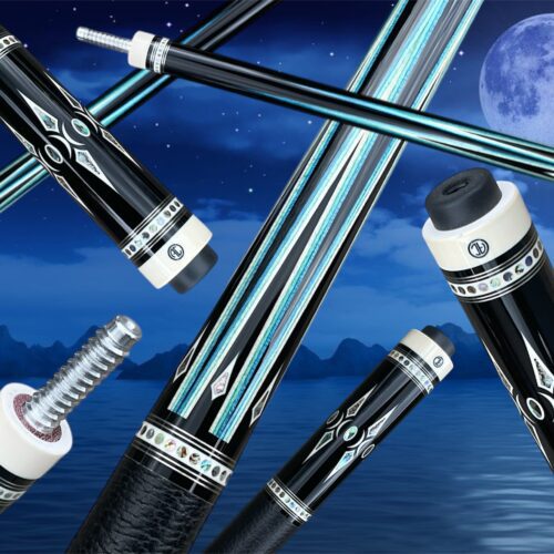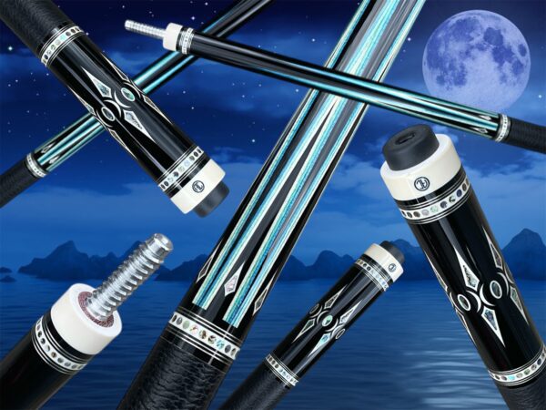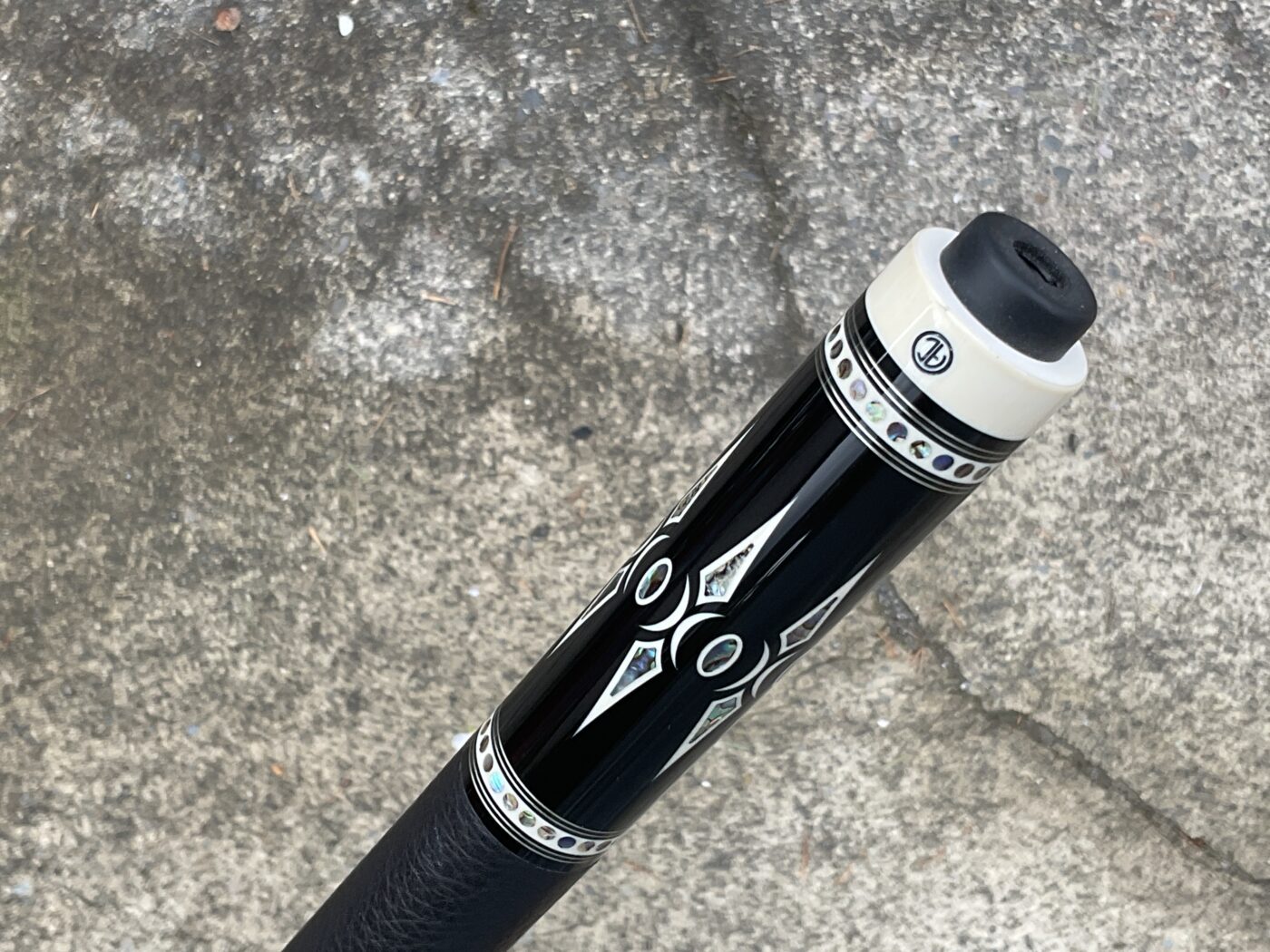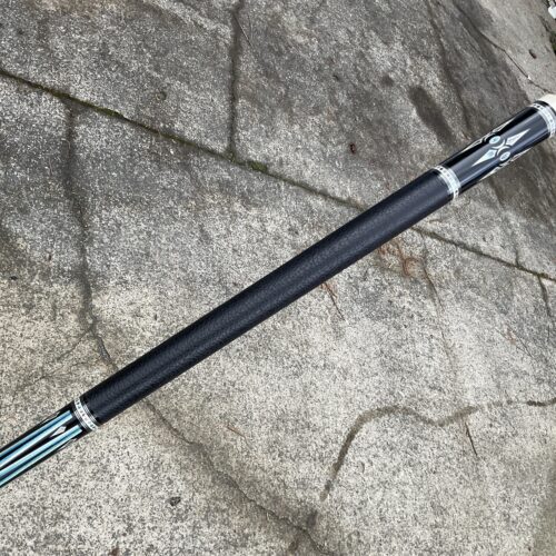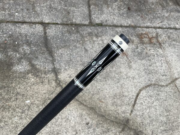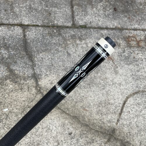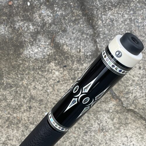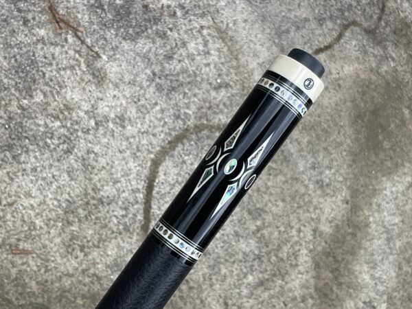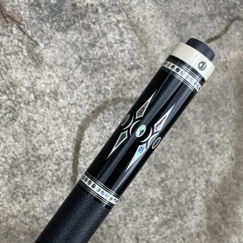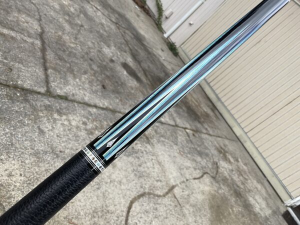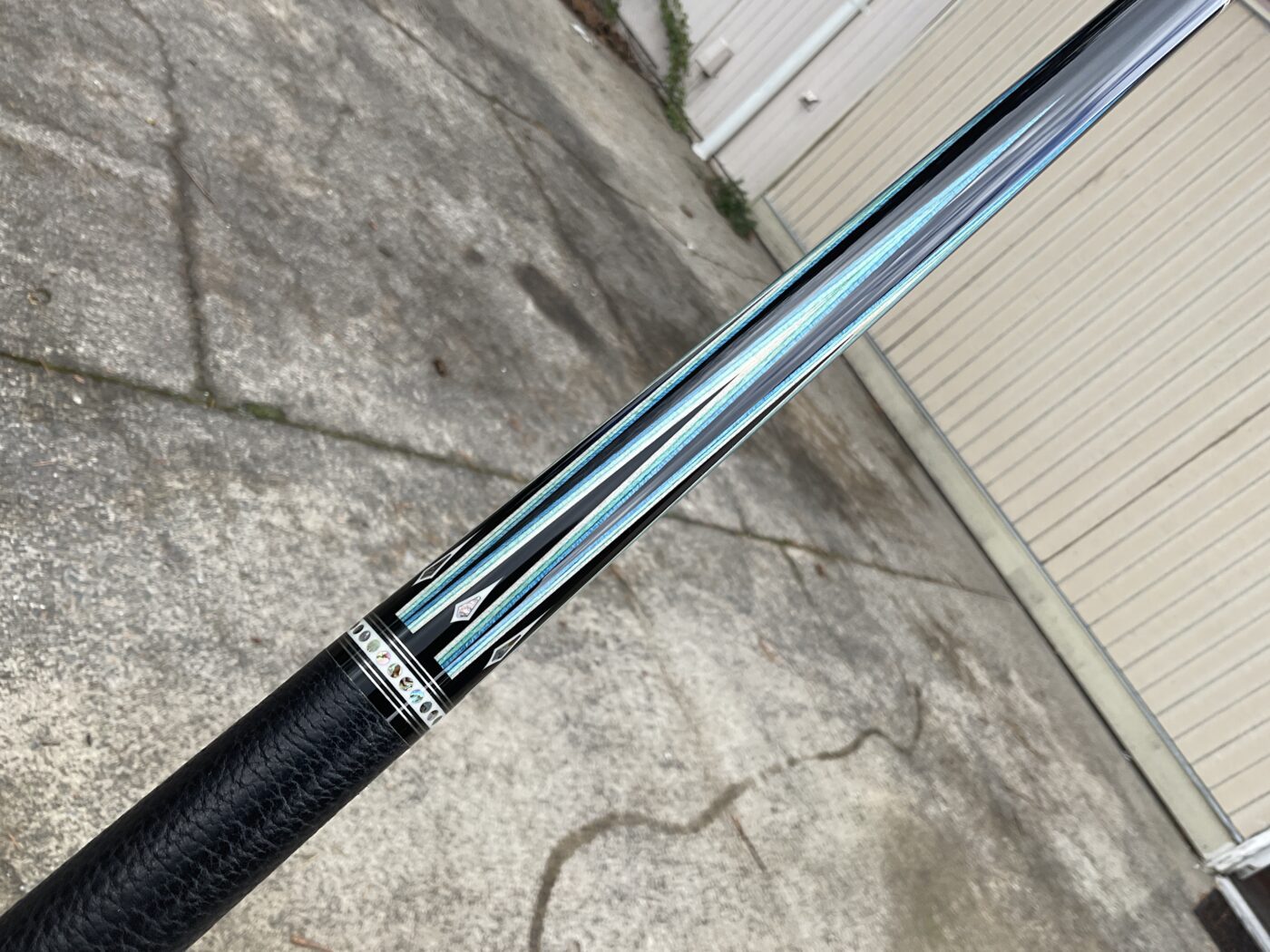 Up for grabs here is one extremely gorgeous Ariel Carmeli. All the elements come together beautifully from the ebony forearm with blue veneer points and delicate ivorine and abalone inlays are all set off with prewitt-tribute collar rings. The rich and soft leather wrap tie it all together making it not only a great one for the collection, but a player as well. The cue comes with 2 shafts and is brand new and unplayed.