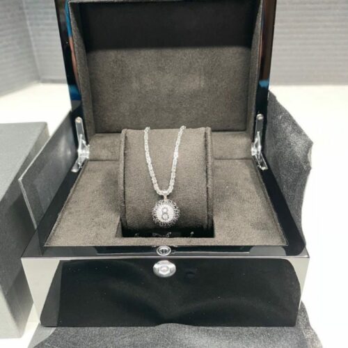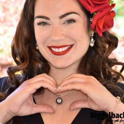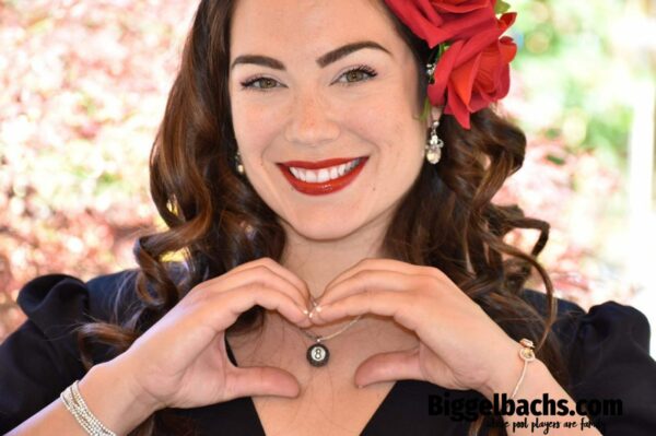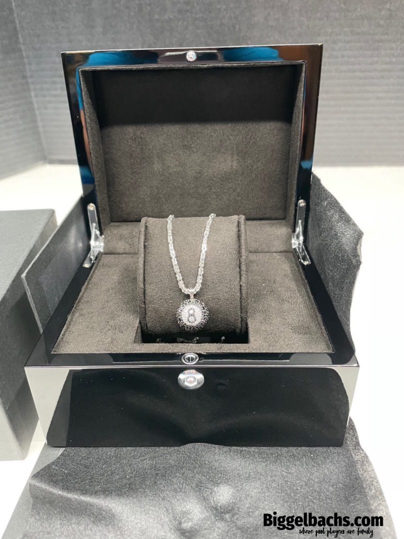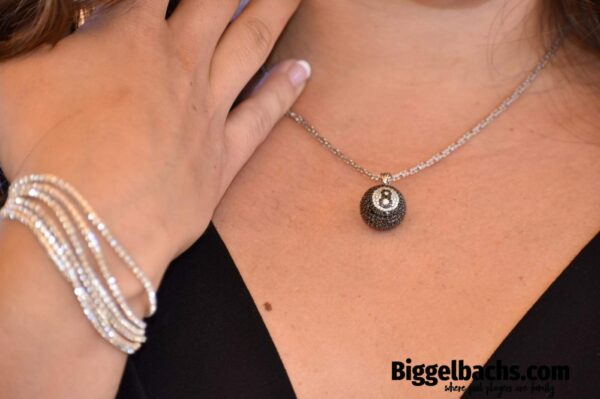 This one of a kind pendant with more than 320 black and white diamonds is absolutely stunning. This full 3-d 8-ball is about the size of a dime. It is mounted in 14k white gold (available in regular or rose gold as well). Shown on a white gold byzantine chain, pendant can be purchased with or without a gold chain. Also, any number pool ball can be made to order and price will fluctuate based on precious stones that are used.