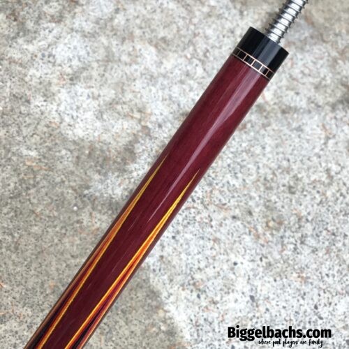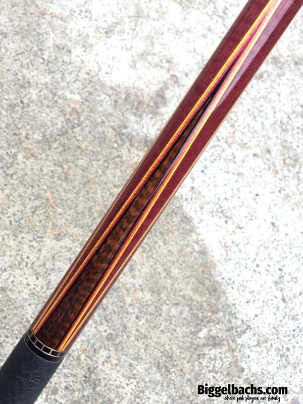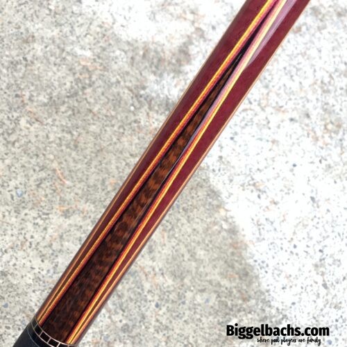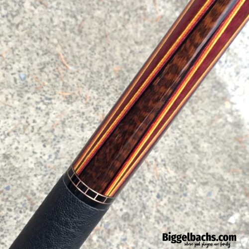 Diveney puts his “eye for design” to work in this gorgeous cue using contrasting woods Purple Heart and Snakewood. The bright yellow and red veneers bring the cue to life giving it a 3-D effect. Quite a steal for the price!