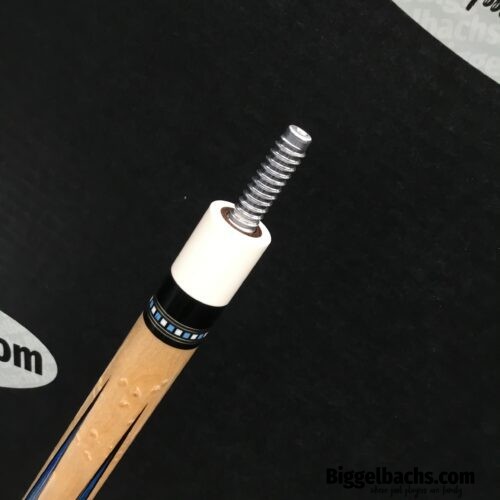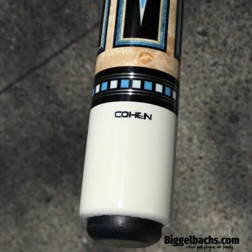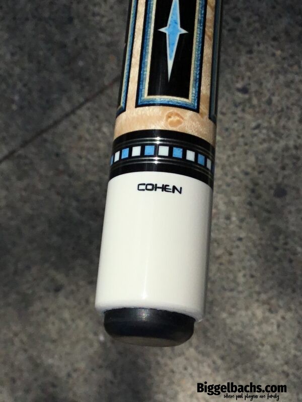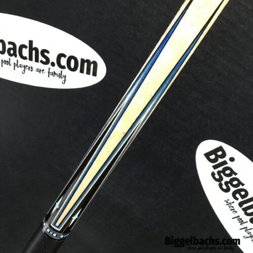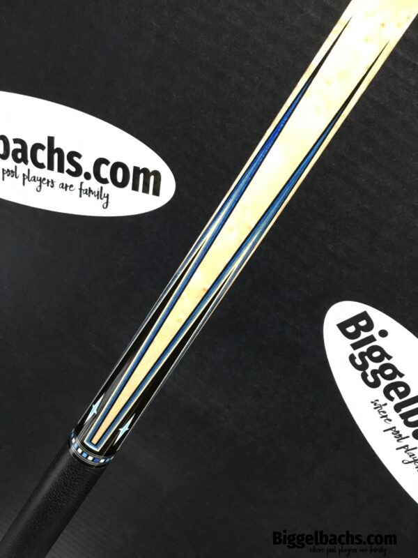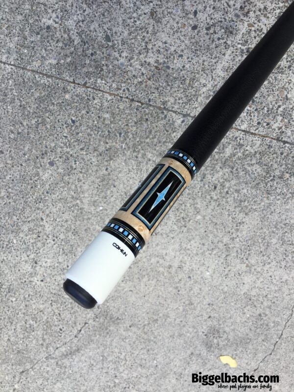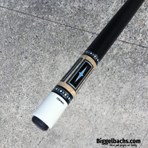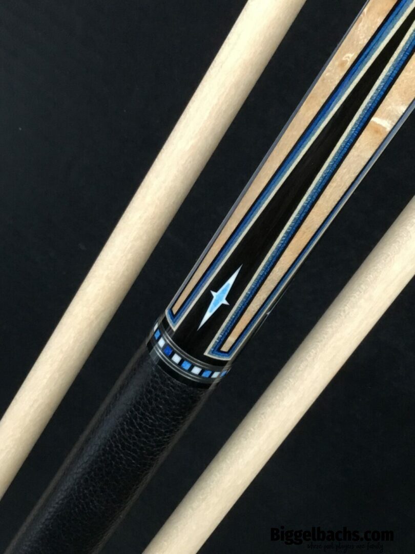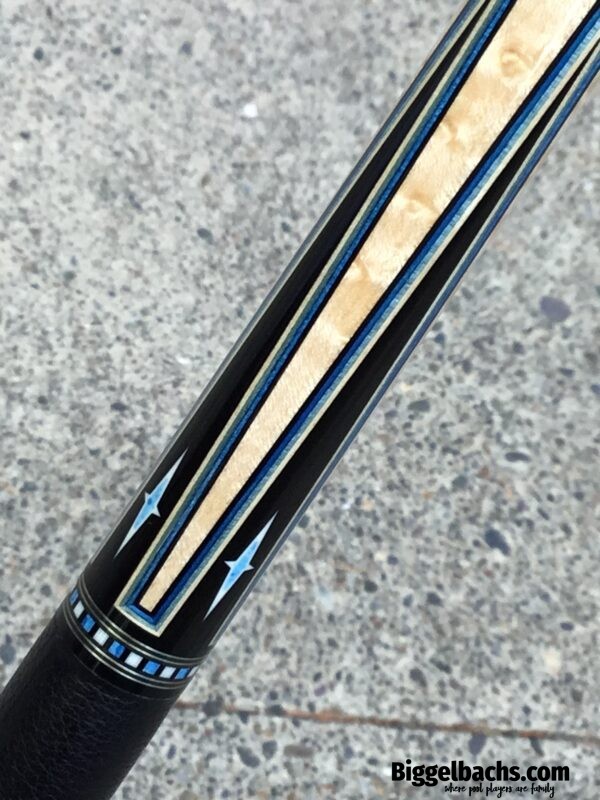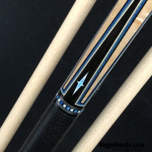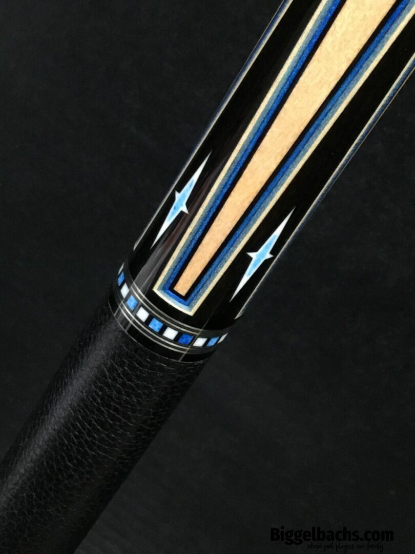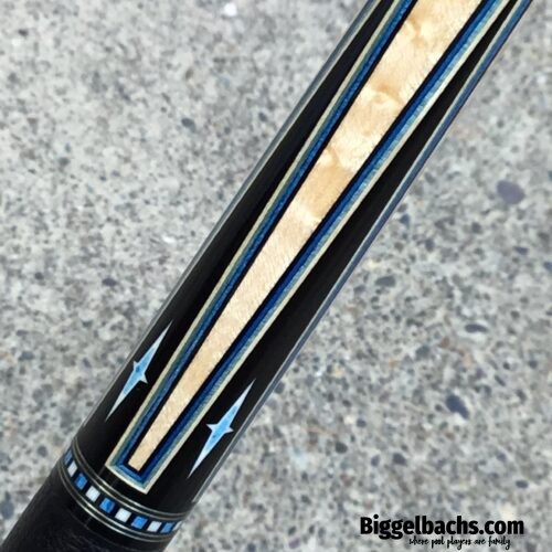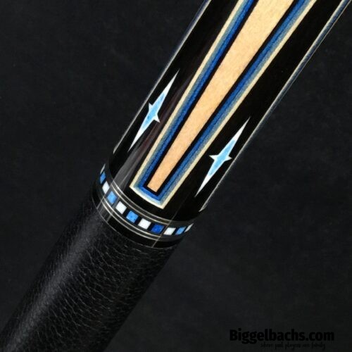 Eddie Cohen is fastly gaining a reputation as one of the premier custom cue makers in the country. This cue easily shows the reasons for the accolades he’s earning! In this stunning build he starts with a clean, gorgeous piece of maple for the forearm, uses ebony for points and sharp contrast, then breaks things up with a combination of blue veneers dividing the points and forearm. The elongated turquoise star inlays in the points and butt sleeve, along with the matching collars and leather wrap set this design off.