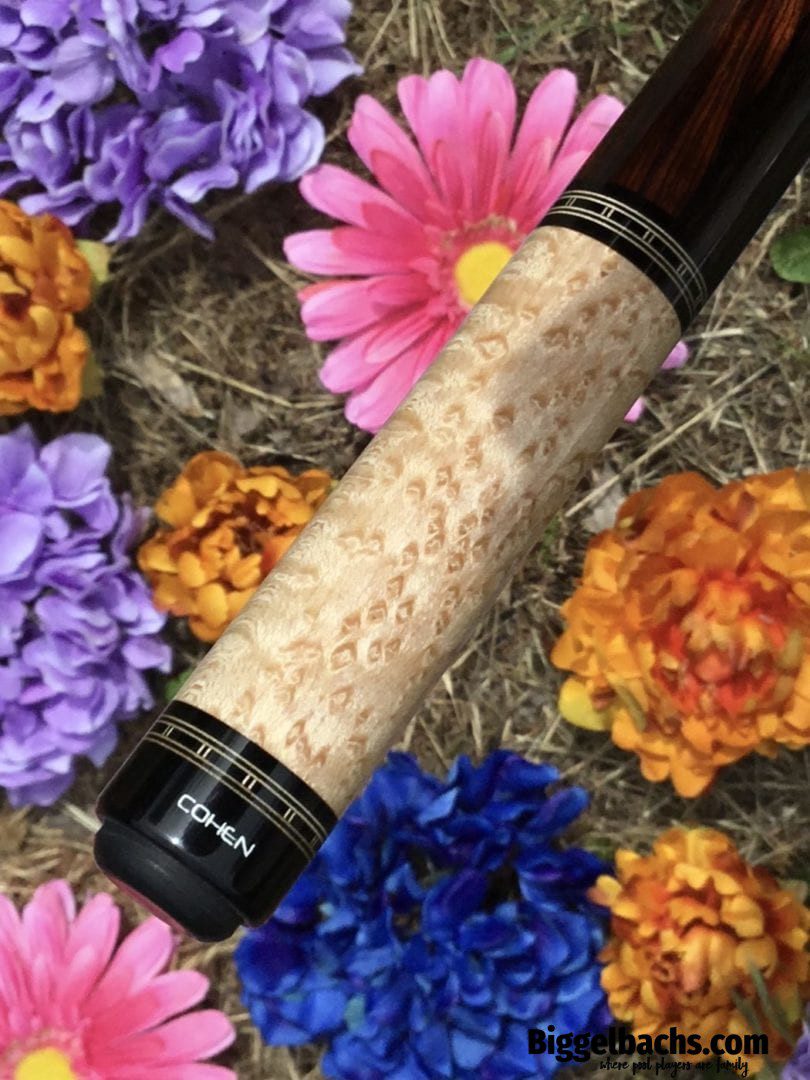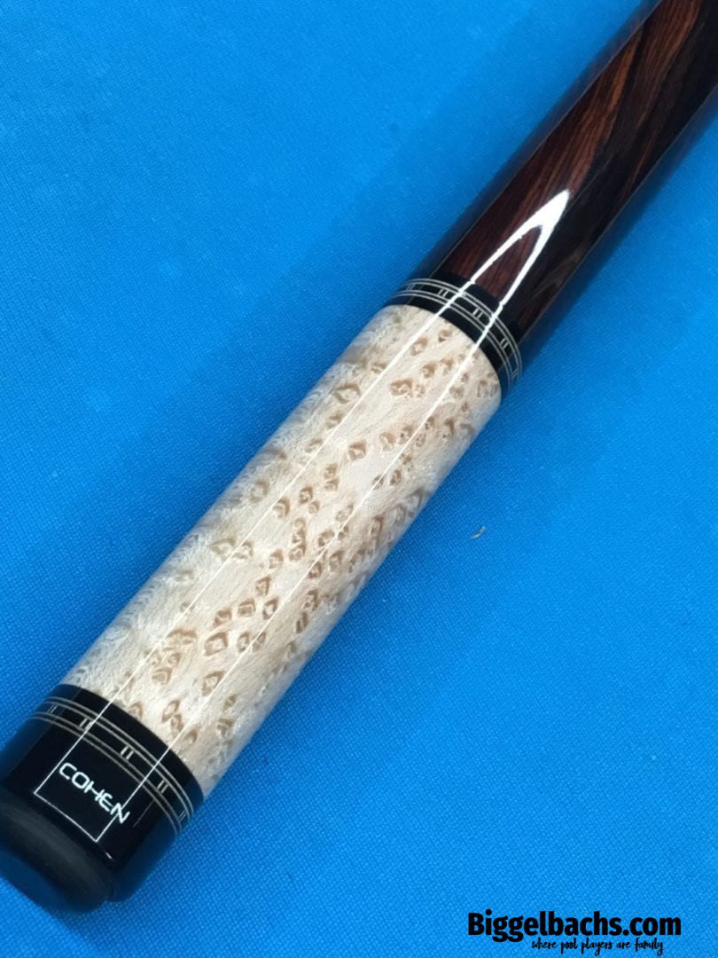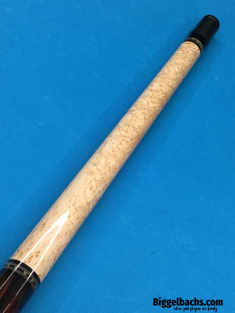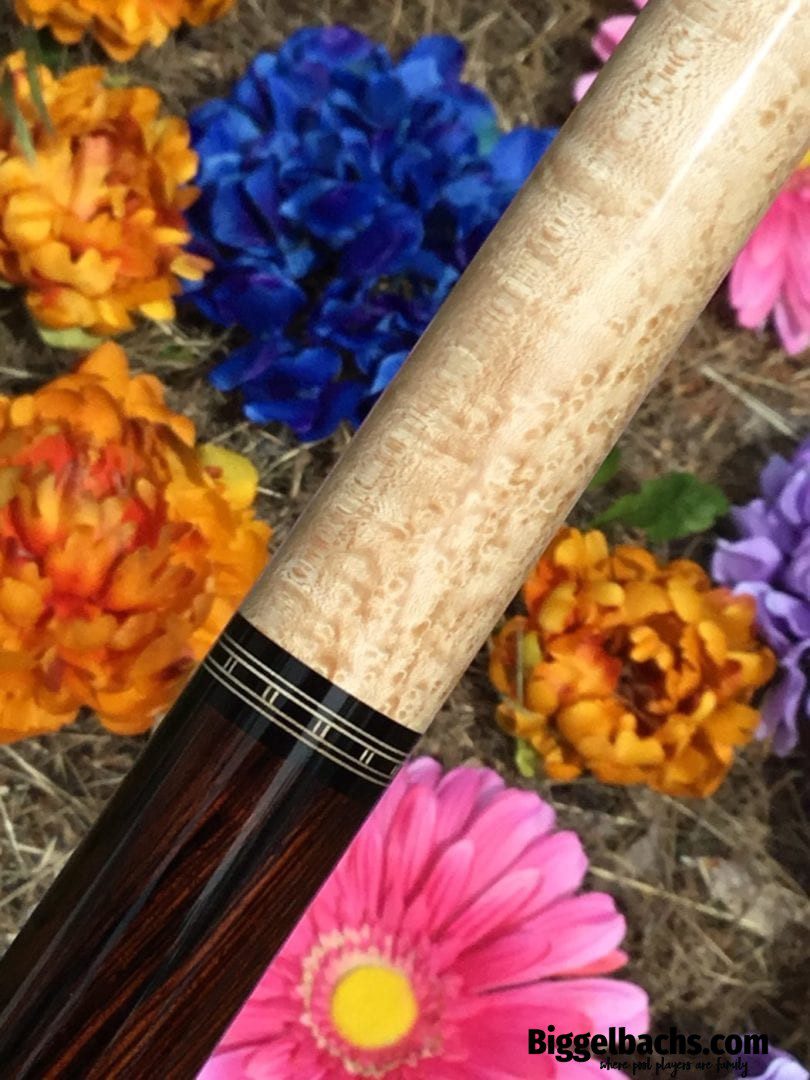 This merry widow cue built by Eddie Cohen is a show stopper. The birds eye maple is A grade level wood and the cocobolo handle is A+ color and grade also. With all the natural high grade wood and rings at all points, make this cue an amazing cue build. The cue just screams PLAY ME. Don’t let this one get away!