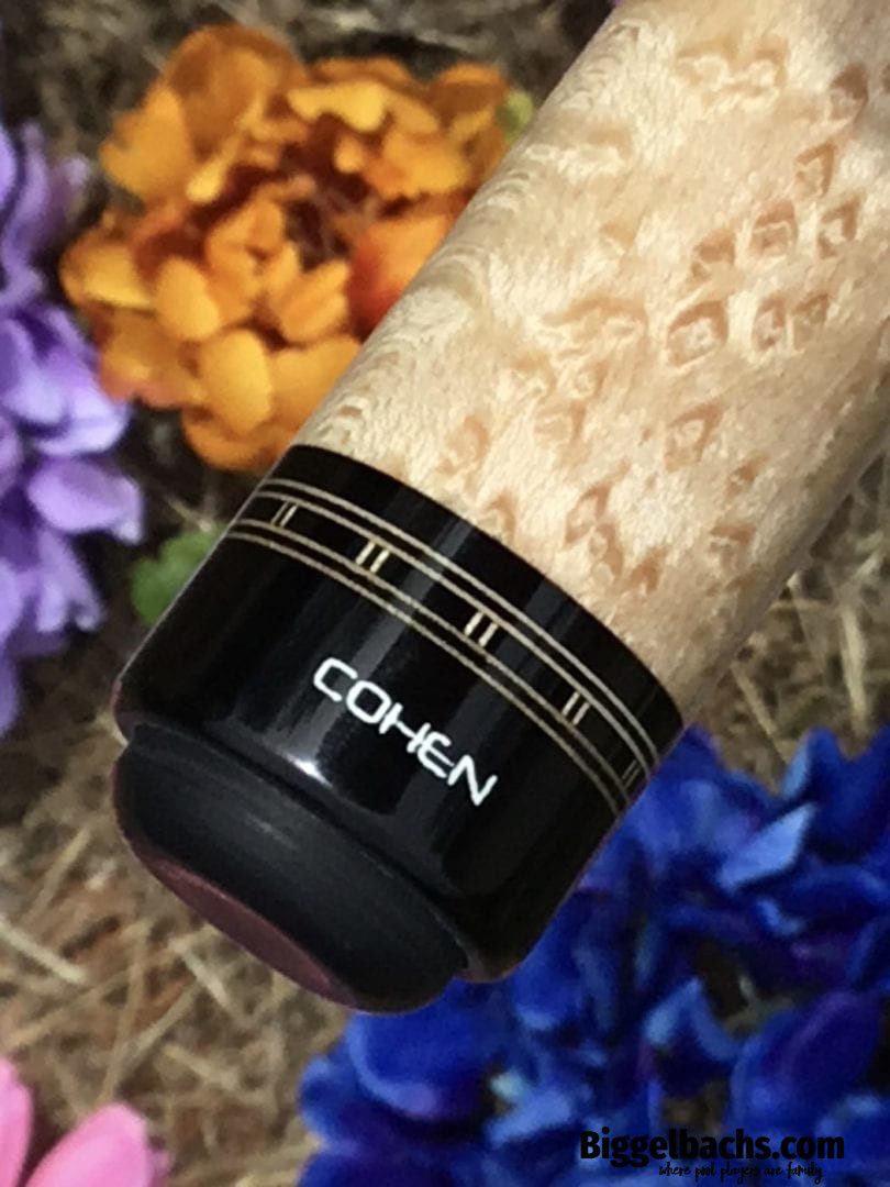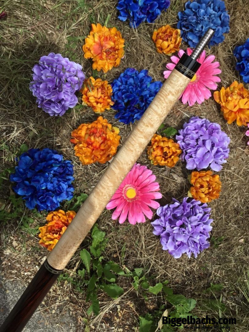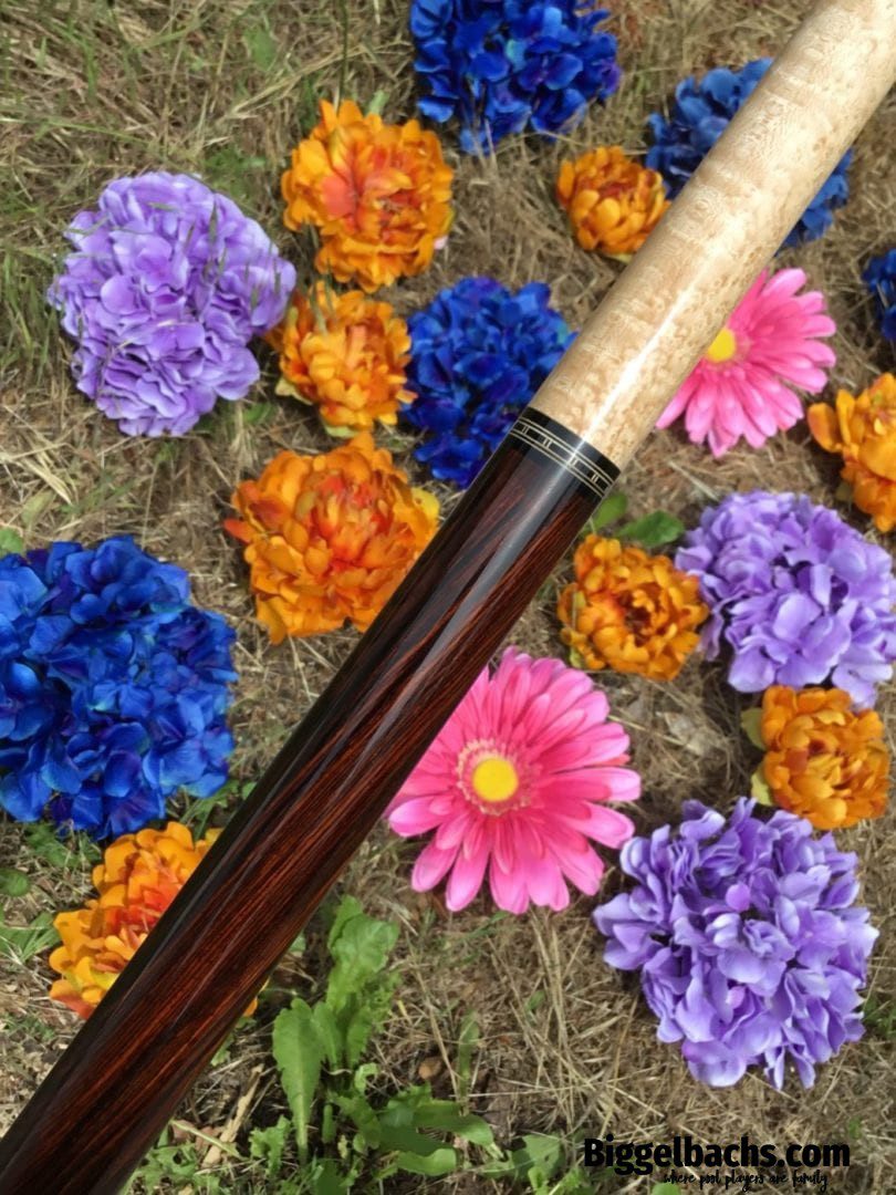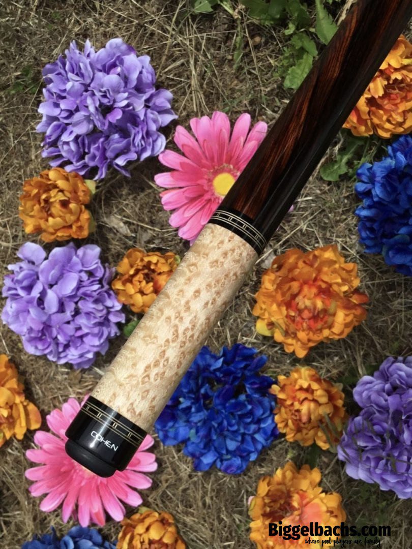 This merry widow cue built by Eddie Cohen is a show stopper. The birds eye maple is A grade level wood and the cocobolo handle is A+ color and grade also. With all the natural high grade wood and rings at all points, make this cue an amazing cue build. The cue just screams PLAY ME. Don’t let this one get away!