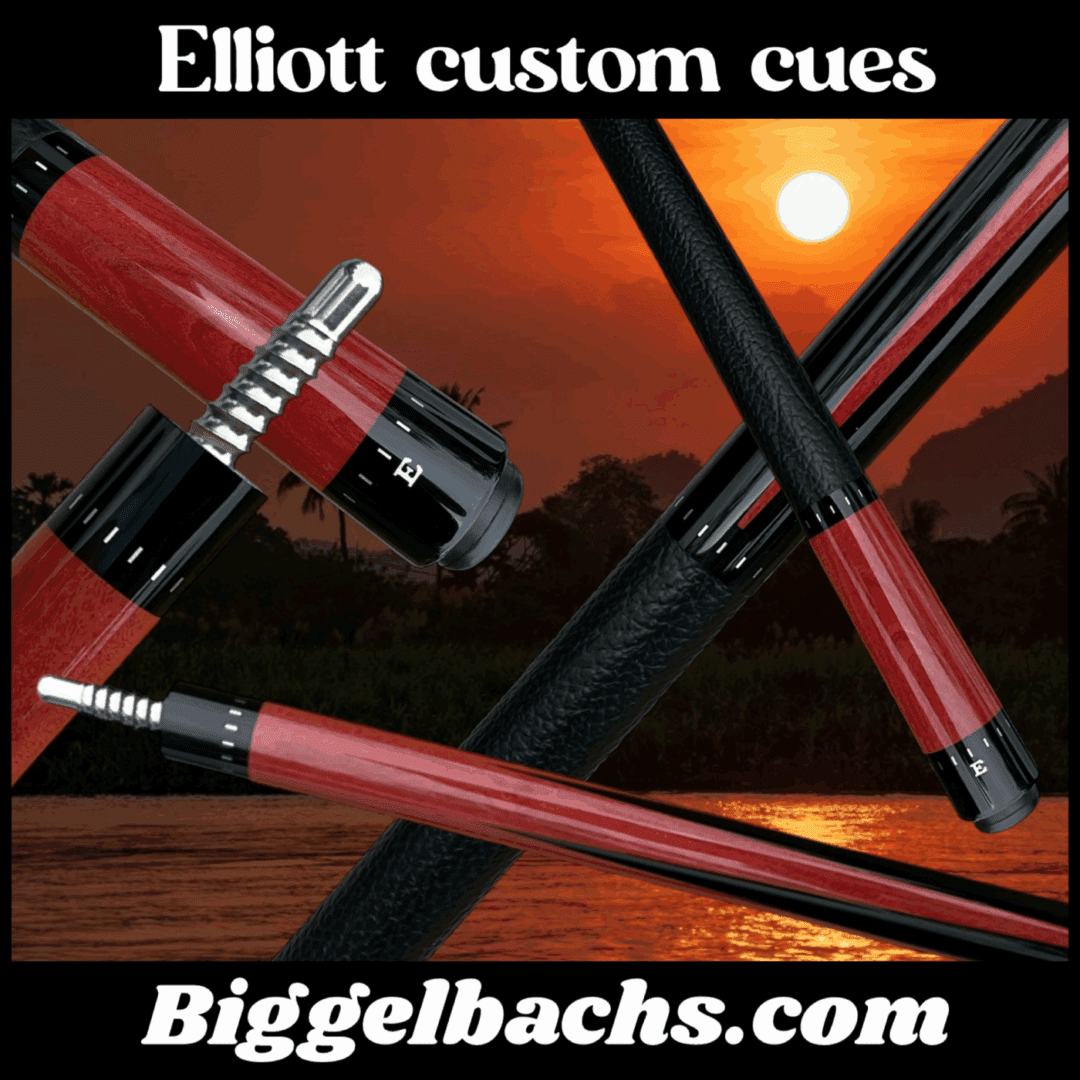 Up for grabs is this brand new unplayed Elliott cue. This 19.2 oz cue features a leather wrap and 4 beautiful black points. It comes in a 58″ Length and has a phenolic joint. The Radial pin on the joint helps to give it an excellent hit.