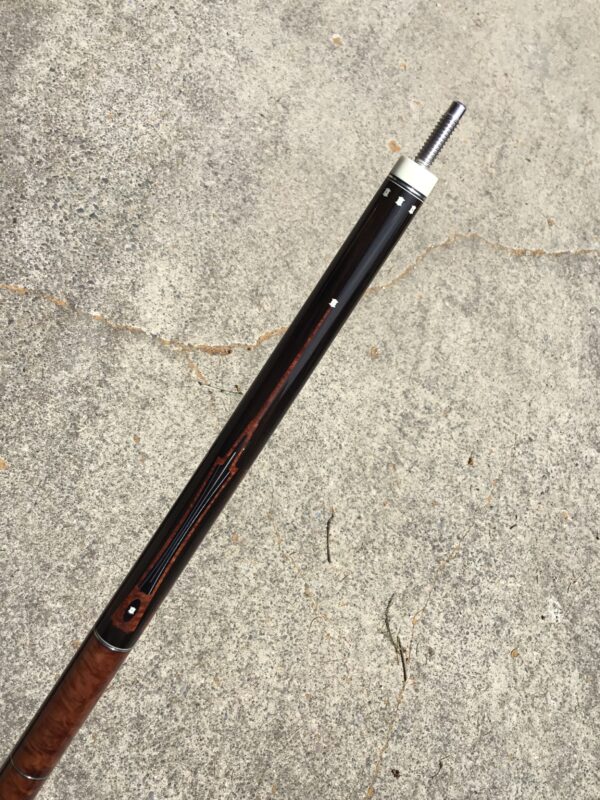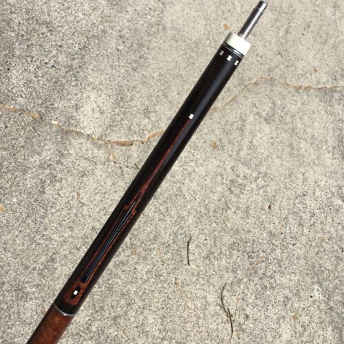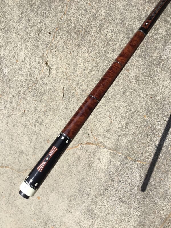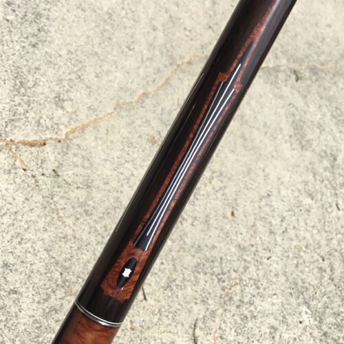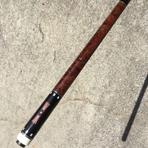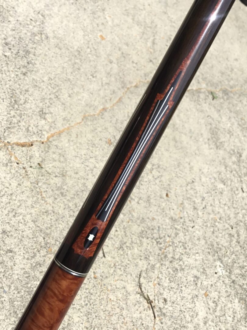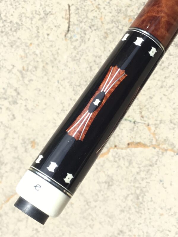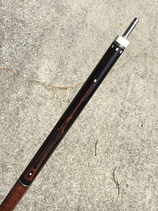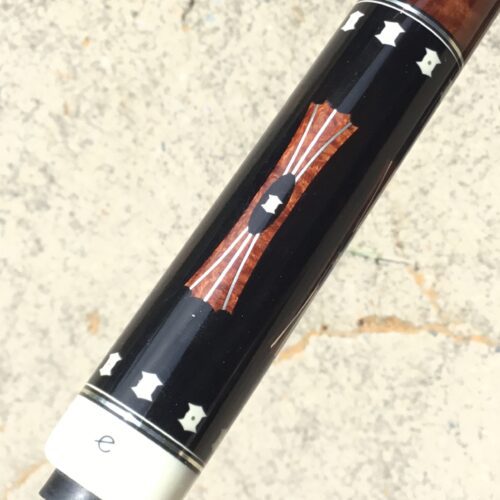 There is a ton of intricate work and detailed craftsmanship in this incredible Esoteric Custom Cue. The floating burl points are inlaid with ivorine and accented with silver.