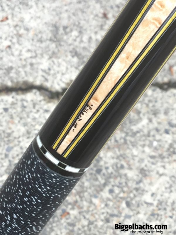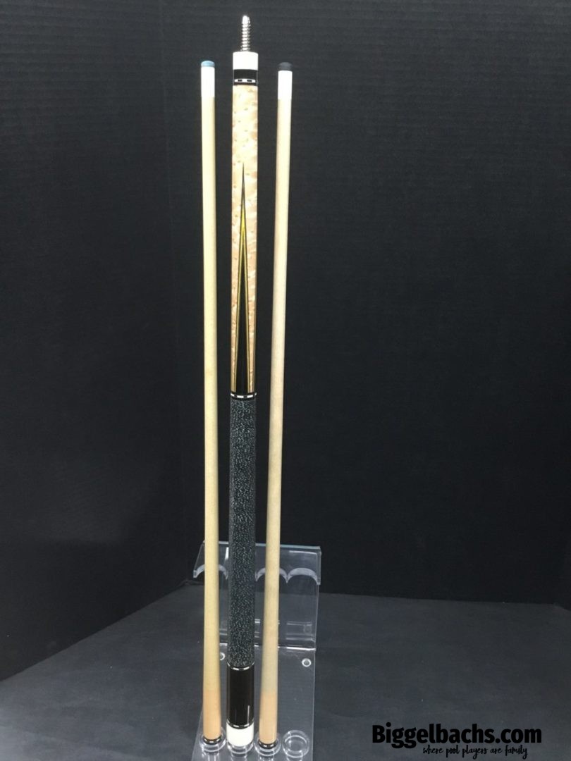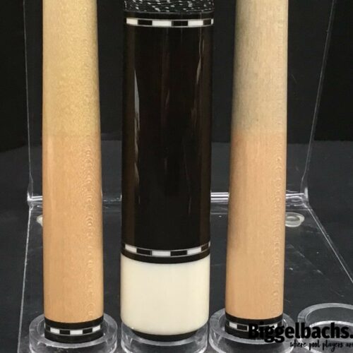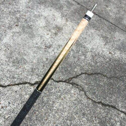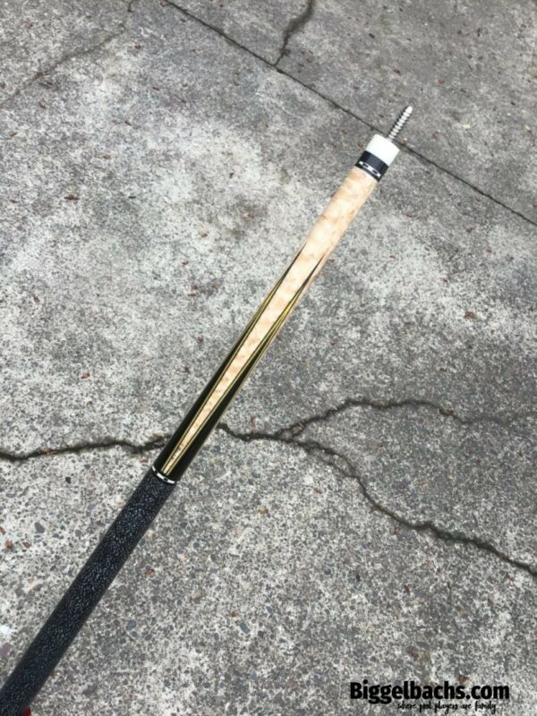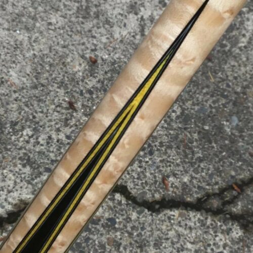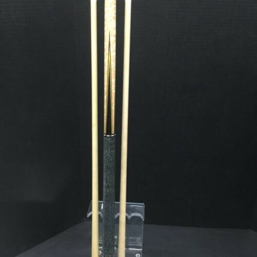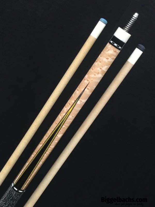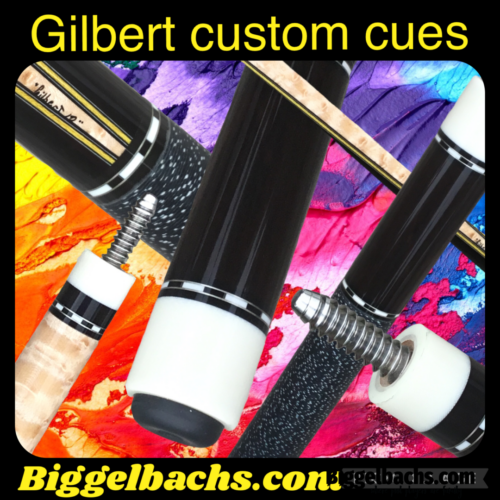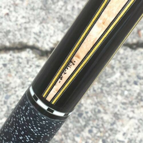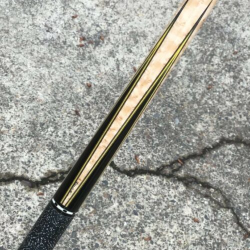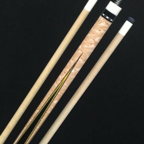 Beautiful and affordable Gilbert custom cue. This pool cue boasts a maple forearm with ebony points and both sleeve. It is complimented with attractive yellow veneers that alternate with ebony.