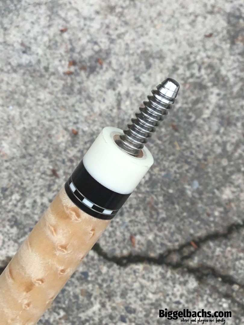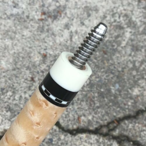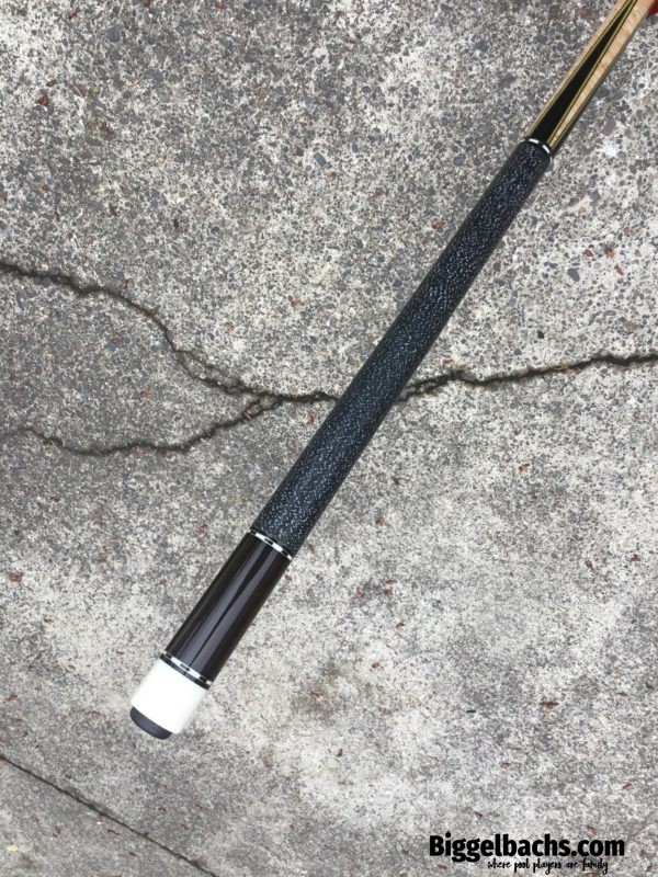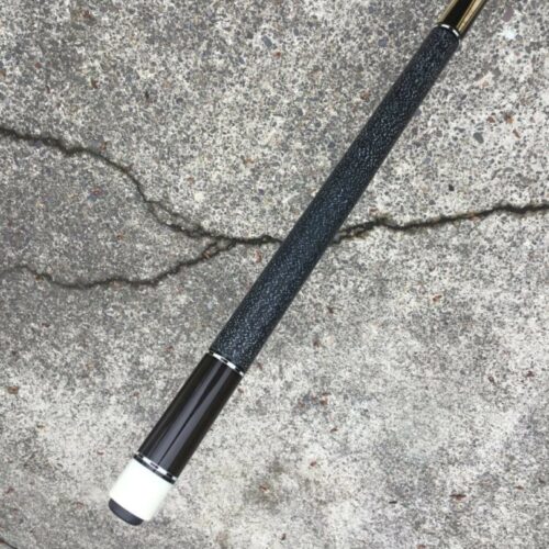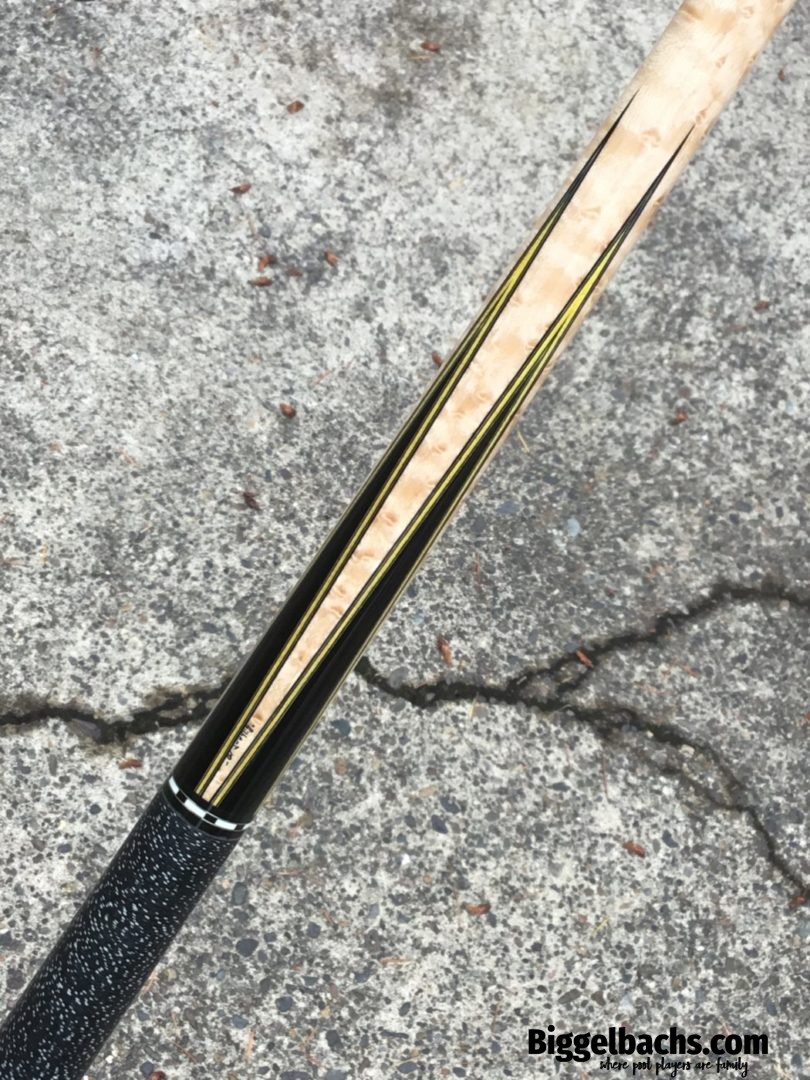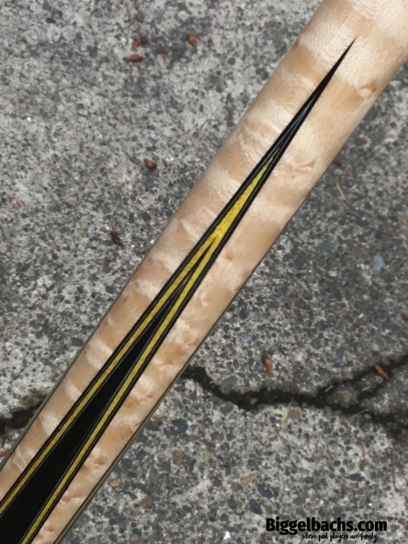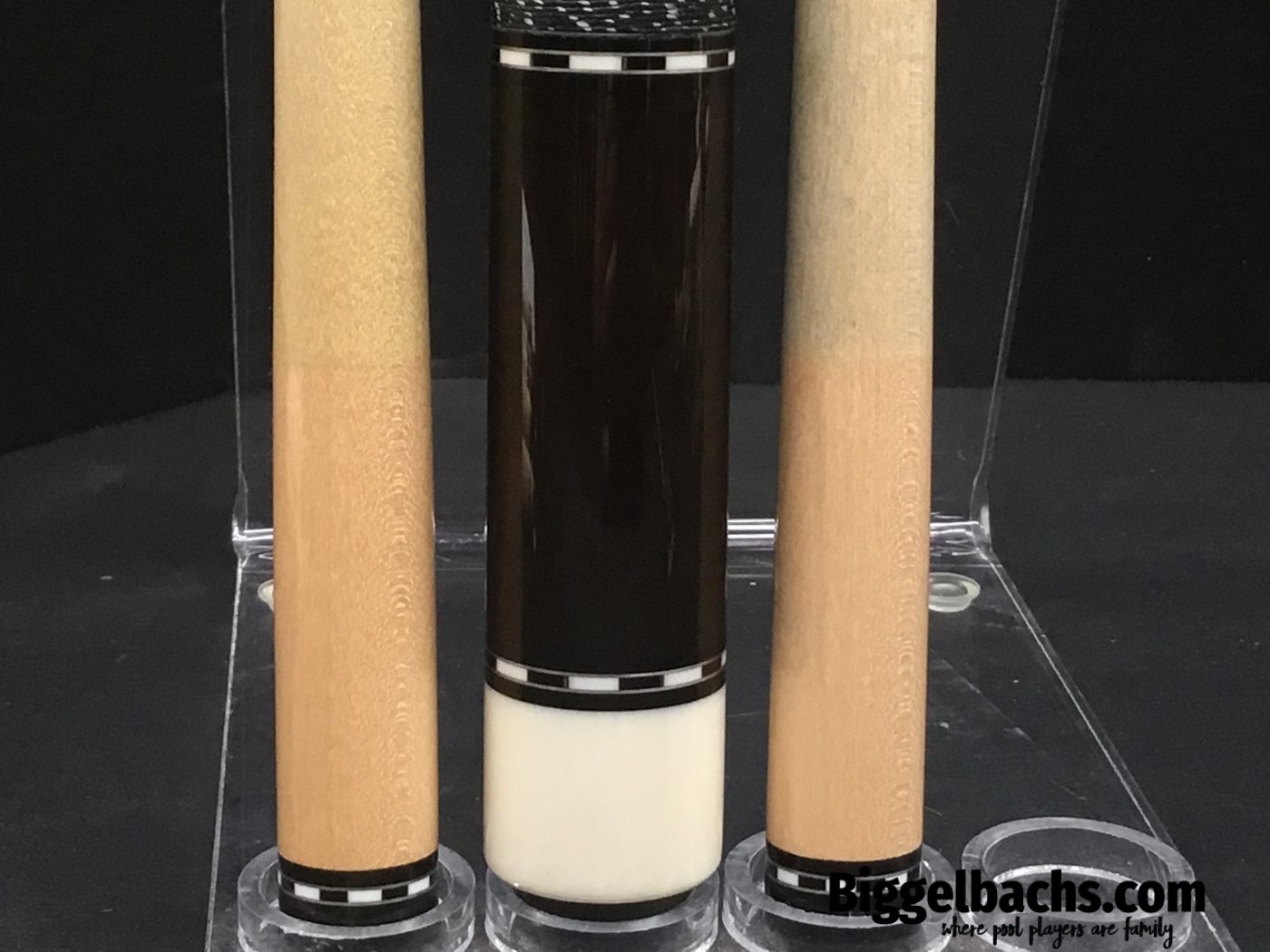 Beautiful and affordable Gilbert custom cue. This pool cue boasts a maple forearm with ebony points and both sleeve. It is complimented with attractive yellow veneers that alternate with ebony.
