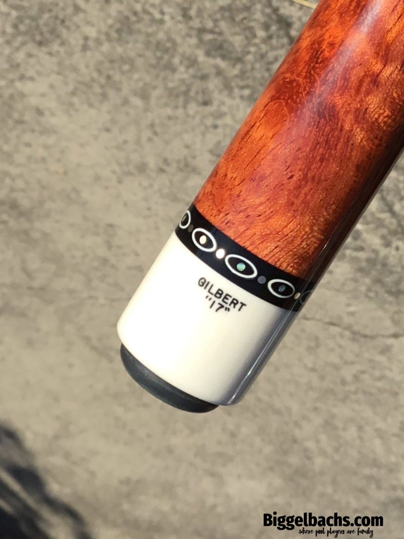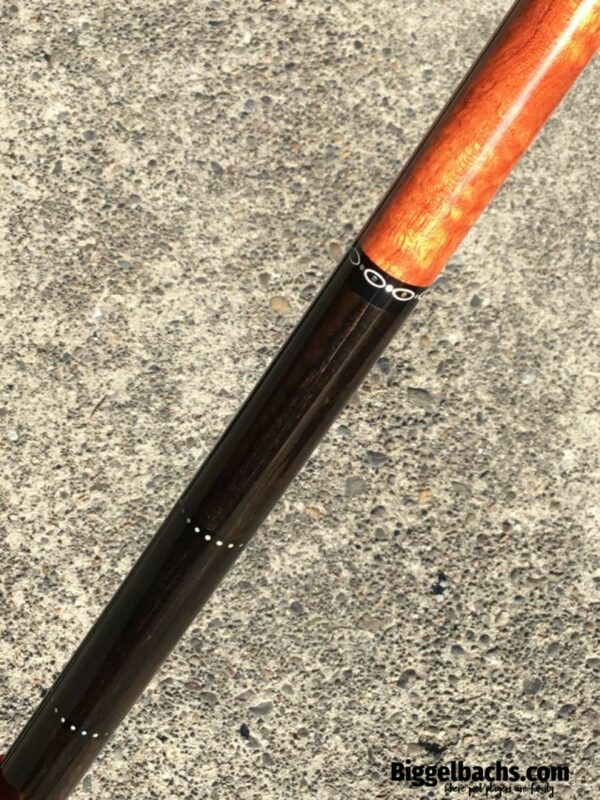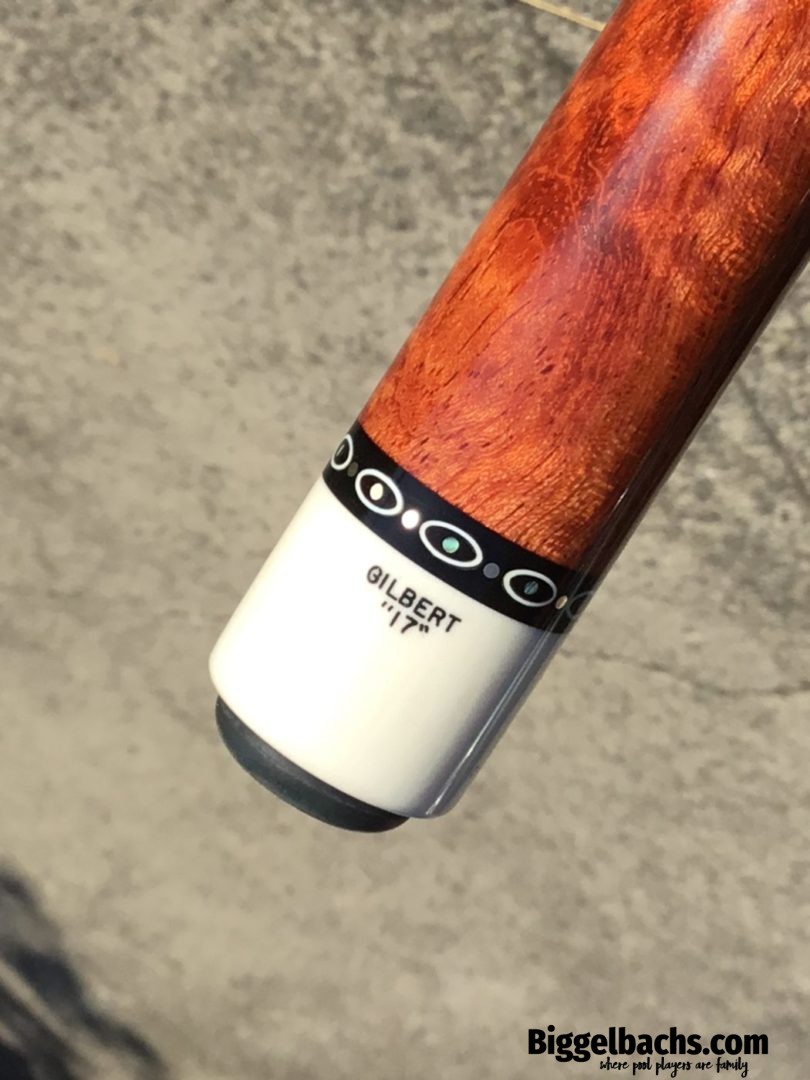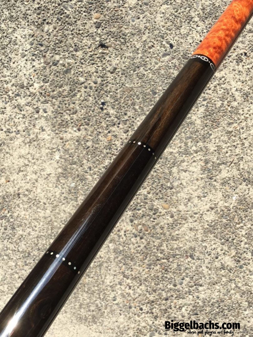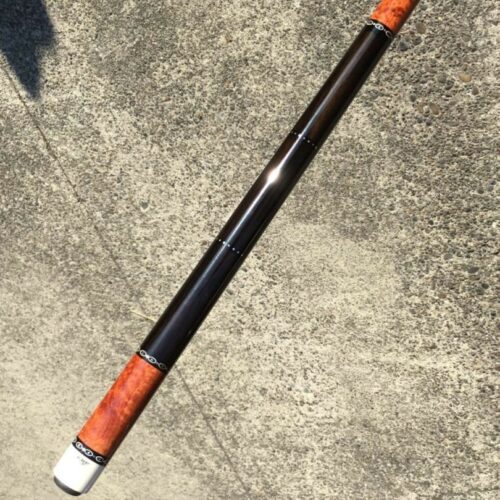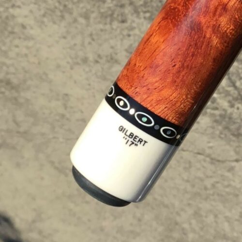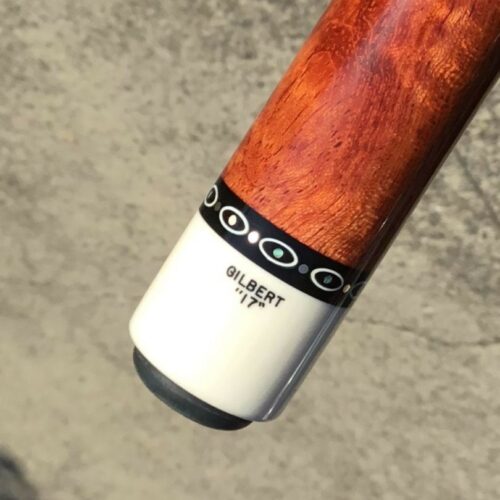Absolutely stunning no wrap Andy Gilbert cue with unique collar design. This 2017 gem is in near mint condition and even comes with matching joint protectors. The intricate collars and inlays perfectly compliment the burl and ebony “canvas” of this work of art!