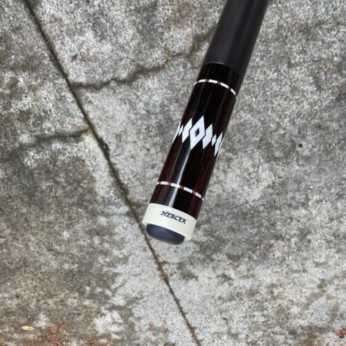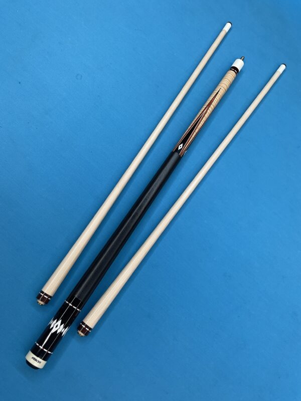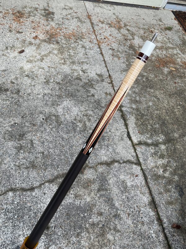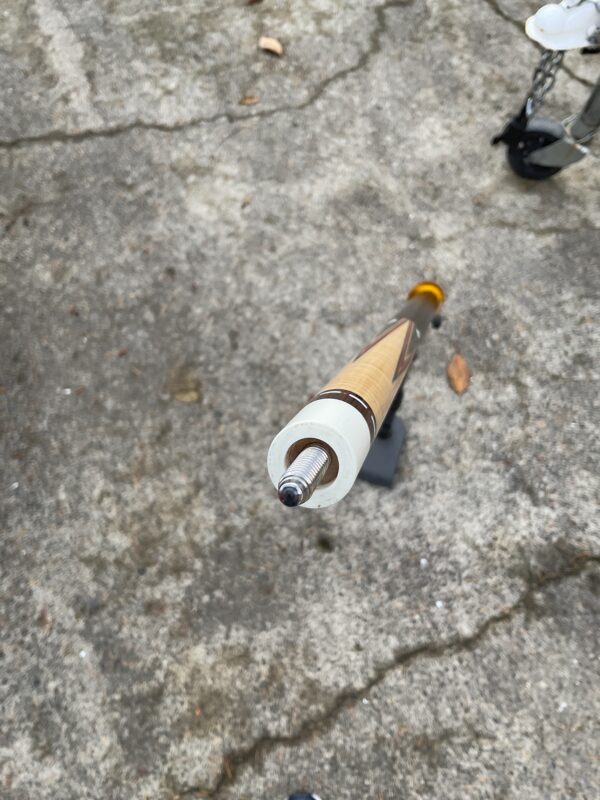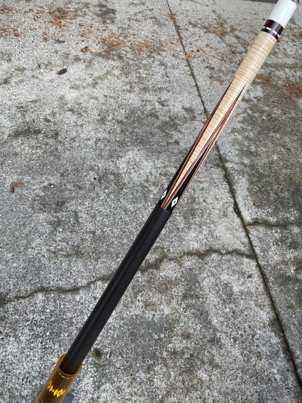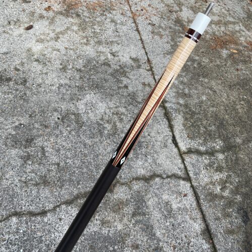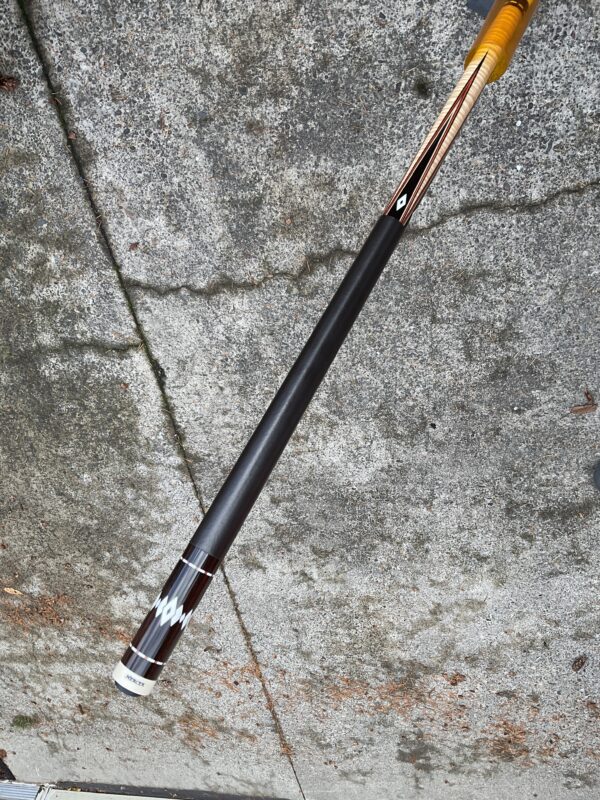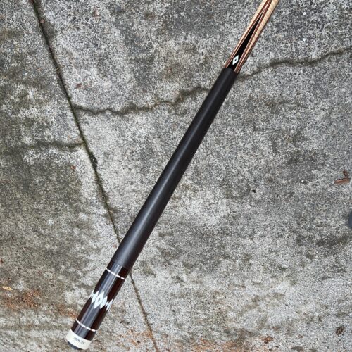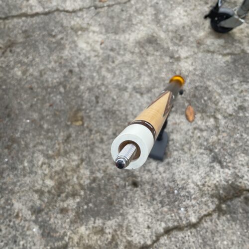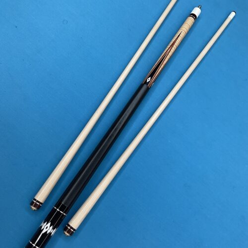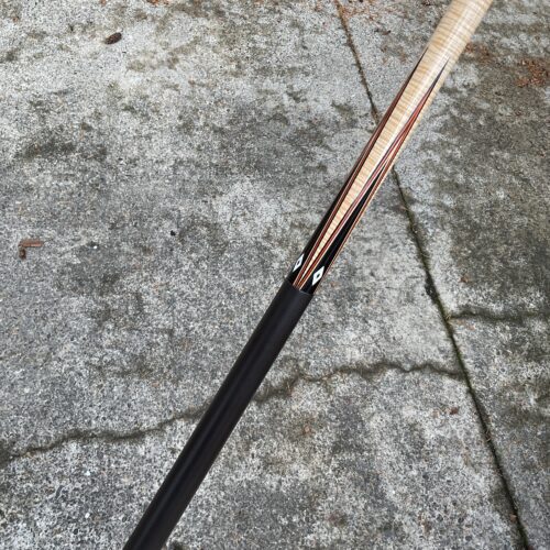 This excellent condition cue by Joel Hercek is an eye catching beauty featuring a natural joint, and orange veneers. It weighs 18.6 oz together, with a butt weight of 14.7 oz and a combined length of 57.5″. It features a 12.85 mm tip at 3.9 oz, and a 12.8 oz shaft at 3.9 oz on a standard ferrule. It is offers a leather wrap and a 5/16-14 joint pin. The all natural joint gives this cue a beautiful sounding hit.