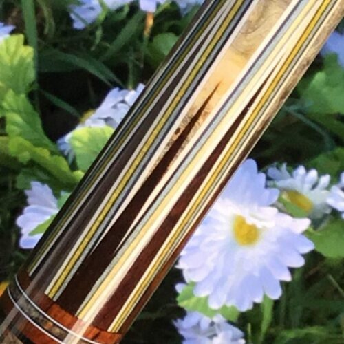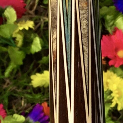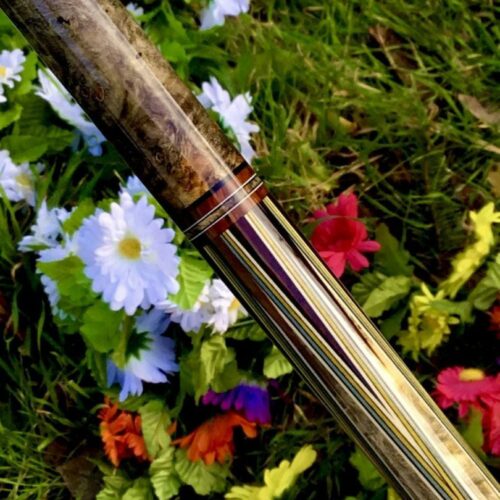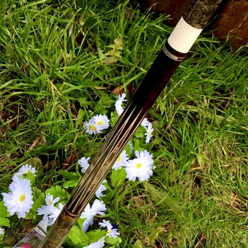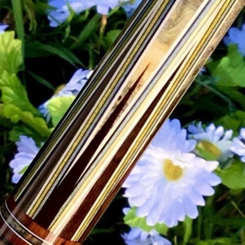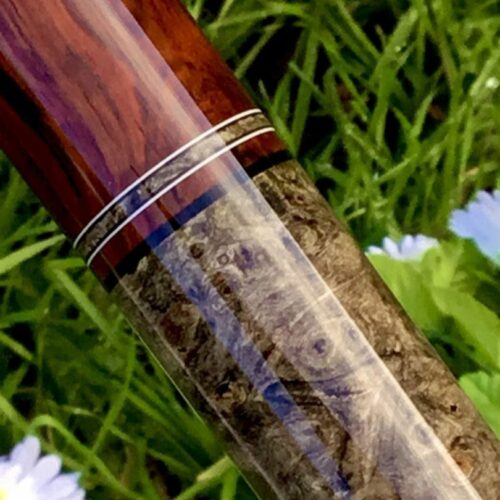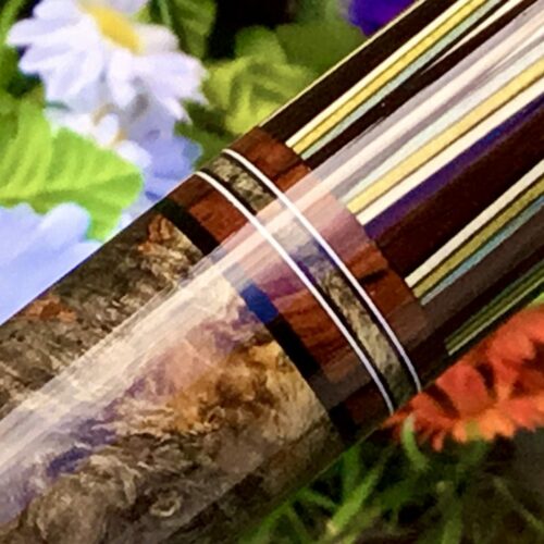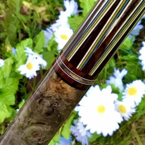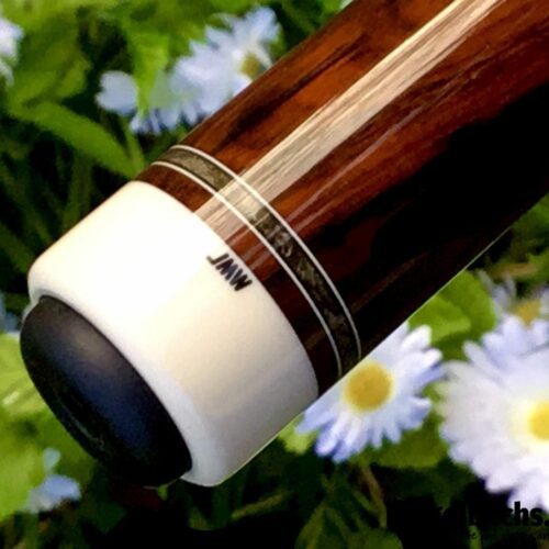 Here is a very unique design by James White. This stunning cue handle is buckeye burl, forearm is Brazilian Rosewood with 15 points surrounded by 7 veneers. This cue comes with custom joint protectors and a JB matching 1×2 custom case. This cue will not disappoint any cue enthusiast.