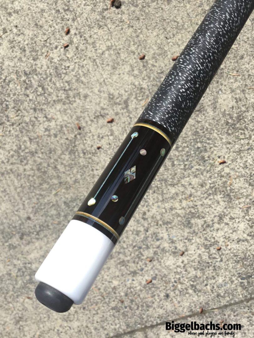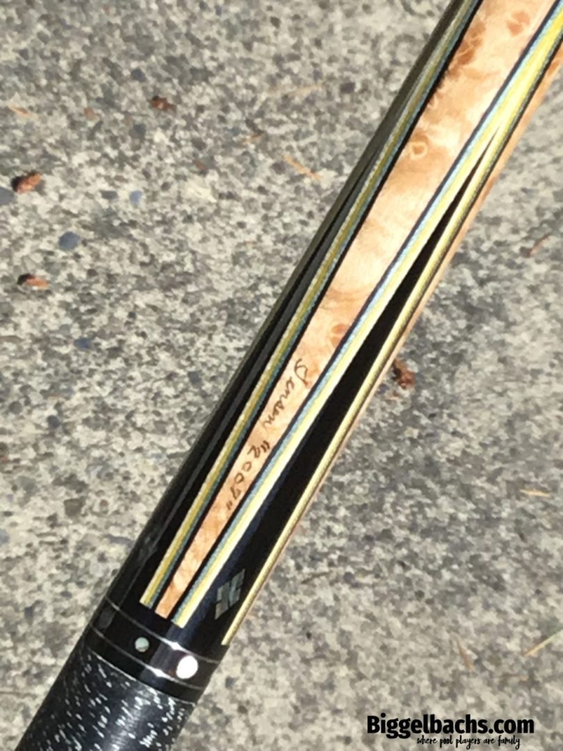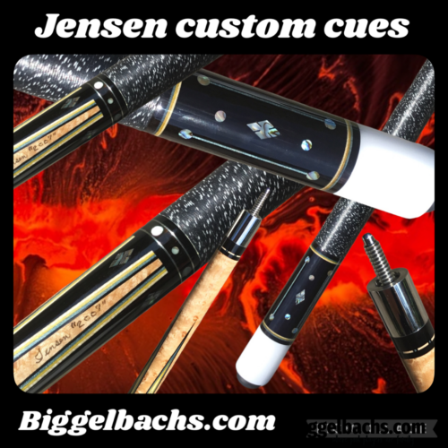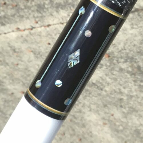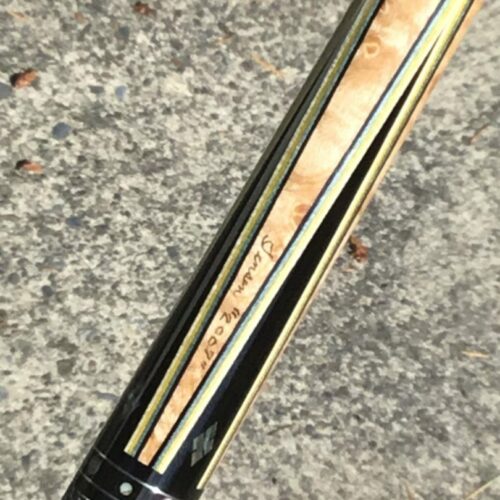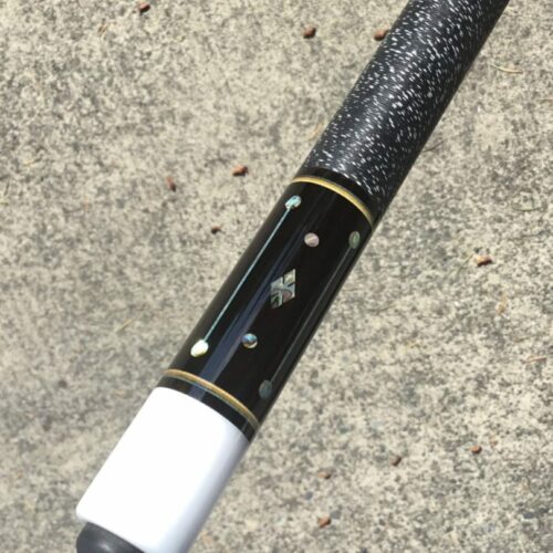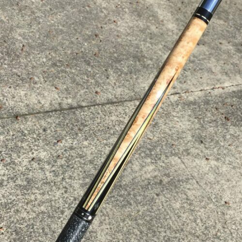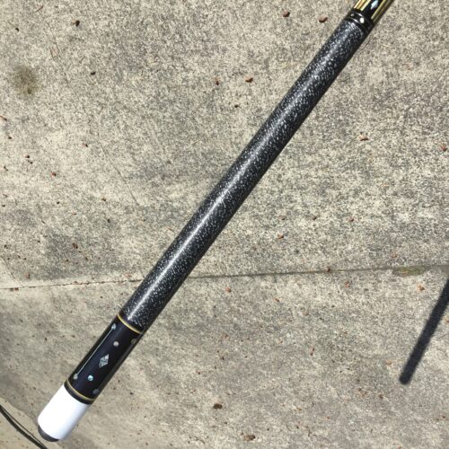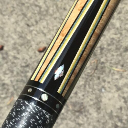 This Jensen custom cue won’t disappoint! It is a traditional build in like new condition. The cue boasts a maple forearm with four ebony points outlined by four handsome veneer colors that compliment beautiful abalone inlays in the points and collar rings.