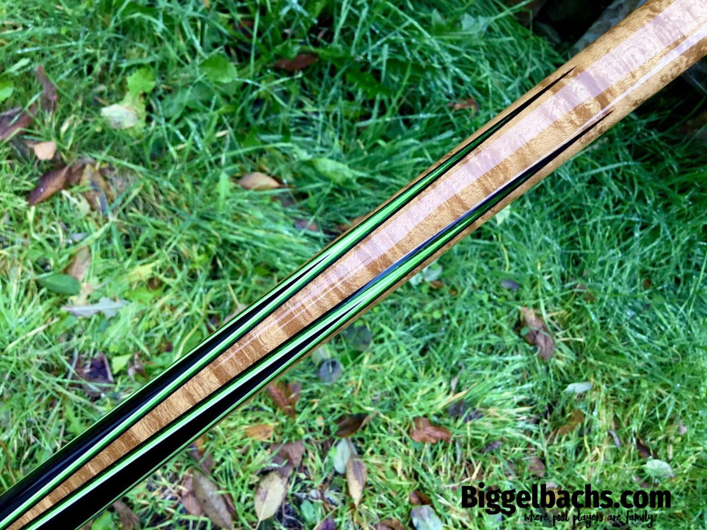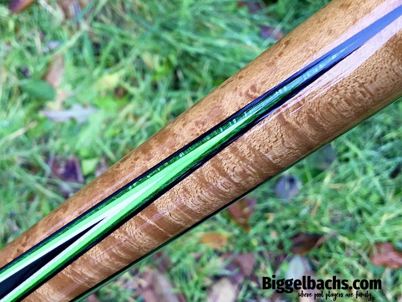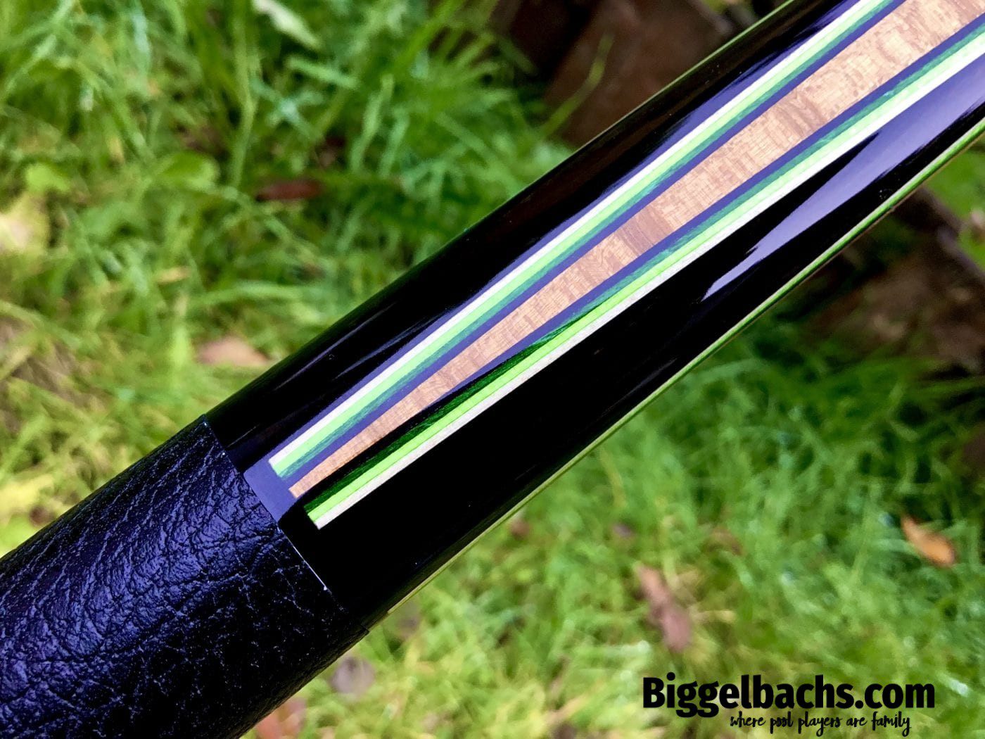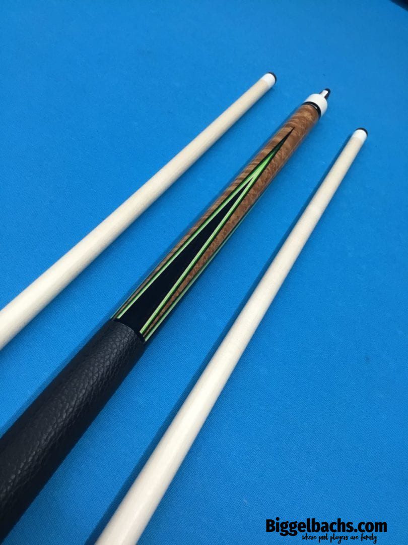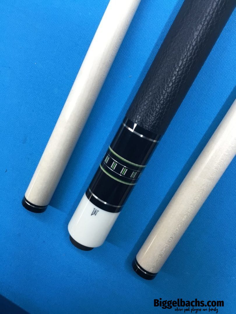 Brand new cue and design by Jim Pierce. Jet black ebony butt sleeve with unique design. Kielwood forearm with ebony points surrounded by four veneers. This green beauty has a classic yet simple look that fits in any cue collection.