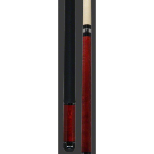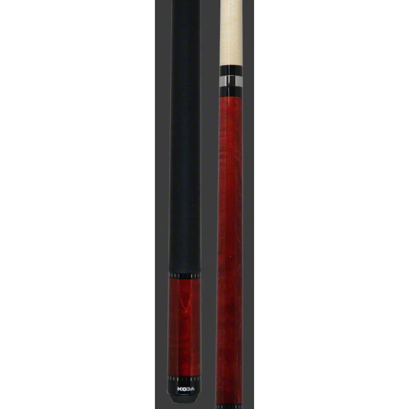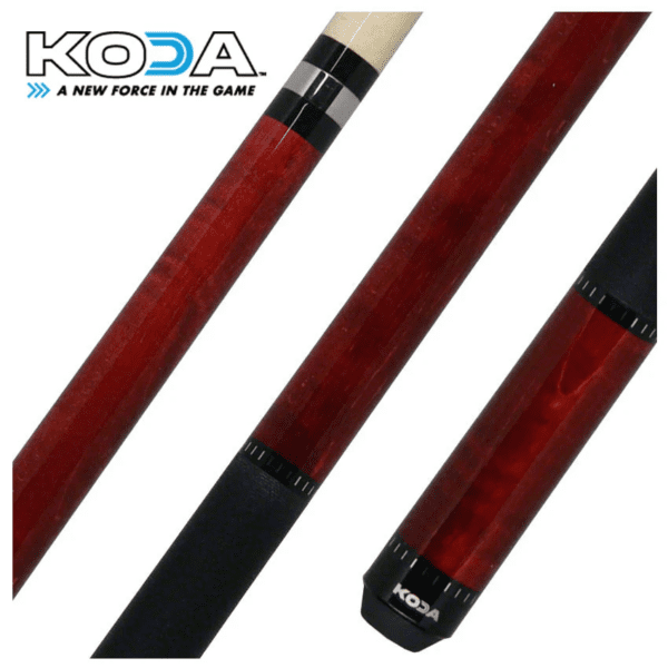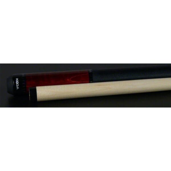 Koda KD31 Pool Cue – Featuring a striking crimson red curly maple forearm and butt sleeve, paired with a sleek black linen wrap for a bold and comfortable playing experience.