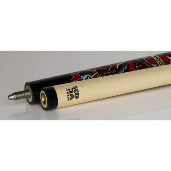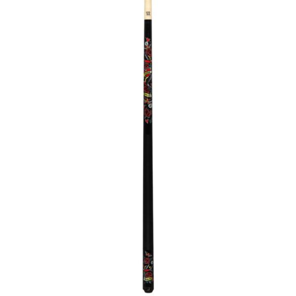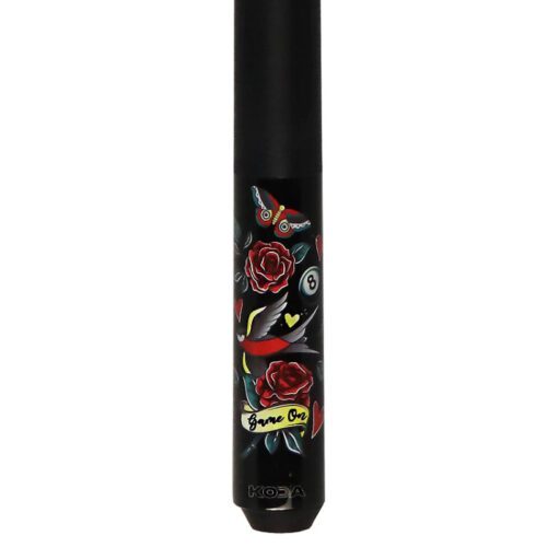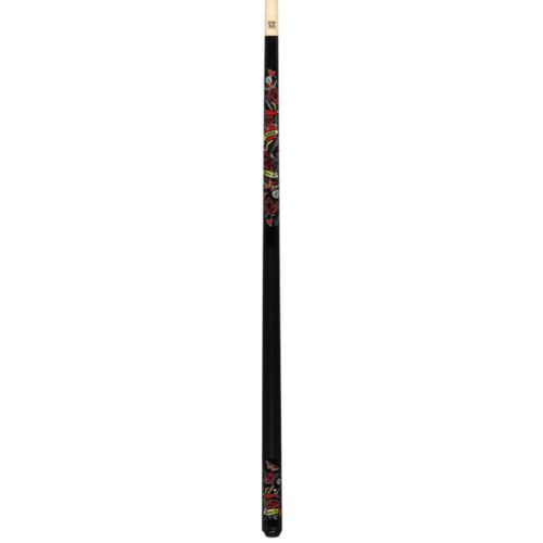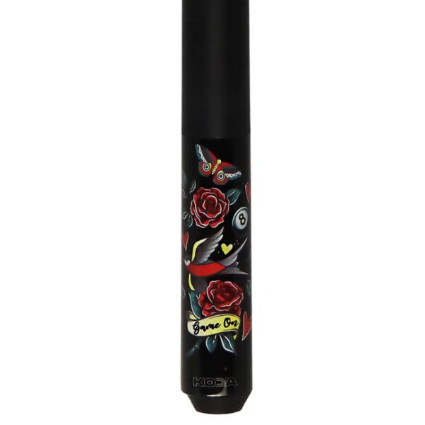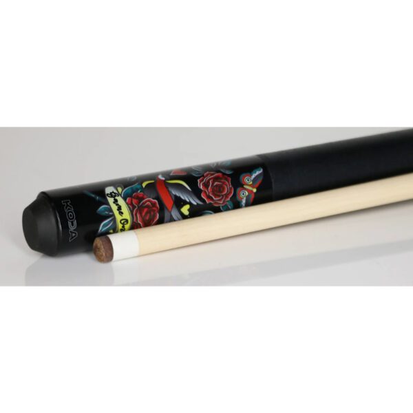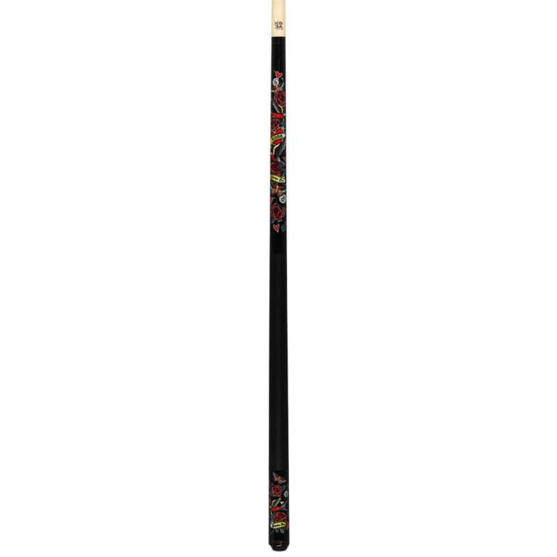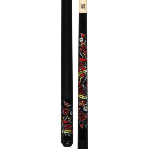 Discover the elegance of the KODA KDV20 Pool Cue, featuring a sleek metallic black design accented with striking red rose, heart, and 8-ball graphics. This premium cue is crafted for performance, complete with an all-black Irish linen wrap for a luxurious feel and a 12.50mm wood shaft with a 5/16 x 18 thread pin for exceptional control. Elevate your game in style.