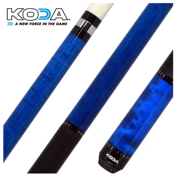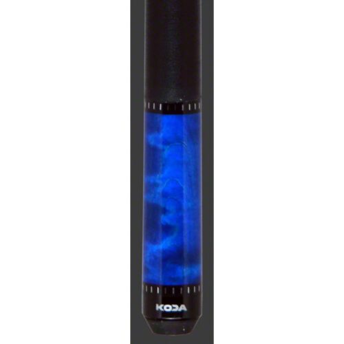 Koda KD32 Pool Cue – Showcasing a royal blue stained curly maple forearm and butt sleeve, complemented by a sleek black linen wrap for a stylish look and a comfortable grip.