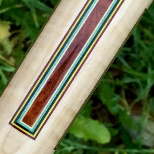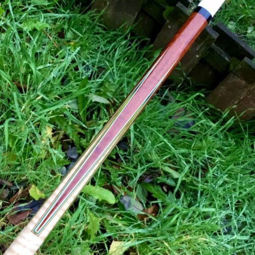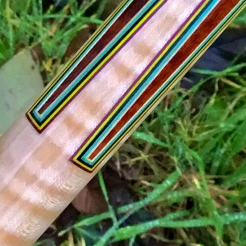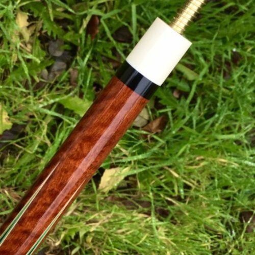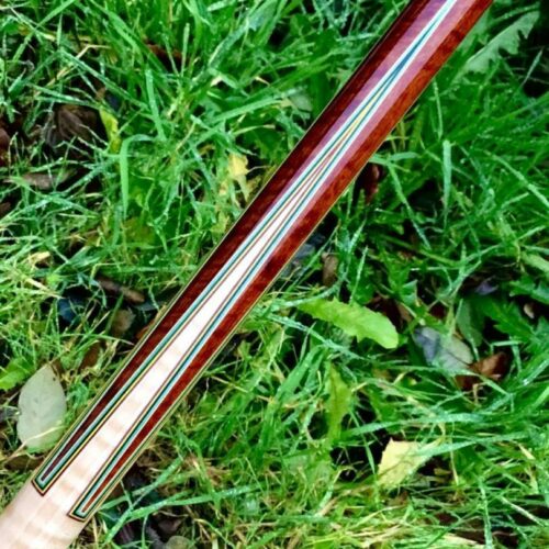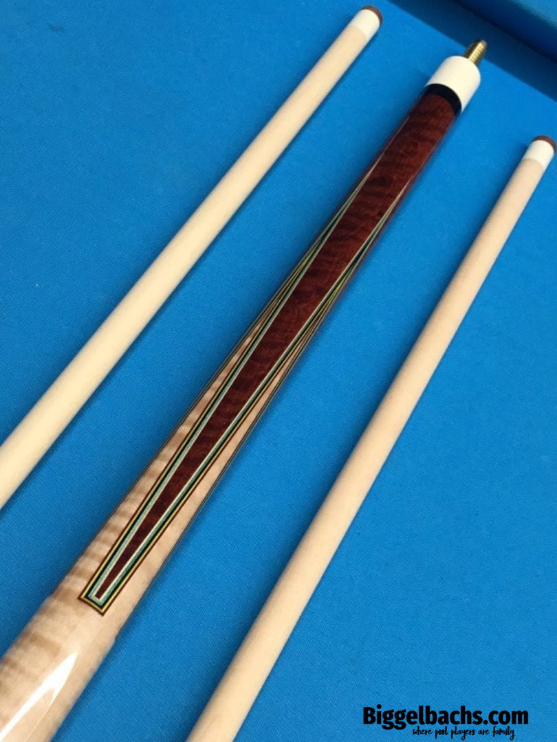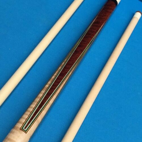 This custom cue by Larry Vigus can be described as nothing less than exquisite! Sharp points outlined by 5 veneers that both compliment and contrast against the striking fiddleback maple handle and points. A small story accompanies the exotic wood in the forearm and boxes, but all the way around, the art and craftsmanship in this pool cue give it a life of its own!