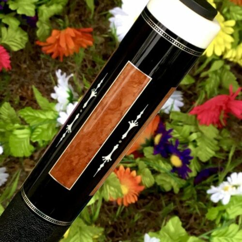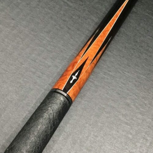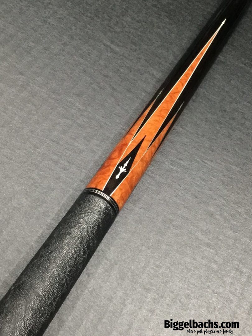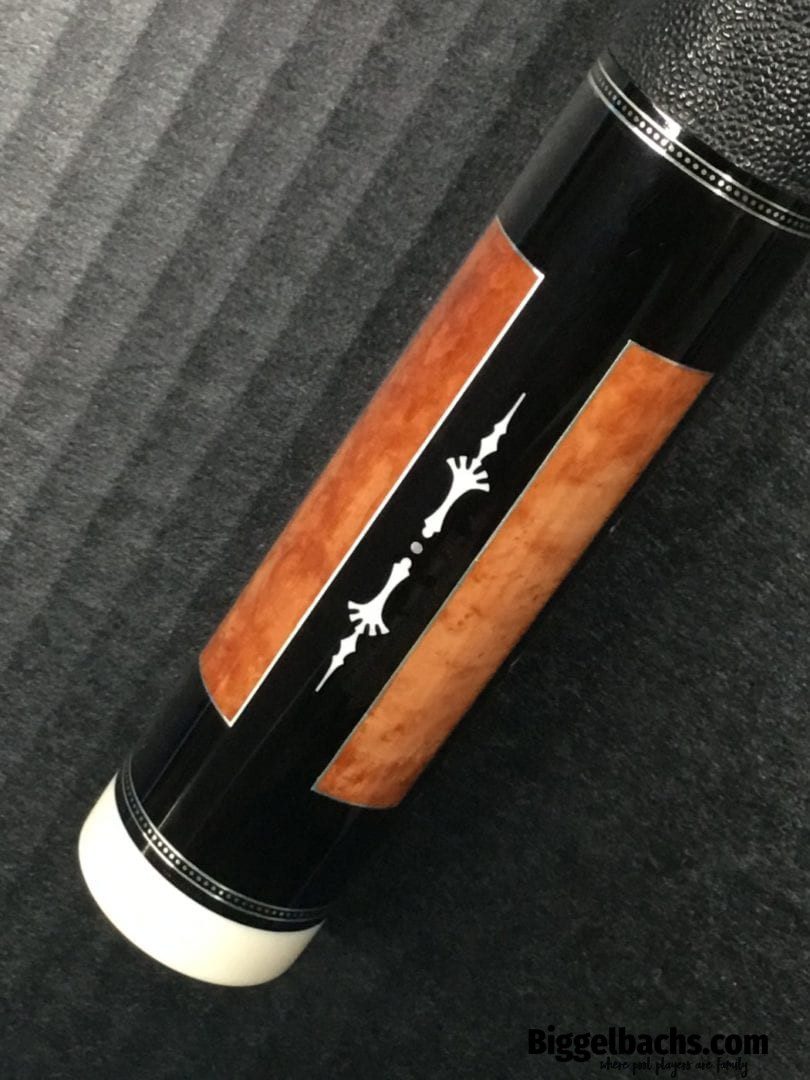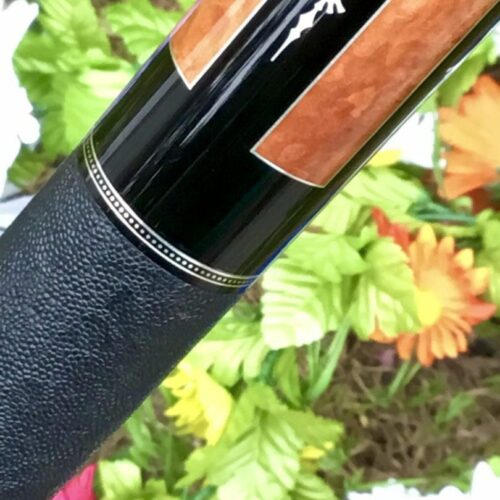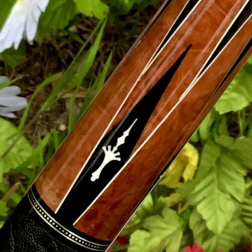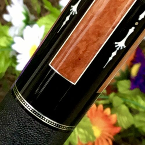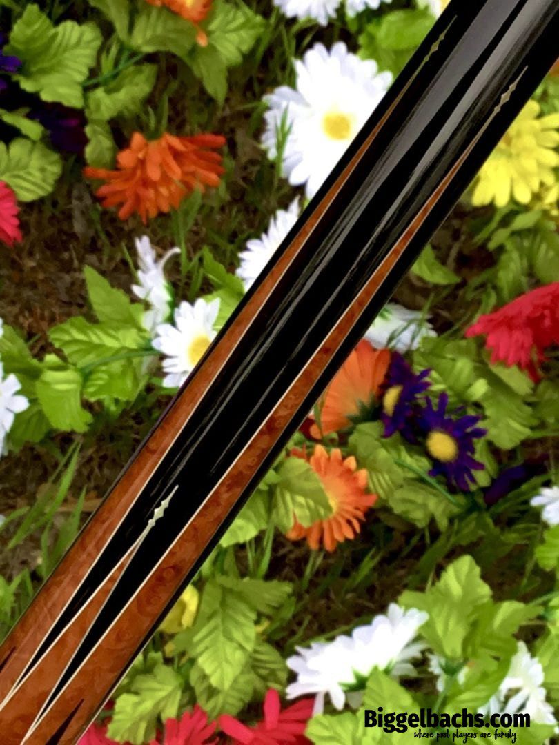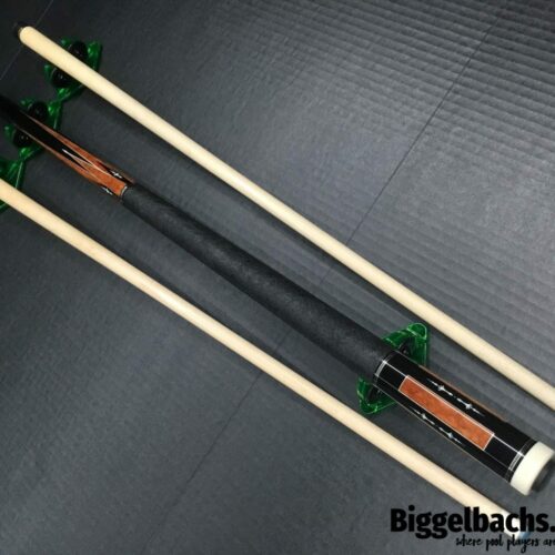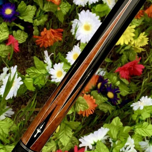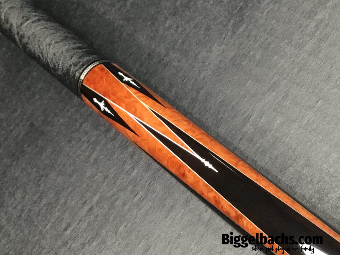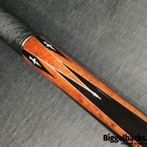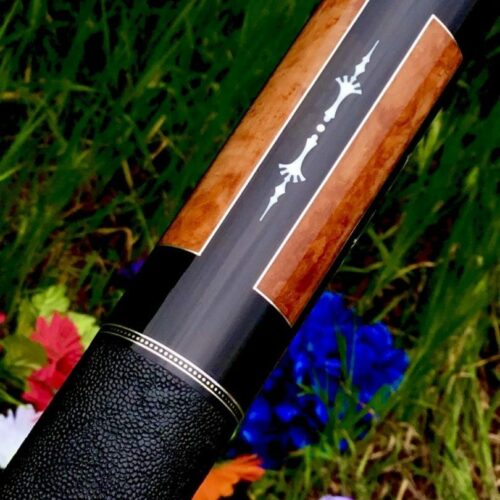 Pool cues come and go at Biggelbachs, but some stand out and say, “Look at me!” This cue offering is made by the one and only Bob Manzino. Jet black ebony with amboyna burl, silver and ivory everywhere. Special elephant ear wrap and custom joint protectors are included. This cue is an absolute monster cue.