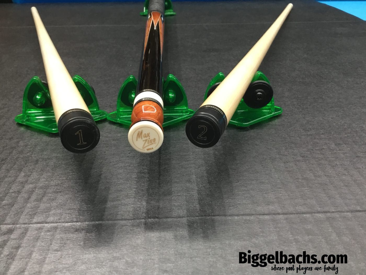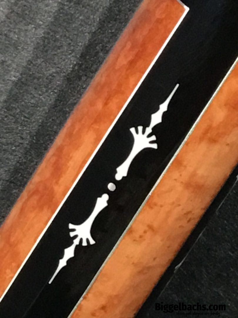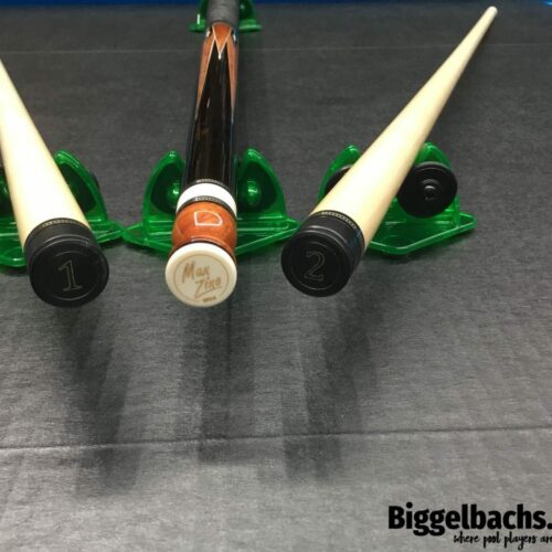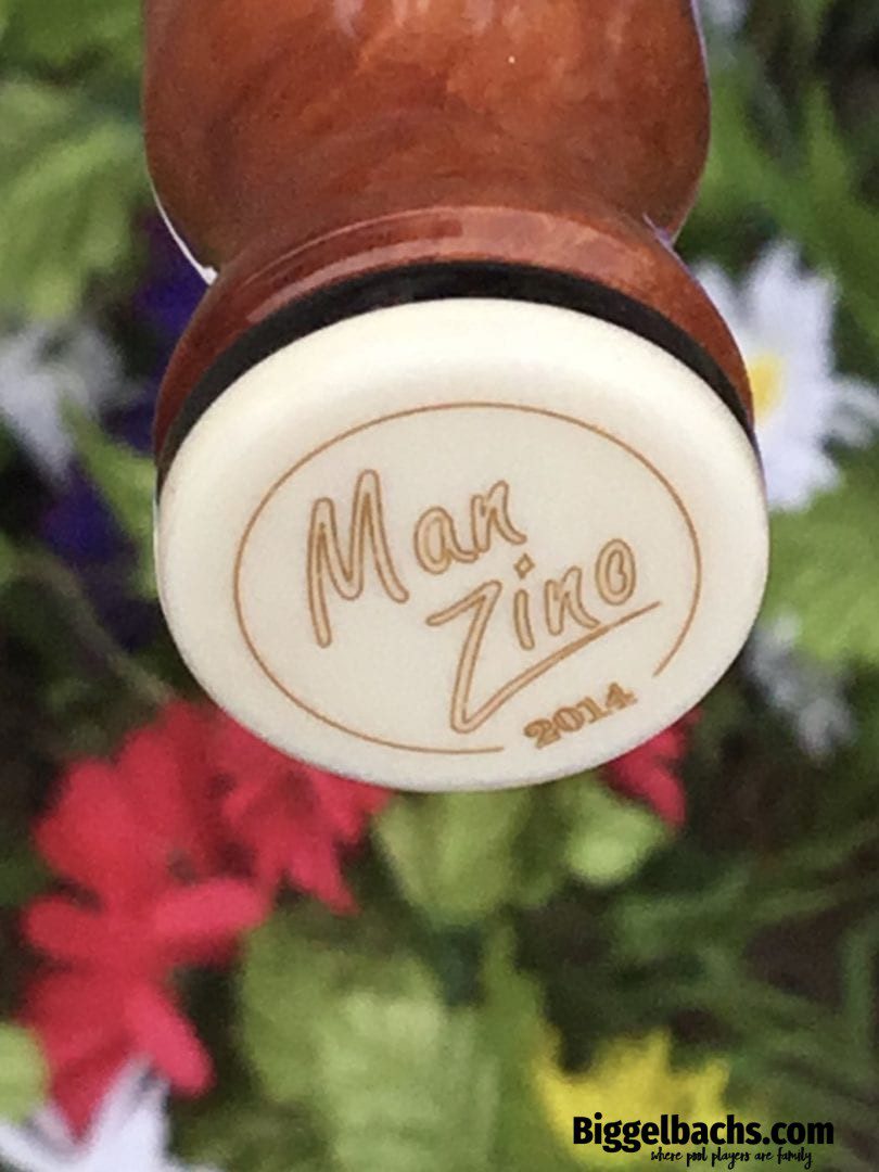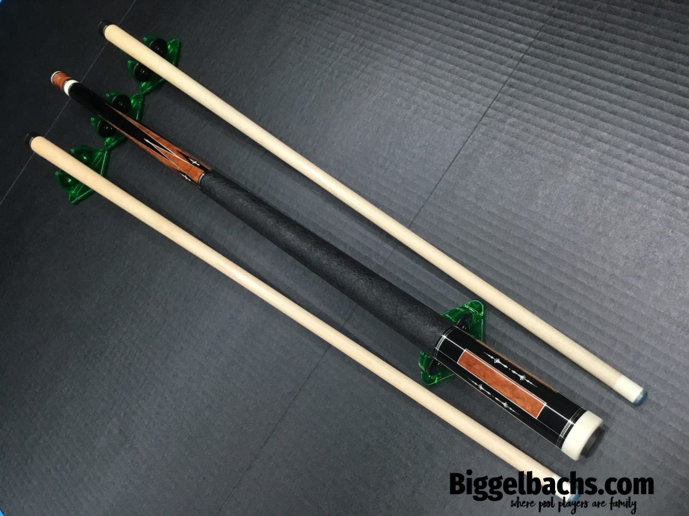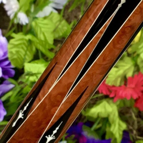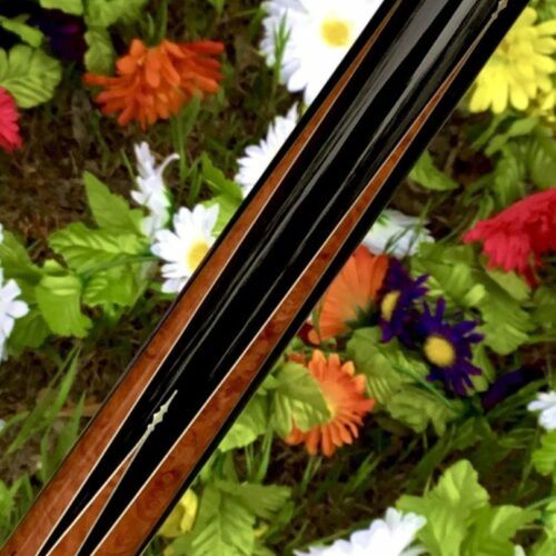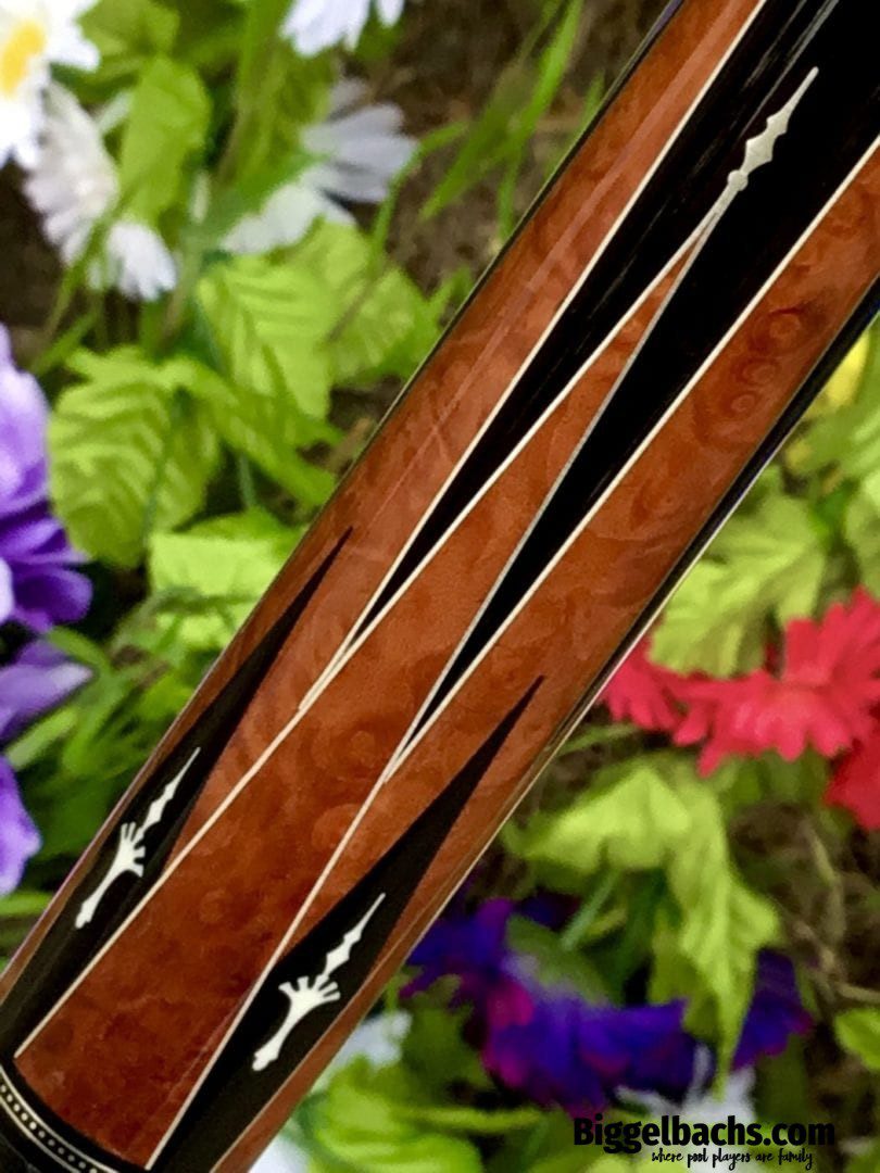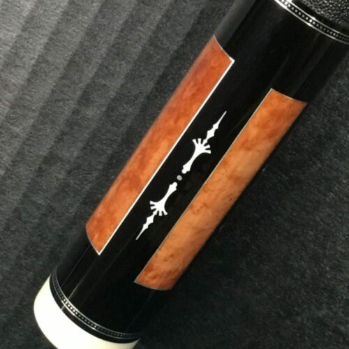 Pool cues come and go at Biggelbachs, but some stand out and say, “Look at me!” This cue offering is made by the one and only Bob Manzino. Jet black ebony with amboyna burl, silver and ivory everywhere. Special elephant ear wrap and custom joint protectors are included. This cue is an absolute monster cue.