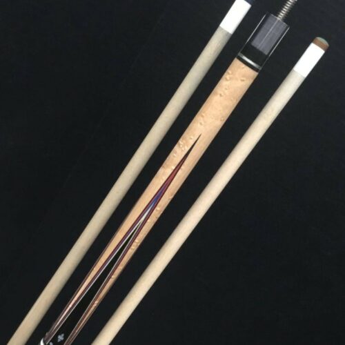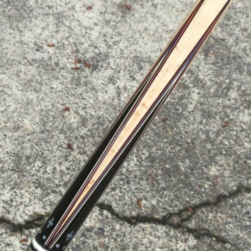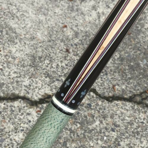 Exquisite example of a Balabushka tribute by custom cue maker Michael Morgan. This cue boasts mother of pearl inlays of diamonds and circles in a fancy butt sleeve and carried through in the veneered points as well.
