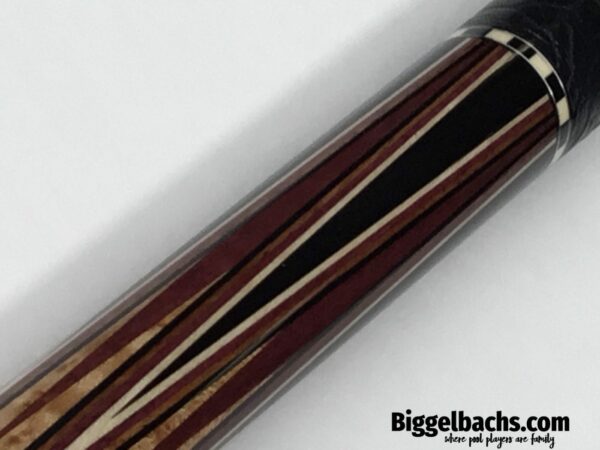 This cue is a classic build by Mike Bender. Known for his re-cut points, this monster has 25 re-cut high points and five lower points. The points are ebony, mahogany, purple heart, holly and ebony. The cue is finished out with four classes rings with a Mike bull leather wrap. This beauty is new, never chalked, and will not disappoint.