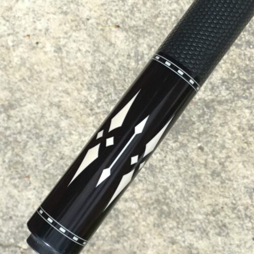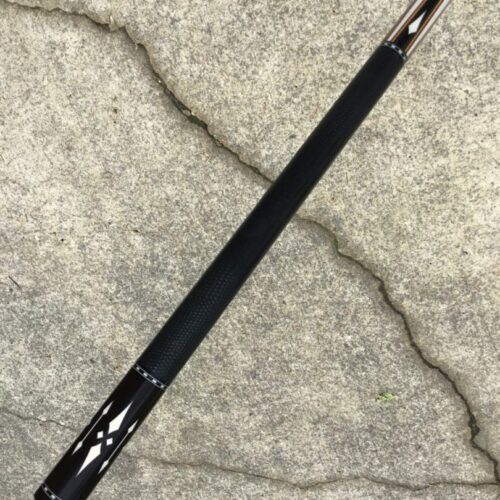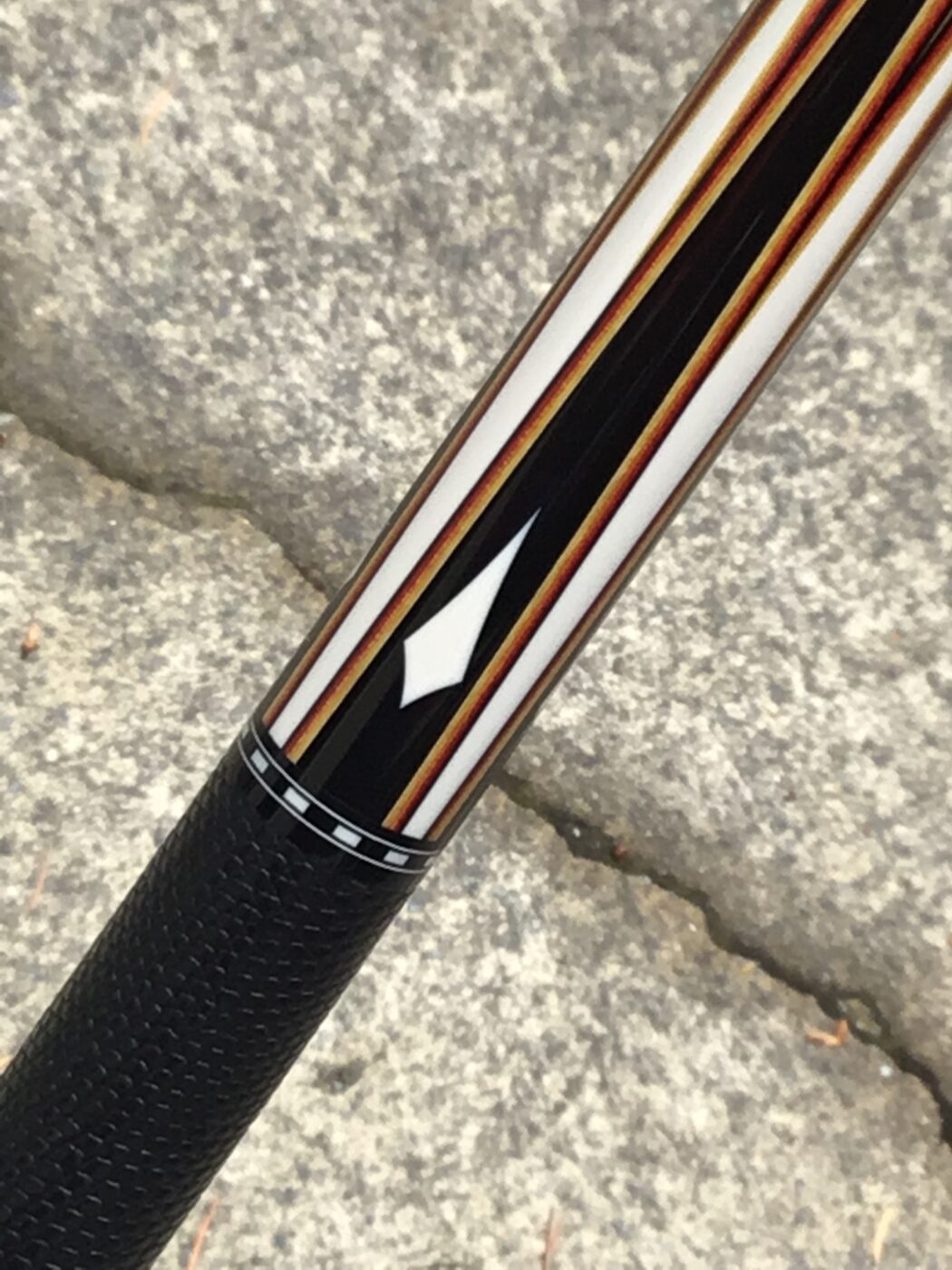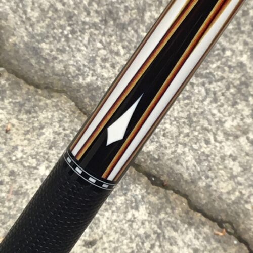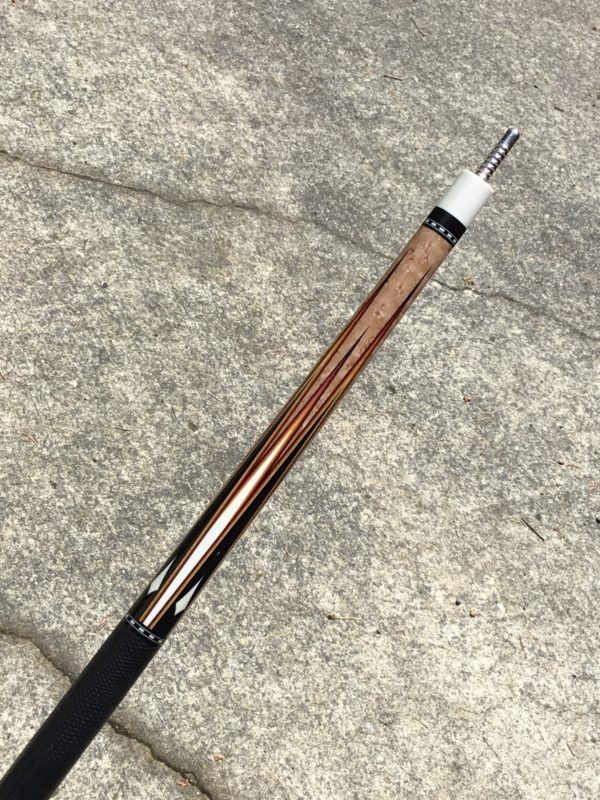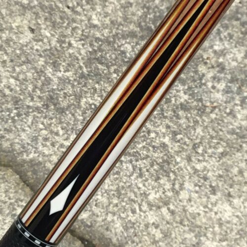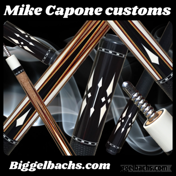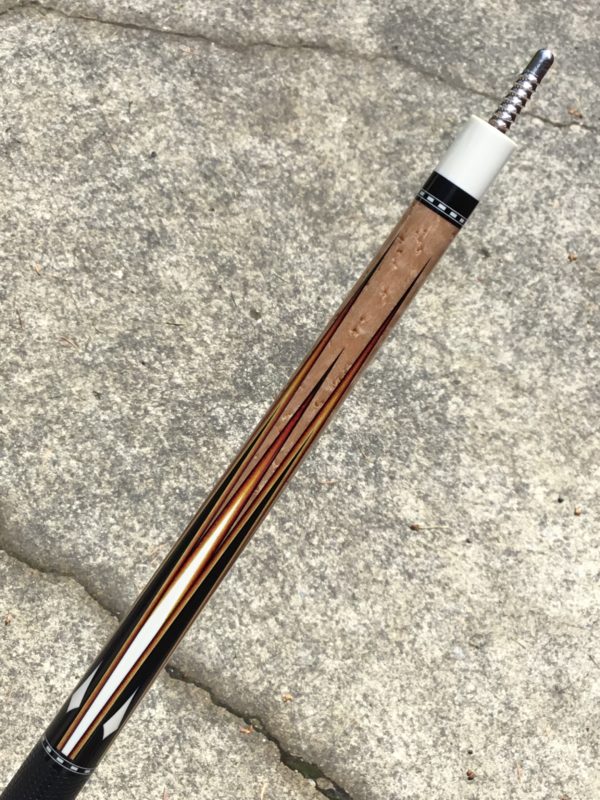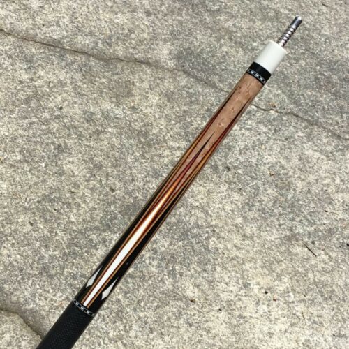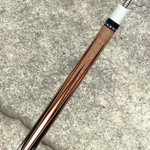 This big, sexy Capone custom cue boasts traditional veneer colors amid a canvas of ebony points and maple forearm. Ivory spearheads are inlaid into the high and sharp ebony points with an expanded artistic arrangement in the butt sleeve. Elegant joint and handle rings and a handsome lizard wrap complete this gorgeous cue.