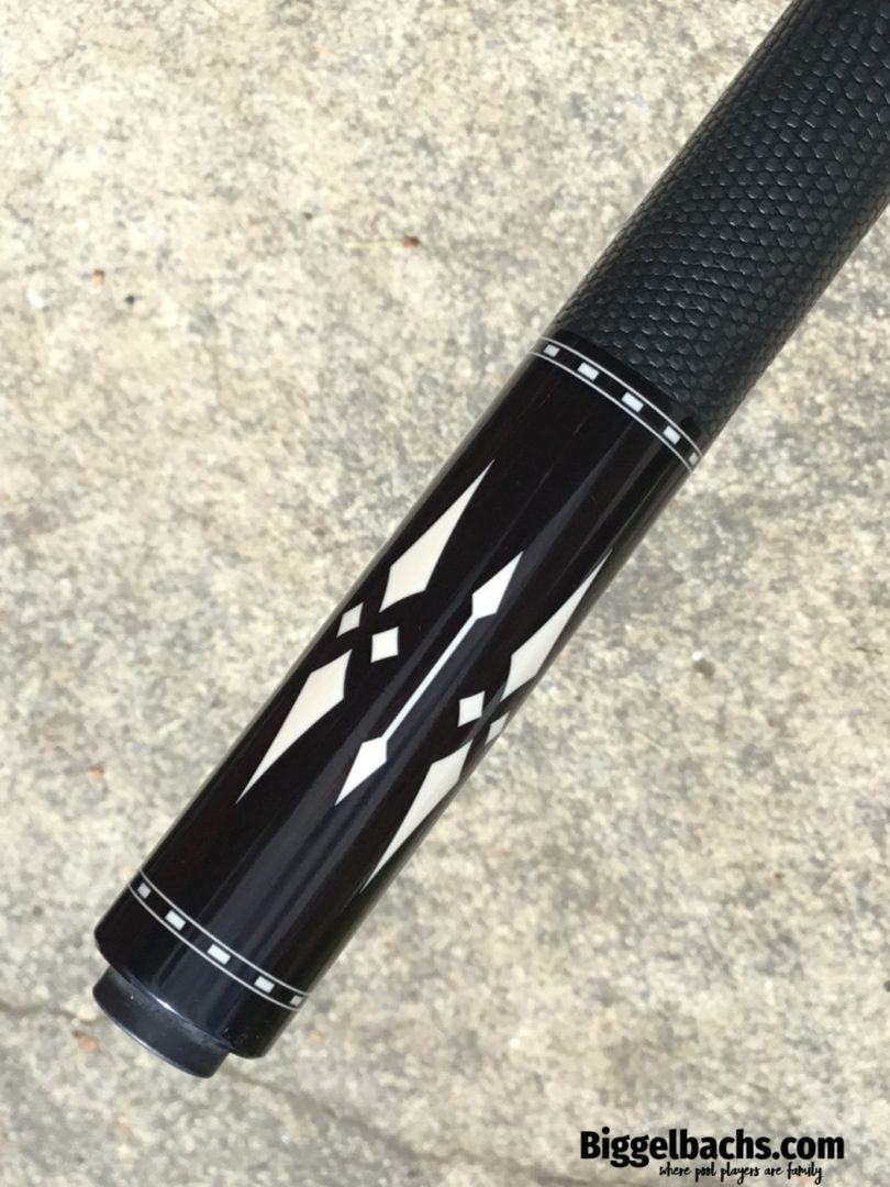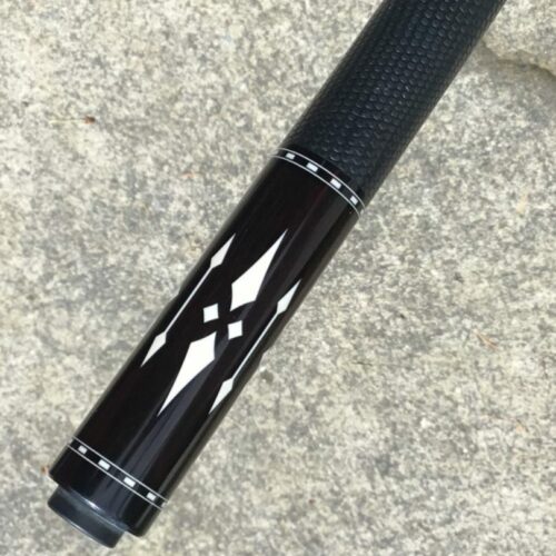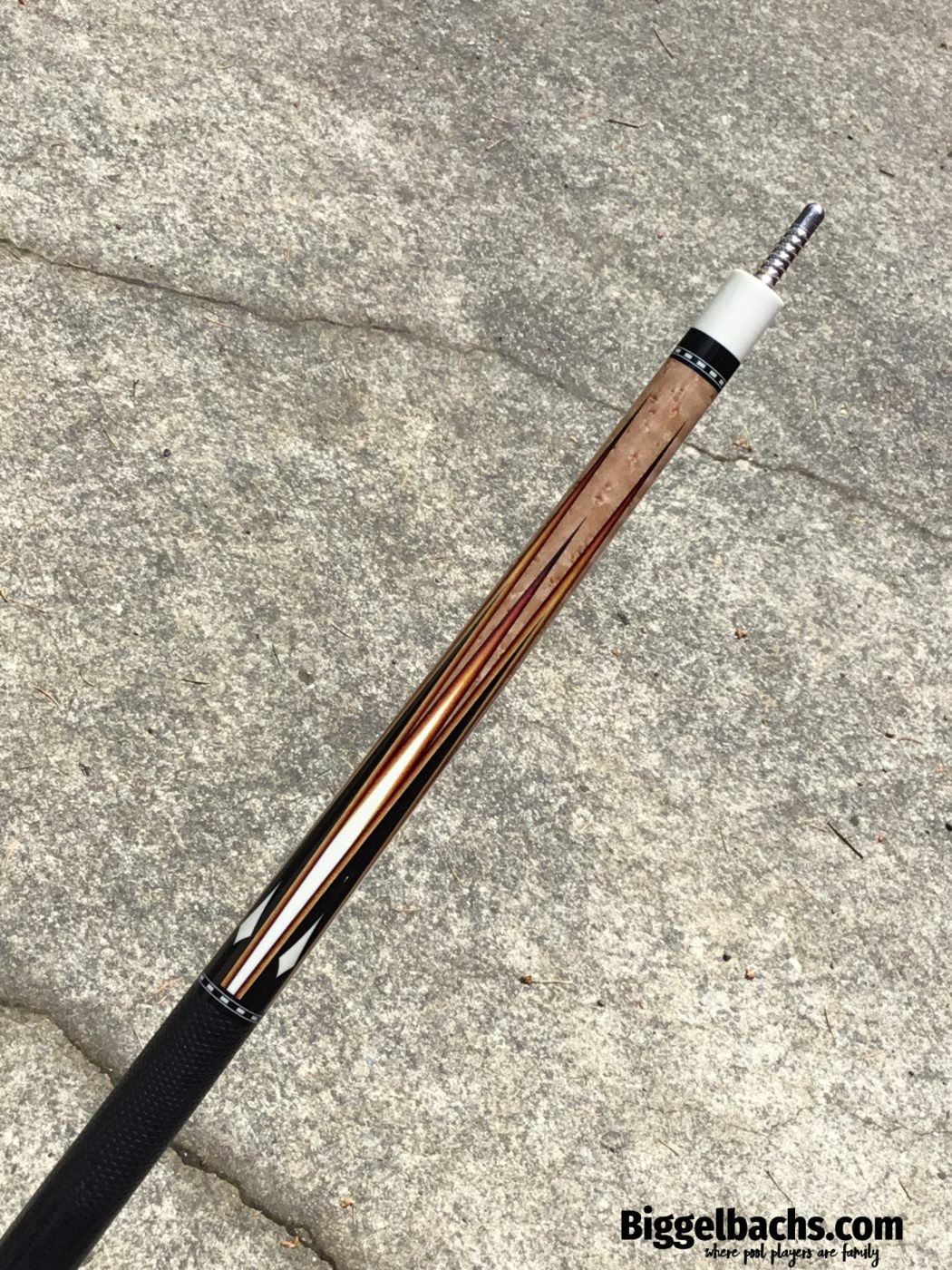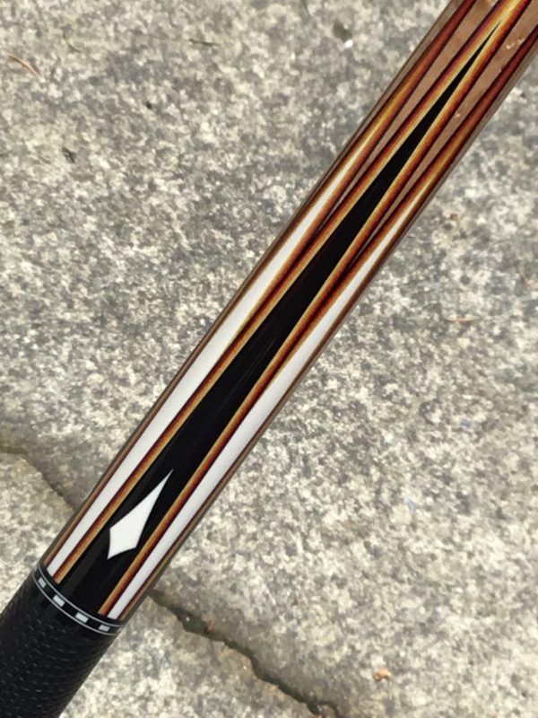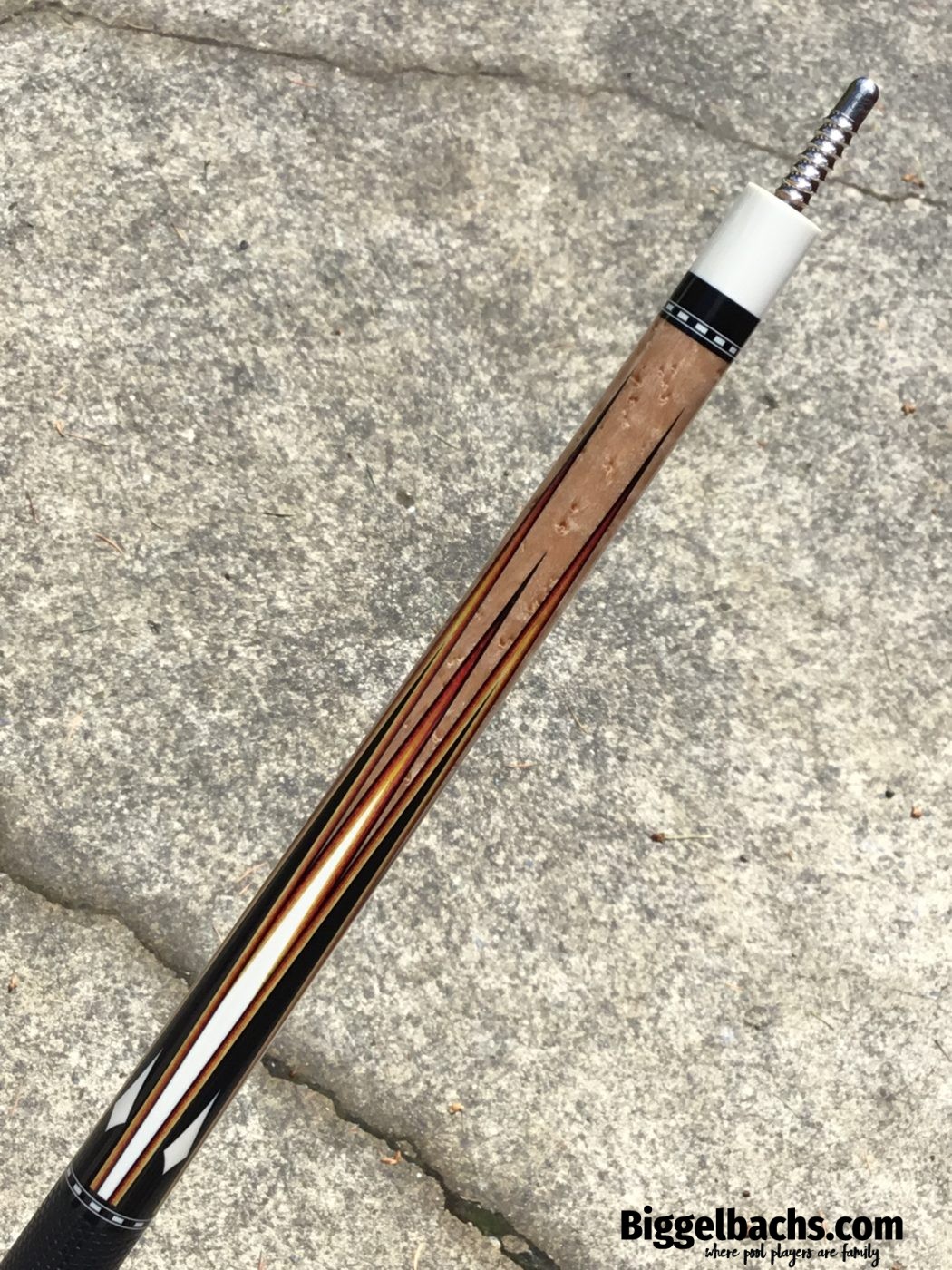 This big, sexy Capone custom cue boasts traditional veneer colors amid a canvas of ebony points and maple forearm. Ivory spearheads are inlaid into the high and sharp ebony points with an expanded artistic arrangement in the butt sleeve. Elegant joint and handle rings and a handsome lizard wrap complete this gorgeous cue.