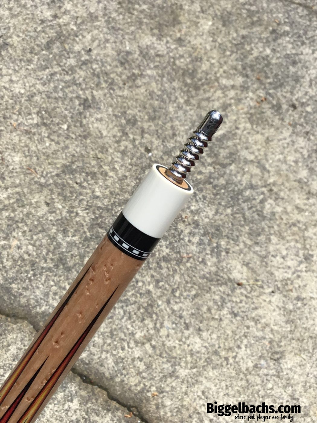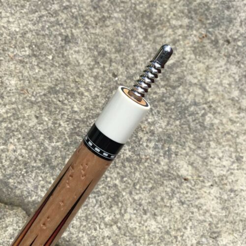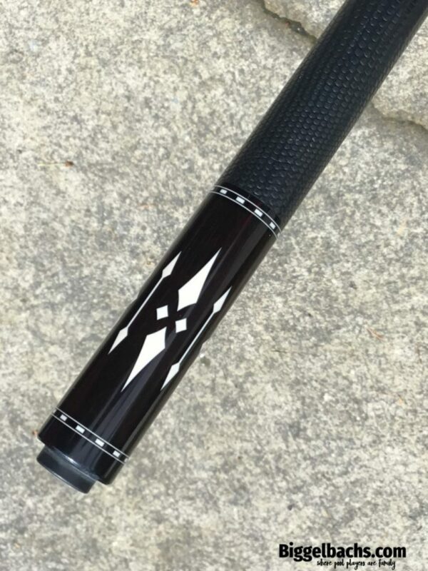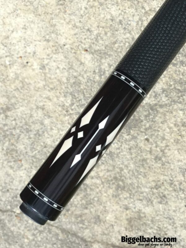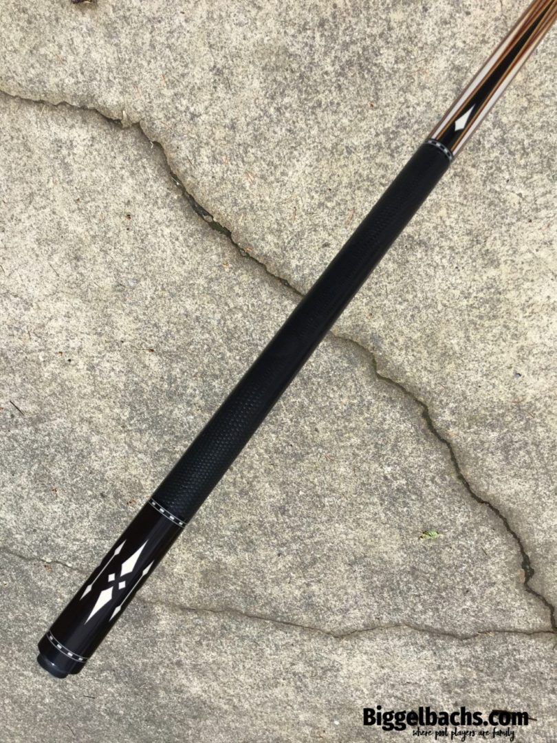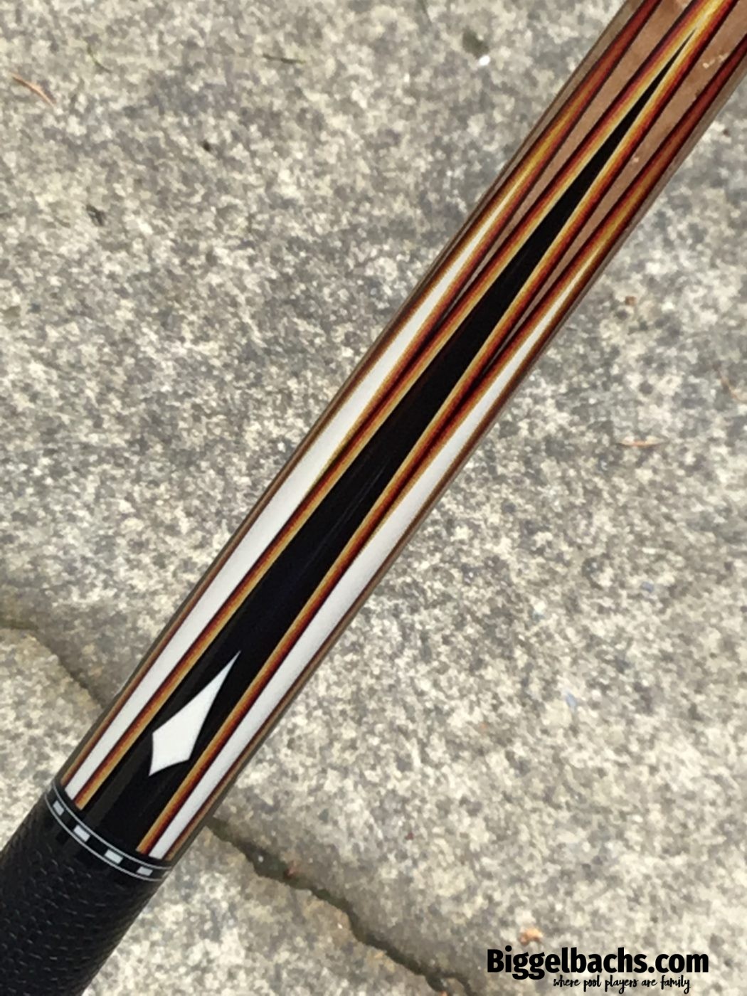 This big, sexy Capone custom cue boasts traditional veneer colors amid a canvas of ebony points and maple forearm. Ivory spearheads are inlaid into the high and sharp ebony points with an expanded artistic arrangement in the butt sleeve. Elegant joint and handle rings and a handsome lizard wrap complete this gorgeous cue.