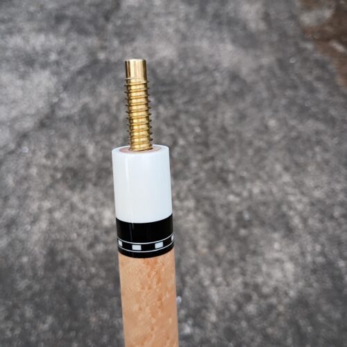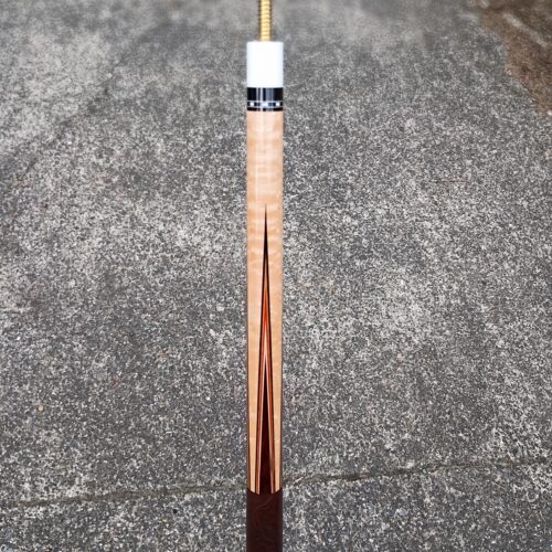 Four beautiful orange points built with cocobolo into a birdseye maple forearm. This Mike Stacey custom pool cue build is a sleek classic design.