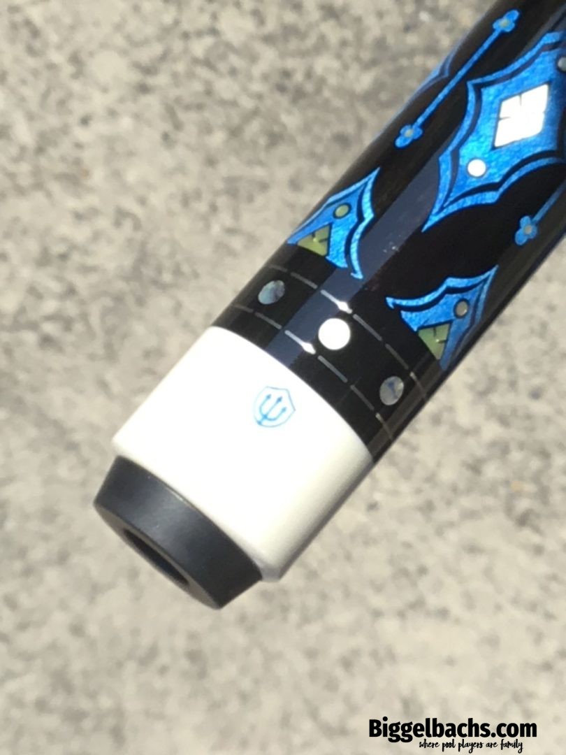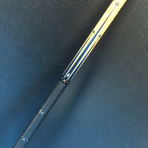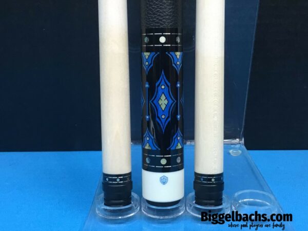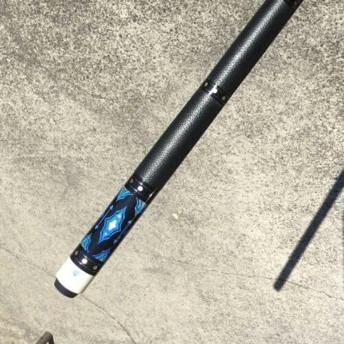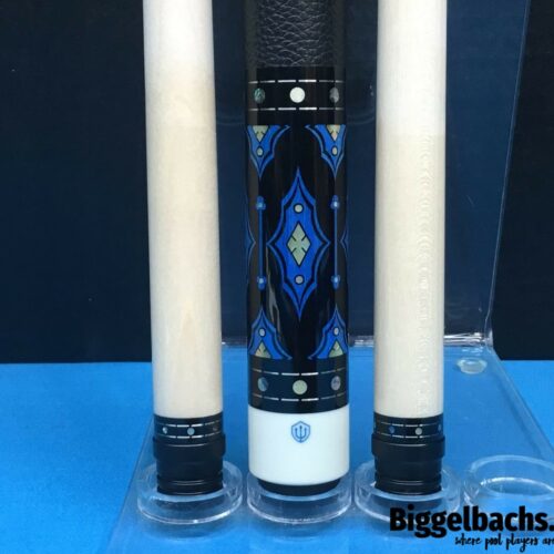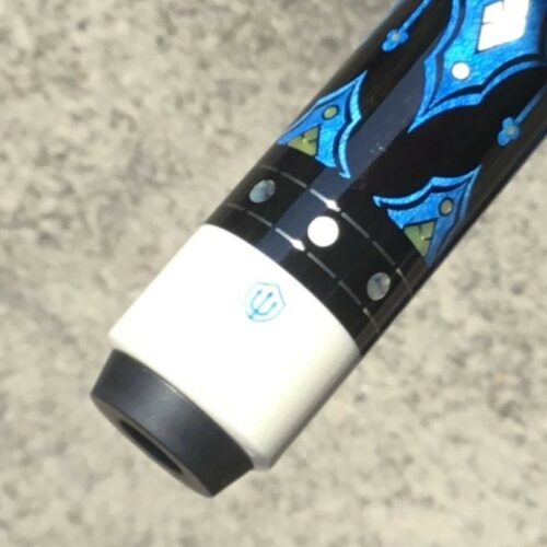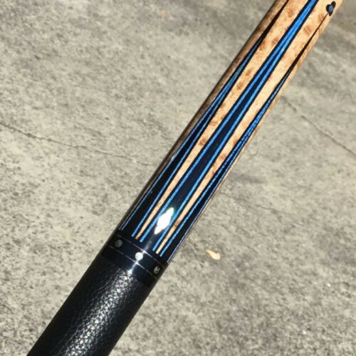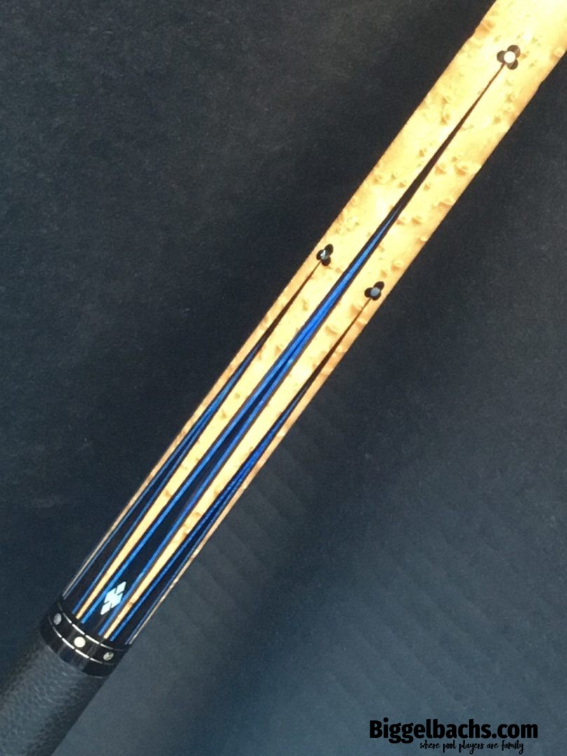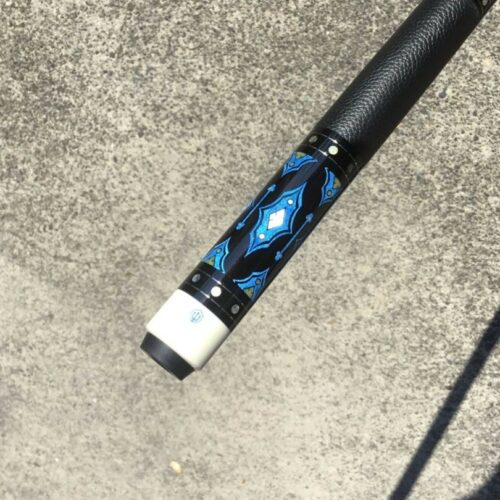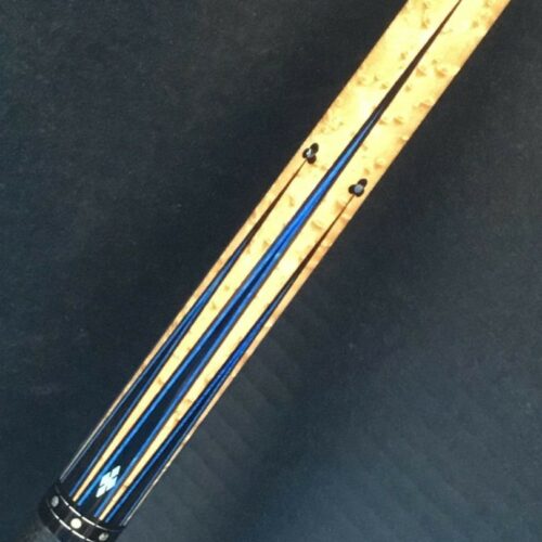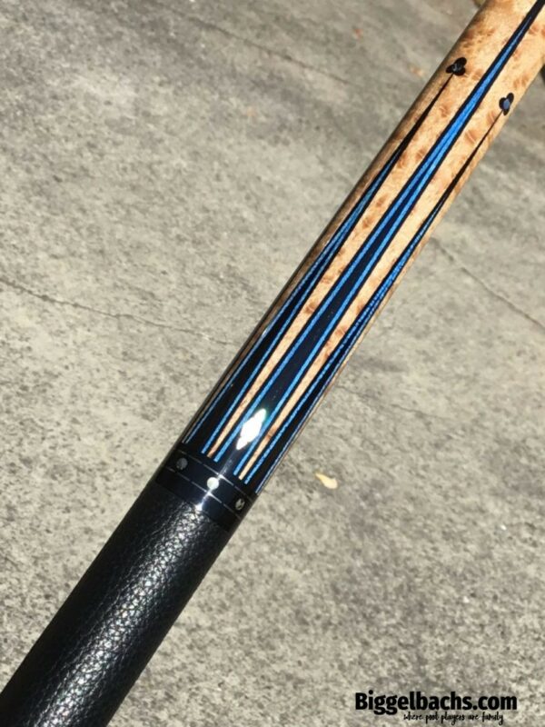 Up for grabs is this sexy North Demon Cue with accents of clover, diamonds, and blue. Eight ebony points adorn the birdie maple with a frame of blue veneers. The points are tip topped be blue clover with mother of pearl inlays. The butt sleeve expands on the design themes and the handle is a segmented leather wrap.