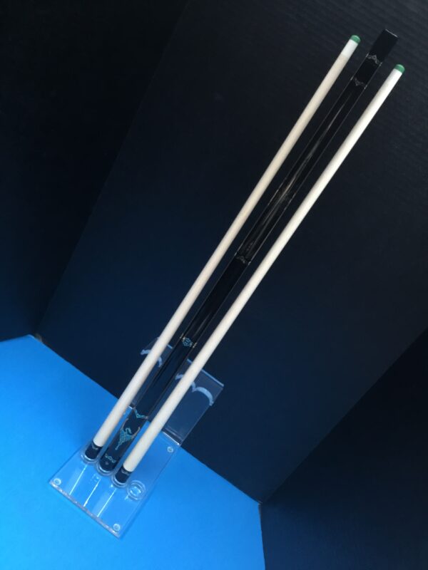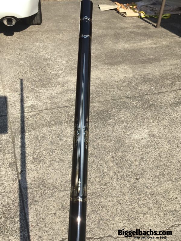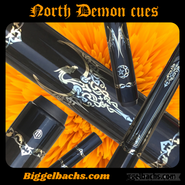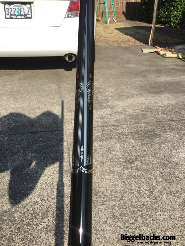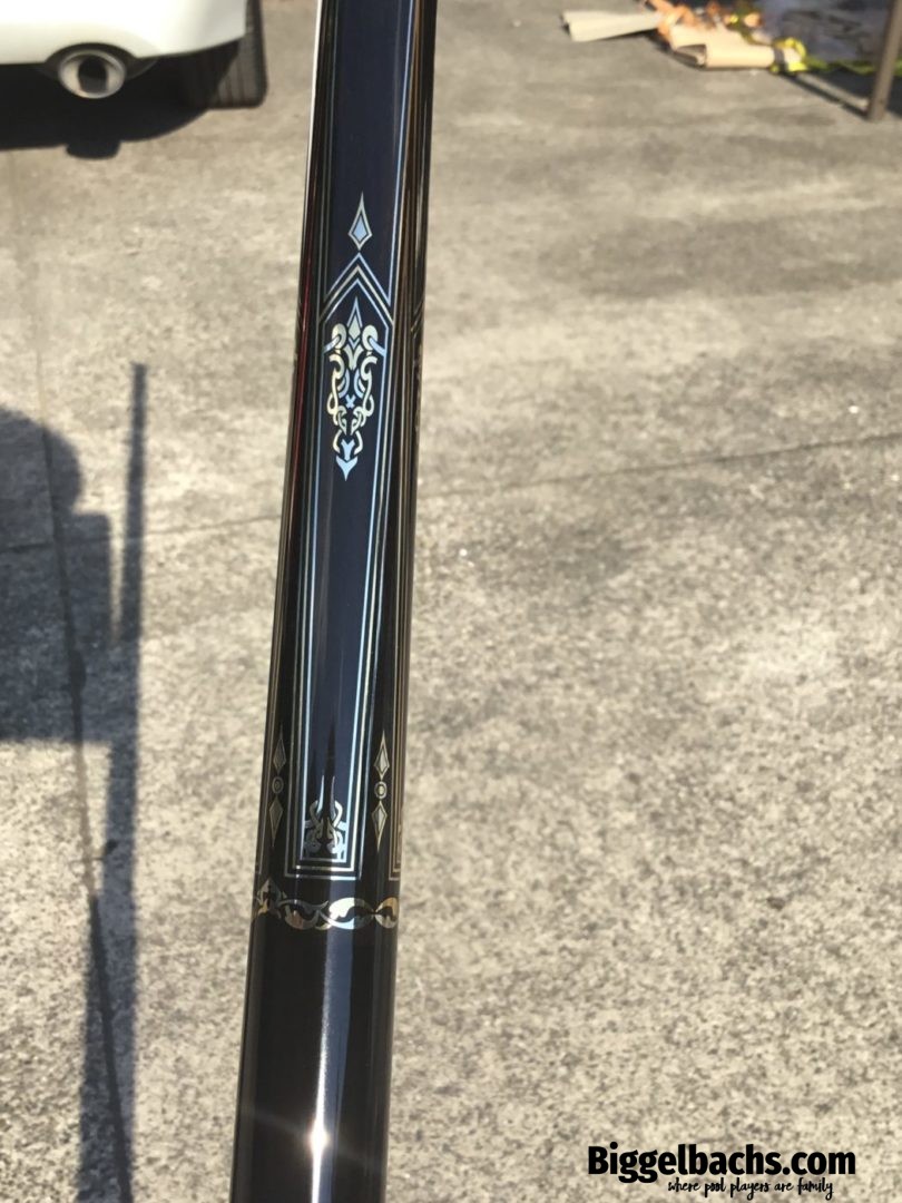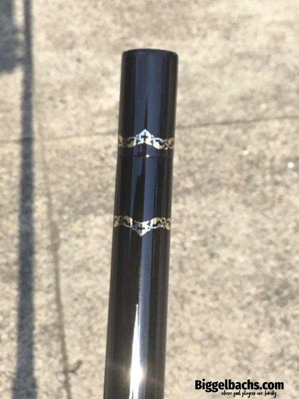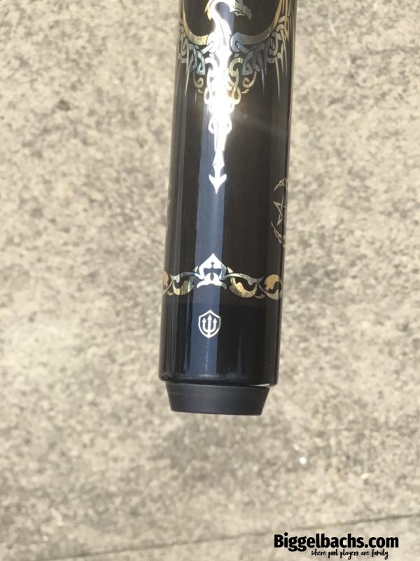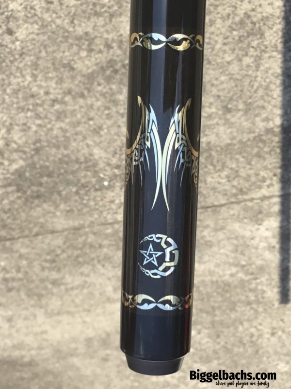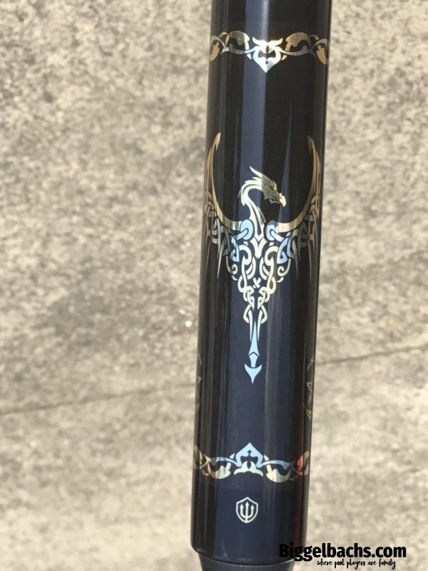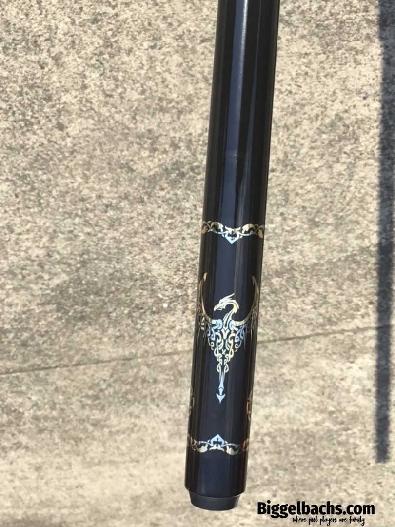 The work, detail and craftsmanship in this North Demon Dragon cue is unparalleled and its owner (could be you if you’re reading this) will be discovering new things to appreciate for years to come! There are silver, brass and silver bridged veneers on ebony. Silver and brass-outlined spearheads can be found throughout the build, along with intertwining precious metals. The cue’s namesake, The Celtic Dragon is masterfully located in the butt sleeve and looks like a Phoenix rising in the midnight sky. There are actually two dragons that connect, and we really liked not only the different feathers in the dragon’s wings, but the moon and star inlays are astonishing!